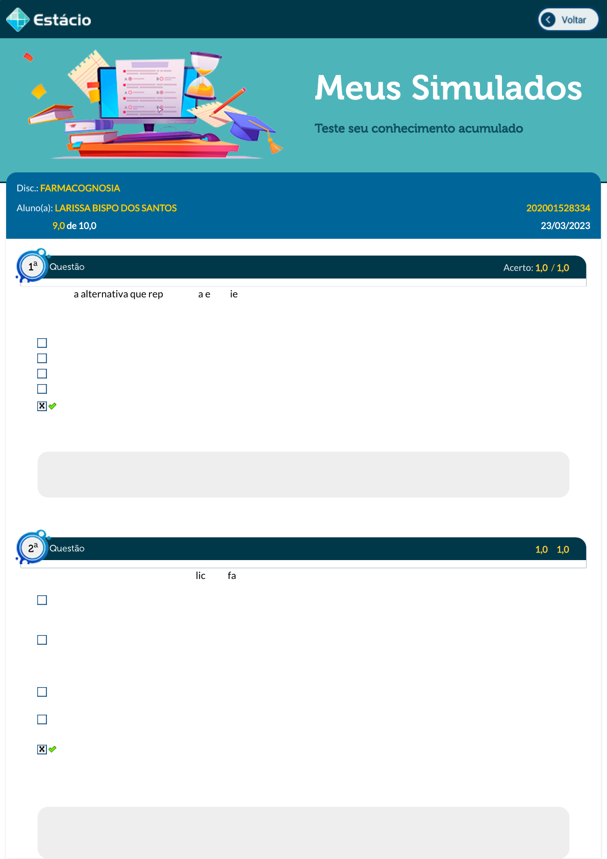 Meus Simulados Teste seu conhecimento acumulado Disc.: FARMACOGNOSIA Aluno(a): LARISSA BISPO DOS SANTOS 202001528334 Acertos: 9,0 de 10,0 23/03/2023 Acerto: 1,0 / 1,0 Marque a alternativa que represente a espécie cuja sua droga é indicada para uso interno em constipação crônica e que os principais ensaios clínicos avaliam efeito anticarcinogênico, redução do risco de aterosclerose associado à hiperlipidemia e a propriedades nutricionais. Malva sylvestris L. Micromonospora purpurea Streptomyces griseus Plantago ovata Forssk Linum usitatissimum L. Respondido em 23/03/2023 13:06:19 Explicação: A resposta correta é: Linum usitatissimum L. Acerto: 1,0 / 1,0 Em relação aos polissacarídeos de aplicação farmacêutica, marque a opção incorreta: As mucilagens, amplamente distribuídas nos vegetais, apresentam natureza mista constituída por heteropolissacarídeos ácidos e/ou neutros, substâncias fenólicas e proteínas. Elas são rígidas quando estão secas, e tornam-se pegajosas quando úmidas. Os monômeros de glicose podem gerar dois tipos de polissacarídeos amido: a amilose e amilopectina. A amilose possui uma cadeia longa de resíduos de D-glicose, com ligações glicosídicas (α1 → 4) e a amilopectina possui cadeia com ligações glicosídicas (α1 → 4), porém nos pontos de rami�cações, que ocorrem de 20 a 34 resíduos, tem ligações (α1 → 6). As gomas são carboidratos complexos produzidos por algumas plantas, sendo consideradas produtos patológicos resultantes de uma ação física sofrida pelos tecidos. O amido é um polissacarídeo de glicose empregado como emoliente, desagregante nas formulações de comprimidos, e para a obtenção química das dextrinas e de polióis. Os pró-bióticos, que são frutooligossacarídeos (FOS) contendo de 3 a 10 monossacarídeos de frutose, são usualmente encontrados ligados a uma molécula inicial de glicose e agem como as �bras não digeríveis. Respondido em 23/03/2023 13:10:08 Explicação: A resposta correta é: Os pró-bióticos, que são frutooligossacarídeos (FOS) contendo de 3 a 10 monossacarídeos de frutose, são usualmente encontrados ligados a uma molécula inicial de glicose e agem como as �bras não digeríveis. Questão1 a Questão2 a https://simulado.estacio.br/alunos/inicio.asp javascript:voltar(); Acerto: 1,0 / 1,0 Marque a opção que se re�ra a um precursor biossíntetico do acetil-CoA. Piruvato Difosfato de dimetilalila (DMAPP) Eritrose-4-fosfato Fosfoenolpiruvato L-fenilalanina Respondido em 23/03/2023 13:17:17 Explicação: A resposta correta é: Piruvato Acerto: 0,0 / 1,0 A coenzima A possui uma estrutura bem complexa, contendo unidades estruturais de origem no metabolismo primário e secundário. Em relação a unidade estrutural de adenina, assinale a alternativa que indique o tipo de metabolismo no qual ela tem origem. Metabolismo de açúcares Metabolismo de aminoácidos Metabolismo secundário Metabolismo de nucleotídeos Metabolismo de ácidos graxos Respondido em 23/03/2023 13:10:37 Explicação: A resposta correta é: Metabolismo de nucleotídeos Acerto: 1,0 / 1,0 Os óleos voláteis ou óleos essenciais têm diversas aplicações em perfumaria, na indústria de alimentos e de cosméticos, na aromaterapia e na medicina. Terapeuticamente podem ser usados como antissépticos, carminativos, estomáquicos, expectorantes etc. Para que um óleo seja volátil, ele deve ser constituído de moléculas que apresentam volatilidade acentuada. Sendo assim, quais tipos de terpenos são considerados componentes majoritários de óleos essenciais? Sequiterpenos e sesterterpenos Monoterpenos e sesterpenos Monoterpenos e sesquiterpenos Sesterpenos e tetraterpenos Sequiterpenos e triterpenos Respondido em 23/03/2023 13:10:47 Explicação: A resposta certa é: Monoterpenos e sesquiterpenos Questão3 a Questão4 a Questão5 a Acerto: 1,0 / 1,0 Dos grupos de compostos a seguir, assinale aquele que atua juntamente com as cloro�las na fotossíntese, como pigmentos antena que captam os fótons de luz e na proteção contra dano foto-oxidativo nas plantas e algas, extinguindo espécies reativas de oxigênio: Ginkgolídeos Flavonoides Carotenoides Iridoides Saponinas Respondido em 23/03/2023 13:11:12 Explicação: A resposta certa é: Carotenoides Acerto: 1,0 / 1,0 Associe a segunda coluna de acordo com os termos I a V da primeira coluna e, a seguir, assinale a alternativa com a sequência CORRETA. I . Saponinas ( ) Adstringência; complexam com proteínas e formam produtos coloridos com o cloreto férrico II . Taninos ( ) Tensoativo; índice de hemólise; índice de espuma III . Flavonoides ( ) Lactonas do ácido orto-hidroxicinâmico; reação com hidróxido de potássio (KOH) formando produtos com fluorescência esverdeada sob luz ultravioleta em comprimento de onda de 365 nm IV . Alcaloides ( ) Antioxidante; reação com cloreto de alumínio e de Shinoda resultando em produtos coloridos V . Cumarinas ( ) Padrões distintos de solubilidade de acordo com pH; reações de Dragendorff e Mayer II-I-V-IV-III III-V-IV-II-I III-V-I-II-IV II-I-V-III-IV IV-I-V-III-II Respondido em 23/03/2023 13:13:08 Explicação: A resposta correta é: II-I-V-III-IV Acerto: 1,0 / 1,0 A três amostras de extratos de plantas ricas em polifenóis são adicionadas a um pequeno volume de ácido sulfúrico concentrado. Em seguida, as amostras mudaram de cor apresentando as seguintes cores: Amostra I - Vermelho; Amostra II - Laranja; Amostra III - Amarelo. Esse teste demonstra que, nas amostras I, II e III, temos, respectivamente: �avonas, chalcona, iso�avonas. lignanas, cumarinas, taninos condensados. antocianinas, chalconas, cumarinas. chalcona, �avanona, �avonas. fenilpropanoides, cumarina, �avanona. Respondido em 23/03/2023 13:13:30 Questão6 a Questão7 a Questão8 a Explicação: A resposta correta é: chalcona, �avanona, �avonas. Acerto: 1,0 / 1,0 (IBFC -PC-RJ -Perito Criminal -Farmácia -2013) As principais