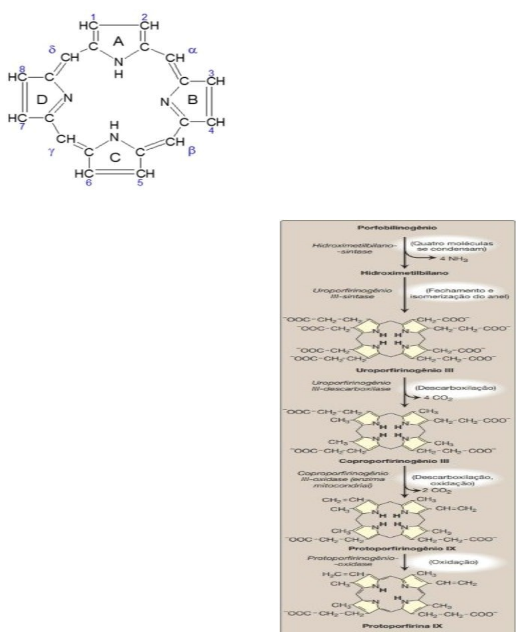NCS1 - Tutoria 1) Caracterizar a estrutura e funções das porfirinas. As porfirinas são compostos cíclicos formados pela ligação de quatro anéis pirrólicos por meio de ligações de meteno (≠HC—). Nas porfirinas de ocorrência natural, várias cadeias laterais substituem os oito átomos de hidrogênios numerados dos anéis pirrólicos. As porfirinas formam complexos com íons metálicos que se ligam ao átomo de nitrogênio de cada um dos quatro anéis pirrólicos. Os exemplos incluem as ferro porfirinas, como a heme da hemoglobina, e a porfirina clorofila contendo magnésio, o pigmento fotossintético de plantas. As hemeproteínas estão por toda parte na biologia e atuam em diversas funções, incluindo, mas não limitadas a transporte e armazenamento de oxigênio (p. ex., hemoglobina e mioglobina) e transporte de elétrons (p. ex., citocromo c e citocromo P450). As hemes são tetrapirróis, dos quais dois tipos predominam, a heme b e o heme c. Na heme c, os grupos vinílicos da heme b estão substituídos por ligações covalentes tioéter a uma apoliproteína, comumente, via resíduos cisteinil. Ao contrário da heme b, a heme c não se dissocia prontamente de sua apoliproteína. Em geral, as holoproteínas de vertebrados ligam 1 mol de heme c por mol, embora as de invertebrados possam ligar significativamente mais moléculas de heme. 2) Caracterizar o metabolismo de síntese e degradação das porfirinas. Biossíntese Ocorre no processo de diferenciação das hemácias e das células musculares, com a finalidade de produzir hemoglobina e mioglobina. O lugar da síntese é a medula óssea, baço e o fígado e é dividida em quatro etapas: 1 etapa: formação do ALA – Ácido aminolevulínico e a enzima marcapasso é a Ala-sintetase. 2 etapa: 2 ALA formando o primeiro grupo pirrólico. 3 etapa: 4 PBG formando anel. 4 etapa: Adição do ferro. A primeira reação para a síntese do grupo heme ocorre na mitocôndria pela união de uma molécula de succinil-CoA e uma molécula de glicina através da reação catalisada pela enzima aminolevulinato sintetase (ALA sintetase). Esta reação gera aminocetoadipato, que é então descarboxilado a aminolevulinato (nas plantas, algas e na maior parte das bactérias, o aminolevulinato é formado a partir do glutamato e não da glicina). Assim, esta etapa constitui o passo limitante para a biossíntese da heme. Logo, o aminolevulinato é transportado para o citosol havendo dimerização catalisada pela enzima ALA desidratase (também chamada porfibilinogênio sintetase) para produzir porfobilinogênio. Após, ocorre a condensação de quatro moléculas de porfobilinogênio para produzir o intermediário preuroporfirinogênio. A enzima que catalisa esta condensação é a porfobilinogênio desaminase (PBG desaminase), também chamada uroporfirinogênio I sintetase. O preuroporfirinogênio terá dois destinos: isômeros I e III do uroporfirinogênio. O isômero I é uma molécula não metabolizável e o isômero III se forma pela ação conjunta da uroporfirinogênio sintetase e da uroporfirinogênio III cosintase. O uroporfirinogênio é descarboxilado pela enzima uroporfirinogênio descarboxilase e no produto resultante há substituição de grupos acetil por grupos metil, passando a ser chamado de coproporfirinogênio. O coproporfirinogênio III é o intermediário mais comum na síntese do heme. O coproporfirinogênio III é transportado novamente para o interior da mitocôndria, onde dois grupos propiônicos são descarboxilados passando a grupos vinil por ação da protoporfirinogênio IX, um composto incolor. Logo, este é convertido em protoporfirina IX pela protoporfirinogênio IX oxidase. A etapa final da síntese do heme envolve a inserção de um átomo de ferro no anel tetrapirrólico catalisada pela enzima ferroquelatase. Degradação Acontece a cada 90 a 120 dias quando as hemácias circulantes são destruídas, o que acontece normalmente. As hemácias são degradadas liberando o grupo heme que, por sua vez, é degradado em cadeia globínica que é reaproveitada integralmente e a fração porfirínica que é convertida em pigmentos biliares que são excretados. A maior parte dos grupos heme provém das hemácias senescentes, que são capturadas pelo sistema retículo endotelial e sofrem degradação enzimática. No organismo humano cerca de 1 a 2 milhões de hemácias são destruídas por hora, gerando 6 gramas de hemoglobina para degradação e posterior formação de 300 miligramas de bilirrubina por dia. A hemoglobina é degradada em globina e grupos heme, onde a primeira é quebrada e transformada em aminoácidos para reutilização no organismo e, o segundo é fagocitado principalmente no fígado, baço e medula óssea, até a formação de bilirrubina. O átomo de ferro é carreado pela ferritina na circulação sanguínea e reutilizado para formação de outros grupos heme. A degradação do heme ocorre com a abertura do anel de tetrapirrol da porfirina pela ação da enzima heme oxigenase, onde há quebra da ponte metenil entre os pirróis I e II. Nesta reação ocorrem duas oxigenações e o NADPH, com seu poder redutor, libera Fe2+, CO e biliverdina, um pigmento verde. Tem sido estimado que mais de 86% do monóxido de carbono endógeno é derivado da quebra enzimática do heme, e a quantidade de monóxido de carbono respiratório tem sido usada como um mensurador indireto da produção de bilirrubina. Logo, através da enzima biliverdina redutase ocorre a formação de bilirrubina. Essa enzima adiciona um hidrogênio fornecido pelo NADPH reduzindo a dupla ligação entre os pirróis III e IV. O pigmento amarelo formado será carreado até o fígado pela albumina, onde será posteriormente conjugado e excretado. Em muitos mamíferos a atividade da biliverdina redutase hepática é suficiente para esta conversão e normalmente não há limite para a formação da bilirrubina. 3) Caracterizar a estrutura e funções 
