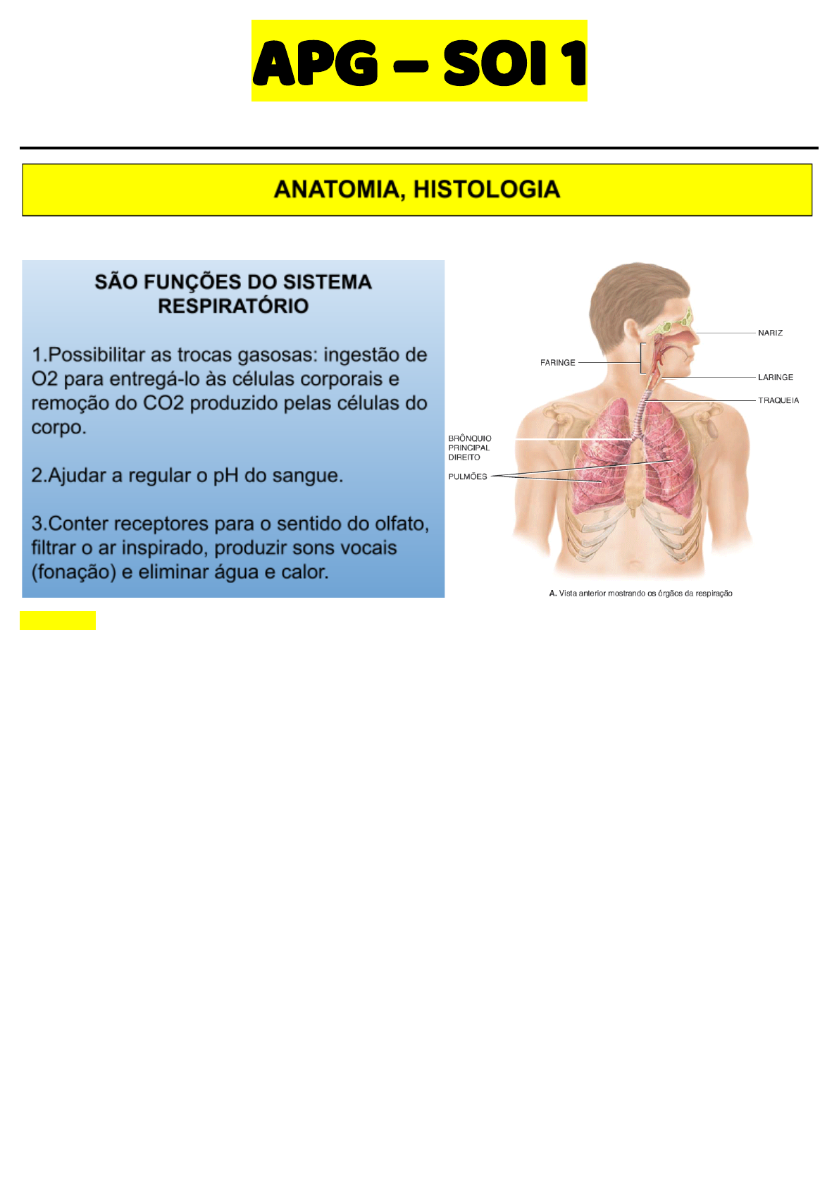 APG – SOI 1 S11P2 - SISTEMA RESPIRATÓRIO INFERIOR O sistema respiratório inferior inclui a laringe, a traqueia, os brônquios e os pulmões. LARINGE - A laringe é uma pequena conexão entre a parte laríngea da faringe e a traqueia. Encontra-se na linha média do pescoço anteriormente ao esôfago e às vértebras cervicais IV a VI (C IV a C VI). - A parede da laringe é composta por nove fragmentos de cartilagem: ➢ Três ocorrem isoladamente (cartilagem tireóidea, epiglote e cartilagem cricóidea) e ➢ três ocorrem em pares (cartilagens aritenóidea, cuneiforme e corniculada). - As cartilagens aritenóideas são as mais importantes, porque influenciam as mudanças na posição e na tensão das pregas vocais (cordas vocais verdadeiras para a fala). - A cavidade da laringe é o espaço que se estende desde a entrada da laringe até a margem inferior da cartilagem cricóidea. - A parte da cavidade da laringe acima das pregas vestibulares (cordas vocais falsas) é chamada de vestíbulo da laringe. - A parte da cavidade da laringe abaixo das pregas vocais é chamada de cavidade infraglótica. - A cartilagem tireóidea (pomo de Adão) consiste em duas lâminas fundidas de cartilagem hialina que formam a parede anterior da laringe e conferem a ela um formato triangular. Ela é encontrada tanto em homens quanto em mulheres, mas geralmente é maior no sexo masculino em decorrência da influência dos hormônios sexuais masculinos em seu crescimento durante a puberdade. - A epiglote é um segmento grande de cartilagem elástica em forma de folha em que é recoberta por epitélio. - Durante a deglutição, a faringe e a laringe se movem para cima. A elevação da faringe amplia-a para receber alimentos ou bebidas; a elevação da laringe faz com que a epiglote se mova para baixo e cubra a glote, fechando-a. A glote é composta por um par de pregas de túnica mucosa, as pregas vocais (cordas vocais verdadeiras) na laringe, e o espaço entre elas é chamado de rima da glote. - A túnica mucosa da laringe forma dois pares de pregas: um par superior chamado de pregas vestibulares (cordas vocais falsas) e um par inferior chamado de pregas vocais (cordas vocais verdadeiras). O espaço entre as pregas vestibulares é conhecido como rima do vestíbulo. - As pregas vocais são as principais estruturas envolvidas na produção da voz. Profundamente à túnica mucosa das pregas vocais, que é de epitélio escamoso estratificado não queratinizado, estão faixas de ligamentos elásticos entre as rígidas cartilagens da laringe como as cordas de uma guitarra. TRAQUEIA - A traqueia é uma via tubular para o ar com aproximadamente 12 cm de comprimento e 2,5 cm de diâmetro. - Está localizada anteriormente ao esôfago e se estende desde a laringe até a margem superior da vértebra T V, onde se divide em brônquios primários direito e esquerdo. - As camadas da parede da traqueia, da profunda à superficial, são: (1) túnica mucosa, (2) tela submucosa, (3) cartilagem hialina e (4) túnica adventícia (composta de tecido conjuntivo areolar). - A túnica mucosa da traqueia consiste em uma camada de epitélio colunar pseudoestratificado ciliado e uma camada subjacente de lâmina própria que contém fibras elásticas e reticulares. Ela oferece a mesma proteção contra poeira que a túnica que reveste a cavidade nasal e a laringe. A tela submucosa consiste em tecido conjuntivo areolar que contém glândulas seromucosas e seus ductos. - Os 16 a 20 anéis horizontais incompletos de cartilagem hialina se assemelham à letra C, estão empilhados uns sobre os outros e estão ligados por tecido conjuntivo denso, a parte aberta de cada anel de cartilagem em formato de C está voltada posteriormente em direção ao esôfago sendo cruzada por uma membrana fibromuscular. Nessa membrana estão fibras musculares lisas transversais – chamadas músculo traqueal – e tecido conjuntivo elástico, que possibilita que o diâmetro da traqueia mude sutilmente durante a inspiração e a expiração; isso é importante para manter o fluxo de ar eficiente. BRÔNQUIOS - Na margem superior da vértebra T V, a traqueia se divide em um brônquio principal direito, que vai para o pulmão direito, e um brônquio principal esquerdo, que vai para o pulmão esquerdo. - O brônquio principal direito é mais vertical, mais curto e mais largo do que o esquerdo. - Um objeto aspirado tem maior probabilidade de entrar e se alojar no brônquio principal direito do que no esquerdo. - Os brônquios principais contêm anéis incompletos de cartilagem sendo revestidos por epitélio colunar pseudoestratificado ciliado. - No ponto em que a traqueia se divide em brônquios principais direito e esquerdo, uma crista interna chamada de carina é formada por uma projeção posterior e um pouco inferior da última cartilagem traqueal. A túnica mucosa da carina é uma das áreas mais sensíveis de toda a laringe e traqueia para desencadear um reflexo da tosse. O alargamento e distorção da carina é um sinal grave, pois geralmente indica um carcinoma dos linfonodos ao redor da região onde a traqueia se divide. - Ao entrar nos pulmões, o brônquio principal se divide formando brônquios menores: - Esta extensa ramificação da traqueia até os bronquíolos terminais se assemelha a uma árvore invertida e é comumente chamada árvore bronquial. - A túnica mucosa na árvore bronquial muda de epitélio colunar pseudoestratificado ciliado nos brônquios principais, brônquios lobares e brônquios segmentares para epitélio colunar simples ciliado com algumas células caliciformes nos bronquíolos maiores, para principalmente epitélio cúbico simples ciliado sem células caliciformes nos bronquíolos menores, para principalmente epitélio cúbico simples não ciliado nos bronquíolos terminais. - À medida que a quantidade de cartilagem diminui, a quantidade de músculo liso aumenta. O músculo liso circunda o lúmen em faixas espiraladas e ajuda a man