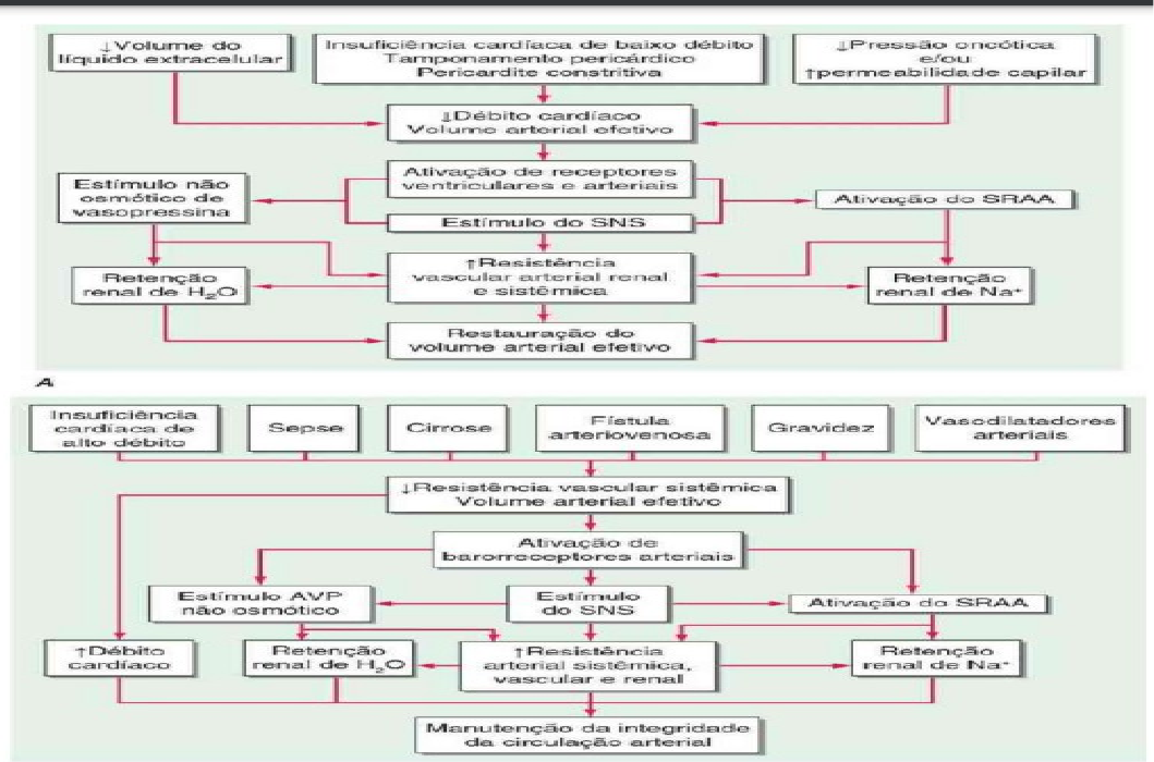 EDEMA NA CLINICA Cerca de 2/3 da agua corporal lesta em nível intracelular, enquanto 1/3 é extracelular. Cerca de um quarto dessa ultima parte esta no pasma, enquanto no restante esta no liquido intersticial. O edema representa um excesso de líquido intersticial que fica evidente clinicamente. Há trocas constante de fluidos entre 2 compartimento de liquido extracelular, a pressão hidrostática dentro dos capilares e a pressão coloidal oncótica no liquido intersticial promovendo movimento de agua e solutos passíveis de difusão do plasma para interstício. Esse movimento é mais proeminente na origem arterial dos capilares, caindo progressivamente com o declínio da pressão intercapilar e com elevação na pressão oncótica em direção a extremidade venular. O liquido retorna do espaço itinerante para o sistema vascular em grande parte através do sistema linfática. Essa troca de liquido normalmente são equilibradas de maneiras que os volumes dos compartimento intravascular e intersticial permaneça constante. Porem, ocorre um movimento resultante de fluidos do espaço intravascular para o interstício que pode ser responsável pelo desenvolvimento de edema, sob as seguintes condições: (1) aumento da opressão hidrostática intracapilar (2) drenagem linfática inadequada (3) redução na pressão oncótica do plasma (4) dano a barreia endotelial capilar (5) aumento na pressão oncotica no espaço intersticial Em diversos tipos de edema, o volume efetivo de sangue arterial ,um parâmetro que represente o preenchimento da arvore arterial e que efetivamente perfunde os tecidos, encontra-se reduzido. O preenchimento insuficiente da arvore arterial pode ser causa pro redução de debito cárdico e/ou resistência vascular sistema, pro acúmulo de sangue nas veia esplâncnicas (como na cirosse) e por hipoalbunemia. Como consequência desse preenchimento insuficiente, é acionada uma série de reposta fisiológicas voltadas para reestabelecer o volume arterial efetivo normal. Um elemento-chave dessa resposta é retenção renal de sódio e, portanto, de agua, resultando, dessa foram, o volume arterial efeito, porem algumas vezes, também ocasionando ou intensificando edema · Condições clinicas nas quase uma redução no debito cardíaco (A) na resistência vascular sistêmica (B) levam a um menor prenchimento arterial, resultando em ativação neuro-humoral e retenção renal de sódio e agua. Além de ativar o eixo neuro- humoral, o estimulo adrenérgico causa vasoconstritor renal e aumenta o transporte de sódio e líquido pelo epitélio do túbulo proximal O fluxo sanguíneo renal diminui, caracterizo do estado nas quais o volume de sangue arterial efetivo esta reduzido, é traduzido pela células justa glomerular renais (células mioepitelial perto da arteríola aferente) em um sinal para maior liberação renina, Da que age no seu substrato, o angiotensinogenio, que ajuda a libera angiotensina, convertida em angiotensina, que possui propriedades vasoconstritores generalizadas, particularmente na arteríolas eferente renais. Esse efeito faz a pressão hidrostatica nos capilares peitubulares, enquanto a fração de filtração eleva a pressão coloidal osmótica desse vasos, aumenta reabsorção de sal e agua nos túbulos próximas , assim como no ramo ascendente da alça de henle. O sistema renina-angiotesina-aldosterona atua tanto como um sistema hormonal quanto um sistema parácrino. Sua ativação leva a retenção de sódio e agua, e portanto, contribui para formação de edema. O bloqueio da conversão de angiotensina I em 2 e bloqueio receptor de A2 aumenta de excreção de sódio e agua e reduzem vários tipos de edema, · A angiotensina 2 que penetra na circulação sistema e estimula produção de aldosterona pela zona glomerular do córtex suprarrenal. Aldosterona, por sua vez, aumenta a reabsorção de soído e excreção de potássio, favorecendo edema, o bloqueio da da ação da aldeonas como (espirolactona ou eplrenona – antagonista da aldosterona) ou amilorida (bloqueio de canais epiteliais de sódio) em geral induz uma diurese nos estado edematosos A secreção de arginina-vasopressina pela gandula hipofisária posterior ocorre em reposta a aumento da concentração osmolar intracelular e, mediante a estimulação dos receptores V2, a AVP aumenta a reabsorção de agua livre nos túbulos distais e ductos coletos dos rins, aumentado, assim a agua corporal total. AVP circulante fica elevados em muitos paciente com insuficiência cárdica, secundariamente a um estímulo não osmótico associada o a diminuição do volume arterial efetiva e complacência reduzida do átrio esquerdo, tais paciente deixa de apresentar a redução normal de AVP com uma redução da osmolalidade, contribuindo ara a formação de edema e hiponatremia. A endotelina 1-, é um peptídeo vasoconstritor liberado pela células endoteliais. Sal contra no plasma é elevado em paciente com IC grave e contribui para vasoconstrição renal, retenção de sódio e edema. Peptídeos natriuréticos – a distensão atrial causa liberação de peptídeo natriurético atrial (ANP). Um peptídeo natriurético (ore-pro hormônio peptídeo natriurético cerebral- BNP) intimamente relacionado é armazenada primariamente nos micóticos ventriculares e é liberados quando a pressão diastólica ventricular aumenta. A ANP e BNP (que é derivada de seu percurso) liberados se ligam a receptores A natriuréticos que causam: (1) excreção de sódio e agua pelo aumento da taxa de filtração glomerular, inibindo a reabsorção de sódio e agua no túbulo próxima e inibindo a liberação de renina e aldosterona (2) dilatação de arteríolas e vênulas antagonizando as ações vasoconstritoras da angiotensina e estimulando simpática. Portanto, níveis elevados de peptídeo natriuréticos possuem capacidade de contrapor a retenção de sódio nos estados hipervolêmicos e edematoso. Emboás os níveis circu