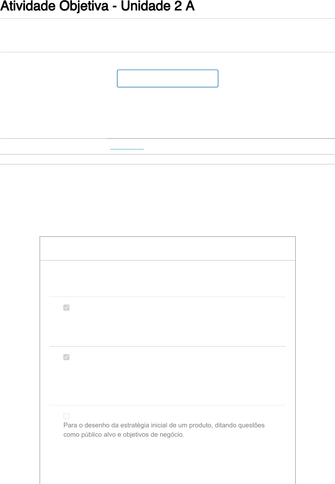 28/03/2023, 16:54 Atividade Objetiva - Unidade 2 A: 03 - Design de Experiência do Usuário (2022) https://pucminas.instructure.com/courses/90050/quizzes/298974 1/2 Atividade Objetiva - Unidade 2 A Entrega Sem prazo Pontos 4 Perguntas 2 Limite de tempo Nenhum Tentativas permitidas Sem limite Histórico de tentativas Tentativa Tempo Pontuação MAIS RECENTE Tentativa 1 2 minutos 4 de 4 As respostas corretas estão ocultas. Pontuação desta tentativa: 4 de 4 Enviado 28 mar em 16:54 Esta tentativa levou 2 minutos. Fazer o teste novamente 2 / 2 ptsPergunta 1 Para quê servem as Heurísticas de Nielsen? Para análise da qualidade da interação durante ou mesmo após a criação de uma interface. Para que a navegação em uma interface seja mais intuitiva e prazerosa, de maneira ao usuário não precisar de um “manual de instruções” para entender como ela funciona. Para o desenho da estratégia inicial de um produto, ditando questões como público alvo e objetivos de negócio. https://pucminas.instructure.com/courses/90050/quizzes/298974/history?version=1 https://pucminas.instructure.com/courses/90050/quizzes/298974/take?user_id=166255 28/03/2023, 16:54 Atividade Objetiva - Unidade 2 A: 03 - Design de Experiência do Usuário (2022) https://pucminas.instructure.com/courses/90050/quizzes/298974 2/2 Para a definição estritamente dos aspectos visuais de uma interface. 2 / 2 ptsPergunta 2 Quais das opções a seguir são Heurísticas de Nielsen? Projeto e estética minimalista. Visibilidade do estado de sistema. Consistência e padrão. Liberdade e controle para o usuário. Pontuação do teste: 4 de 4