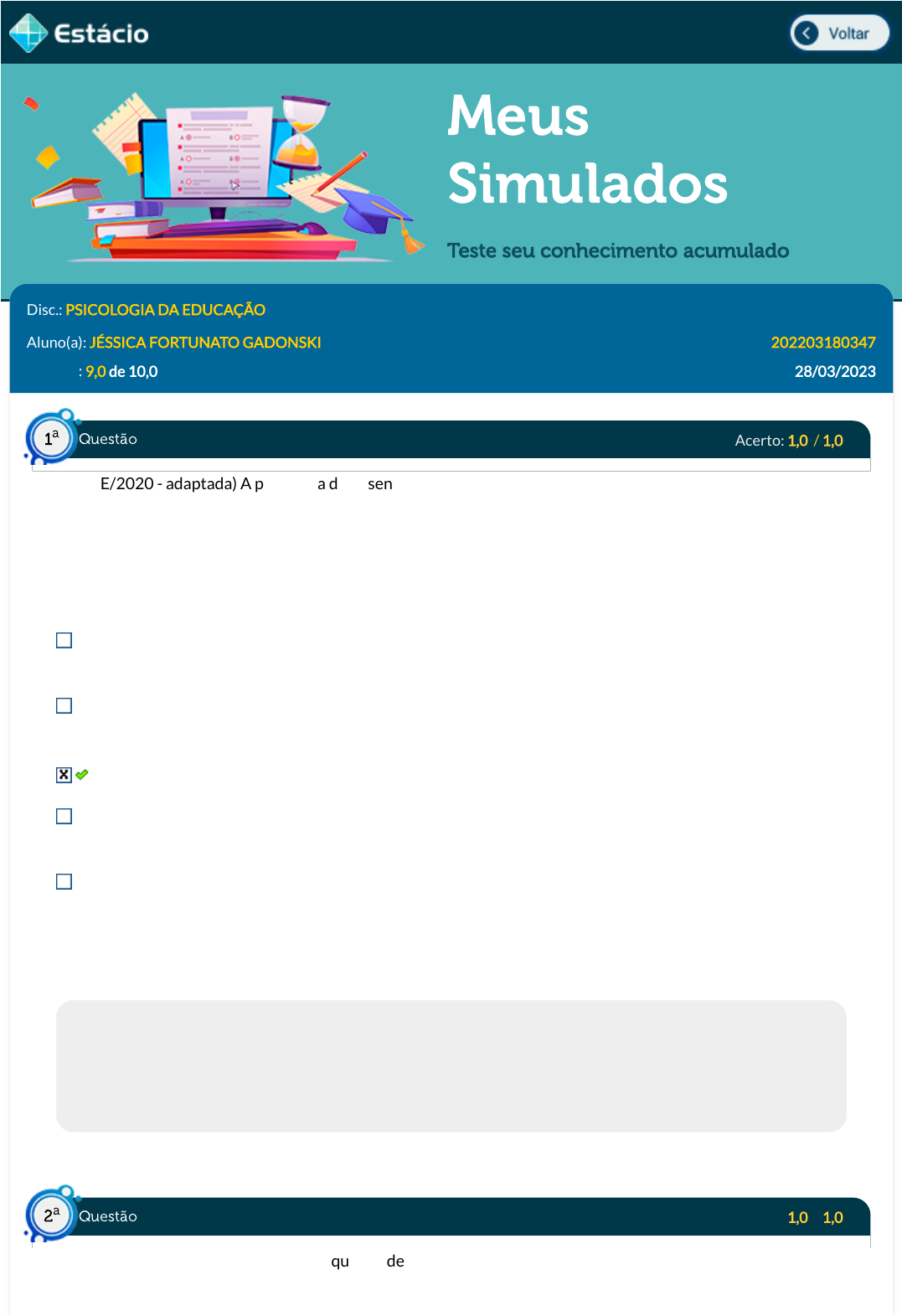 28/03/2023 20:54 Estácio: Alunos https://simulado.estacio.br/bdq_simulados_avaliacao_parcial_resultado.asp?cod_hist_prova=305027427&cod_prova=6117278928&f_cod_disc= 1/6 Meus Simulados Teste seu conhecimento acumulado Disc.: PSICOLOGIA DA EDUCAÇÃO Aluno(a): JÉSSICA FORTUNATO GADONSKI 202203180347 Acertos: 9,0 de 10,0 28/03/2023 Acerto: 1,0 / 1,0 (IBADE/2020 - adaptada) A psicologia do desenvolvimento é responsável pelo estudo do ser humano ao longo de todas as suas fases de vida. Ela estuda como a cognição se desenvolve e como o comportamento muda durante a fase de crescimento. Nesta questão falaremos de seis teorias sobre o desenvolvimento humano: a Gestalt, a Psicanálise, o Behaviorismo, a Psicologia Cognitiva, Piaget e Vygotsky, pois seus pensamentos são fundamentais para explicarmos os avanços que ocorreram na psicologia do desenvolvimento. Assinale a alternativa que apresenta corretamente autor e pensamento. Behavoristas - o desenvolvimento está baseado em estruturas de origem biológica que aprendemos a usar à medida que crescemos. Portanto, não haveria um "desenvolvimento" no aspecto da gênesis e estágios evolutivos, apenas a descoberta progressiva das capacidades do cérebro. Vygotsky - o desenvolvimento somente é entendido com os diferentes tipos de aprendizagem que são considerados neste contexto. A criança nasce com uma série de respostas incondicionais e inatas, que através da experiência vão associando a outros estímulos. Psicologia Cognitivista - sugere que o indivíduo é um produtor de informação que constrói representações internas, a partir das representações externas (como é o mundo). Gestalt - em relação ao desenvolvimento humano, só acontece porque a criança precisa satisfazer uma série de necessidades em cada estágio evolutivo. Portanto, classi�ca o desenvolvimento em etapas de acordo com a forma como a satisfação dessa série de necessidades é estabelecida. Psicánalise - o desenvolvimento era inseparável do ambiente social, uma vez que a cultura e a sociedade transmitem formas de comportamento e de organização do conhecimento. Claro, não é um processo de copiar e colar, a criança constrói a sua realidade através do que a sociedade lhe mostra. Respondido em 28/03/2023 20:44:39 Explicação: A Psicologia Cognitiva pode ser de�nida como uma área de conhecimento que analisa os processos internos implicados na forma como as pessoas extraem sentido do ambiente - interno (�siológico) e externo (cultura) - e decidem quais ações são apropriadas. Estuda a atividade e a estrutura do cérebro para compreender a cognição e o comportamento humano. Acerto: 1,0 / 1,0 (IBFC/2022 - adaptada) "A abordagem que um designer tem da hierarquia visual re�ete seu estilo pessoal, sua metodologia e sua experiência, bem como o zeitgeist (o espírito de sua época). A hierarquia pode ser simples ou complexa, rigorosa ou �exível, rasa ou extremamente articulada. Qualquer que seja a abordagem, a hierarquia Questão1 a Questão2 a https://simulado.estacio.br/alunos/inicio.asp javascript:voltar(); 28/03/2023 20:54 Estácio: Alunos https://simulado.estacio.br/bdq_simulados_avaliacao_parcial_resultado.asp?cod_hist_prova=305027427&cod_prova=6117278928&f_cod_disc= 2/6 emprega marcas claras de separação para sinalizar a mudança de um nível para outro." (LUPTON, Ellen. Novos Fundamentos do design. São Paulo: Cosac Naify, 2008. p. 115) Sobre o exposto, analise as a�rmativas abaixo: I. É possível aplicar a Psicologia desconsiderando o Zeitgeist. II. A ciência se desenvolve a partir de pressupostos já existentes. III. As ciências se desenvolvem a partir de recursos tecnológicos, por isso a ciência se desenvolveu a partir do início do século XXI, com a revolução tecnológica. Marque a alternativa que apresenta a(s) a�rmativa(s) correta(s). II II, III I, II, III I, II I Respondido em 28/03/2023 20:45:46 Explicação: A a�rmativa I está incorreta pois não conseguimos estudar Psicologia desconsiderando o Zeitgeist. A a�rmativa III está incorreta pois uma ciência não se desenvolve no vácuo, ela usa a tecnologia disponível de sua época e tenta dar respostas às perguntas que são feitas. Essas perguntas (as indagações dos �lósofos e dos cientistas) consideram o acúmulo de conhecimento até aquele ponto da história. Acerto: 1,0 / 1,0 (CESPE / CEBRASPE/2010 - adaptada) O registro de pensamentos automáticos é apropriado para o primeiro momento do processo terapêutico, em que paciente e terapeuta vão em conjunto identi�car esses pensamentos perturbadores e tem uma clara visão da realidade e das situações desencadeadoras do mal funcionamento psicológico. Sobre a terapia cognitiva-comportamental, analise as a�rmativas a seguir. I. O mal humor e o comportamento agressivo são frutos de pensamentos disfuncionais. II. Pensamentos automáticos são produtos de seu sistema de crenças. III. Transtornos psicológicos são frutos de desordens psíquicas. Marque a alternativa que apresenta a(s) a�rmativa(s) correta(s). II I, II, III I, II II, III I Respondido em 28/03/2023 20:46:52 Explicação: Todas as a�rmativas estão corretas, pois o modelo clínico cognitivo propõe que pensamentos disfuncionais in�uenciam o humor e o comportamento; os pensamentos automáticos são ideias que invadem sua mente e são um produto de seu sistema de crenças; as distorções cognitivas e pensamentos automáticos disfuncionais estão na base de desordens psíquicas, são usual a todos os transtornos psicológicos. Questão3 a 28/03/2023 20:54 Estácio: Alunos https://simulado.estacio.br/bdq_simulados_avaliacao_parcial_resultado.asp?cod_hist_prova=305027427&cod_prova=6117278928&f_cod_disc= 3/6 Acerto: 1,0 / 1,0 Para ensinar uma criança a andar de bicicleta, segundo a visão do Comportamentalismo de Skinner, o mais correto é: Mostrar vídeos de outras crianças andando de bicicleta, explicando cada movimento que elas f