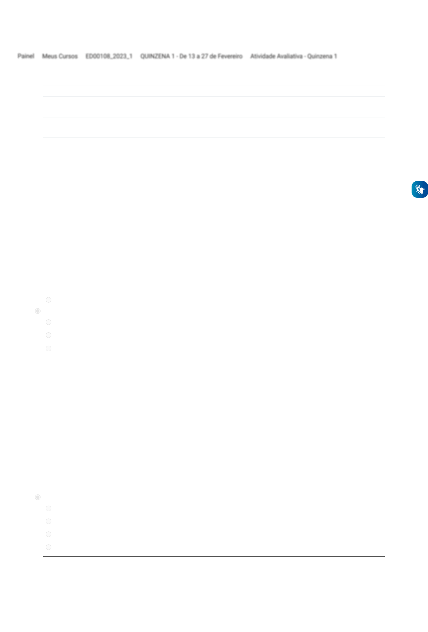 29/03/2023, 10:38 Atividade Avaliativa - Quinzena 1: Revisão da tentativa https://salaonline.usf.edu.br/mod/quiz/review.php?attempt=1677038&cmid=377484 1/4 PainelPainel / Meus CursosMeus Cursos / ED00108_2023_1ED00108_2023_1 / QUINZENA 1 - De 13 a 27 de FevereiroQUINZENA 1 - De 13 a 27 de Fevereiro / Atividade Avaliativa - Quinzena 1Atividade Avaliativa - Quinzena 1 Iniciado em Terça-feira, 14 Fev 2023, 17:48 Estado Finalizada Concluída em Terça-feira, 14 Fev 2023, 19:09 Tempo empregado 1 hora 20 minutos Avaliar 0,80 de um máximo de 1,00(80%) Questão 1 Questão 2 A fase pré-cientí�ca da psicologia �cou marcada pelo total descaso com as pessoas que possuem problemas psicológicos, tendo sido retratada em inúmeras obras de arte da época; Com base no trecho acima, analise as a�rmativas que seguem com base na fase pré-cientí�ca: ( ) Os considerados “loucos” eram condenados e retirados das ruas e colocados em prisões como presos comuns. ( ) Os considerados “loucos” eram condenados e retirados das ruas e colocados nas Santas Casas de Misericórdia. ( ) A concepção de loucura depende das normas e dos costumes da sociedade vigente. ( ) Conceituar uma pessoa como “louca” era completamente proibida na fase pré-cientí�ca. ( ) A concepção de loucura surgiu antes da fase cientí�ca da psicologia. A sequência correta, de verdadeiro (V) ou falso (F), de cima para baixo, é: Escolha uma opção: a. F, F, V, F, V. b. F, V, V, V, F. c. F, V, V, F, V. d. V, F, F, F, V. e. F, V, F, V, F. A Psicologia enquanto ciência se desenvolve pela união de várias linhas de pensamento teórico, que podem colocar o enfoque nas ciências biológicas ou nas experiências psicodinâmicas. Com base no trecho acima, analise as a�rmativas que seguem: I. A psicologia do desenvolvimento é um exemplo de enfoque nas experiências psicodinâmicas. II. A psicologia do desenvolvimento estuda o crescimento físico e mental dos seres humanos. III. A psicologia �siológica é um exemplo de enfoque nas ciências biológicas. IV. A psicologia �siológica analisa a natureza biológica dos pensamentos e das emoções humanas. É correto o que se a�rma em: Escolha uma opção: a. II, III e IV. b. I e II. c. I, II e III. d. II e III. e. III e IV. https://salaonline.usf.edu.br/my https://salaonline.usf.edu.br/course/view.php?id=10033 https://salaonline.usf.edu.br/course/view.php?id=10033#section-4 https://salaonline.usf.edu.br/mod/quiz/view.php?id=377484 29/03/2023, 10:38 Atividade Avaliativa - Quinzena 1: Revisão da tentativa https://salaonline.usf.edu.br/mod/quiz/review.php?attempt=1677038&cmid=377484 2/4 Questão 3 Questão 4 Questão 5 No �m do século ________, os estudiosos da psicologia começaram a aplicar o ___________________. Foi nesse momento que a psicologia se tornou disciplina formal e cientí�ca, apartada da ___________________. O _____________ da ciência psicologia enquanto ciência é a mente humana. As palavras que complementam corretamente as lacunas da sentença acima são: Escolha uma opção: a. XIX, método teórico, �loso�a e objeto. b. XIX, método cientí�co, direito e único campo de estudo. c. XX, método teórico, direito e objeto. d. XIX, método cientí�co, �loso�a e objeto. e. XX, método teórico, direito e único campo de estudo. Muitos são os estudos que tentam delimitar e de�nir a psicologia enquanto ciência, ao passo que esta consiste no pensamento cientí�co e estruturado que possui objeto determinado. Com base no trecho acima, analise as a�rmativas que seguem: I. O surgimento da psicologia como ciência ocorreu em laboratório, em torno das experimentações envolvendo o funcionamento mental dito “normal”. II. A psicologia enquanto ciência teve o seu marco inicial em estudos teóricos, com análises do comportamento considerado desviante. III. Até meados do século XIX, existia a chamada fase pré-cientí�ca da psicologia, que não prestava qualquer forma de assistência especí�ca aos doentes mentais. IV. O surgimento da psicologia enquanto ciência ocorreu no século XX, com o estudo dos impactos das duas guerras mundiais na mente humana. É correto o que se a�rma em: Escolha uma opção: a. I e III. b. II e III. c. I e IV. d. I e II. e. II e IV. A psicologia jurídica é responsável pela aplicação dos conhecimentos da Psicologia ao campo jurídico. Por essa razão, é possível considerar a psicologia jurídica como um ramo da ciência Psicologia. Considerando os seus conhecimentos, assinale a alternativa correta que apresenta o objeto da Psicologia enquanto ciência: Escolha uma opção: a. Experiências coletivas. b. Mente humana e seus desdobramentos. c. Psiquismo do criminoso. d. Estudo dos transtornos psicológicos. e. Entendimento do crime. 29/03/2023, 10:38 Atividade Avaliativa - Quinzena 1: Revisão da tentativa https://salaonline.usf.edu.br/mod/quiz/review.php?attempt=1677038&cmid=377484 3/4 Questão 6 Questão 7 Questão 8 A psicologia �siológica é uma das vertentes de estudo da psicologia e tem por objeto a natureza biológica dos pensamentos e das emoções humanas; distingue-se da psicologia do desenvolvimento, que está mais voltada para a análise do crescimento físico e mental do ser humano. Com base no trecho acima, analise as a�rmativas a seguir: I. A neuropsiquiatria estuda o cérebro e suas relações com o comportamento humano. II. A psicologia experimental é o eixo da psicologia do desenvolvimento que se debruça sobre os processos biológicos básicos. III. O impacto da hereditariedade nos traços do comportamento é objeto de estudo da genética comportamental. IV. A investigação da bioquímica do corpo é objeto de estudo da psicobiologia. É correto o que se a�rma em: Escolha uma opção: a. I, II e III. b. II, III e IV. c. II e III. d. III e IV. e. I e II. Wilhelm Wundt foi o precursor da psicologia enquanto ciência. O teórico desenvolveu o conceito de paralelismo p