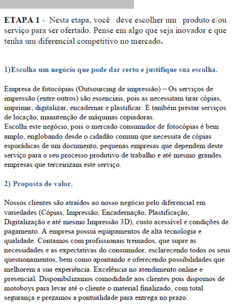 PROJETO INTEGRADOR – MÓDULO I PROJETO INTEGRADOR – MÓDULO II ETAPA 4 Nesta etapa, você deve apresentar o protótipo do seu produto e/ou serviço: 1. Descreva e apresente um protótipo. A ideia da Imprex é ser muito mais que simplesmente uma empresa de impressão padrão. É ser um ambiente familiar e descontraído, no qual possa alcançar e prestar suporte a todos os níveis de público, desde o estudante ao profissional (pessoas jurídicas), oferecendo uma variedade de produtos, com foco principal na tecnologia, bem-estar, e satisfação de nossos clientes. 2. Insira uma imagem, uma foto ou um vídeo do protótipo do seu negócio (por exemplo, você pode enviar fotos de uma maquete demonstrando a empresa; uma história em quadrinhos para demonstrar como será o serviço oferecido etc.). Brinquedoteca Sala de impressões normais e 3D / Cópias / Encadernações Banheiros Sala de Projetos Diretoria Sala de Reunião LAN House Recepção / Sala de Espera