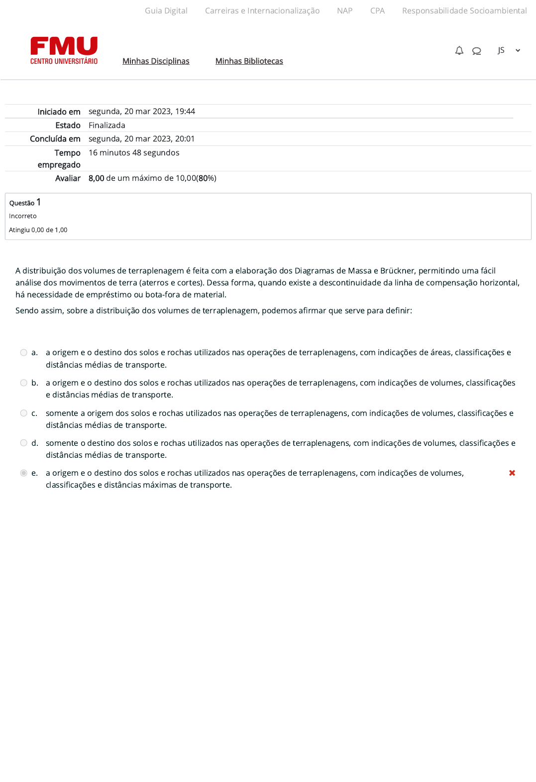 20/03/2023, 20:01 Atividade 3 (A3): Revisão da tentativa https://ambienteacademico.com.br/mod/quiz/review.php?attempt=1859262&cmid=770028 1/6 Iniciado em segunda, 20 mar 2023, 19:44 Estado Finalizada Concluída em segunda, 20 mar 2023, 20:01 Tempo empregado 16 minutos 48 segundos Avaliar 8,00 de um máximo de 10,00(80%) Questão 1 Incorreto Atingiu 0,00 de 1,00 A distribuição dos volumes de terraplenagem é feita com a elaboração dos Diagramas de Massa e Brückner, permitindo uma fácil análise dos movimentos de terra (aterros e cortes). Dessa forma, quando existe a descontinuidade da linha de compensação horizontal, há necessidade de empréstimo ou bota-fora de material. Sendo assim, sobre a distribuição dos volumes de terraplenagem, podemos a�rmar que serve para de�nir: a. a origem e o destino dos solos e rochas utilizados nas operações de terraplenagens, com indicações de áreas, classi�cações e distâncias médias de transporte. b. a origem e o destino dos solos e rochas utilizados nas operações de terraplenagens, com indicações de volumes, classi�cações e distâncias médias de transporte. c. somente a origem dos solos e rochas utilizados nas operações de terraplenagens, com indicações de volumes, classi�cações e distâncias médias de transporte. d. somente o destino dos solos e rochas utilizados nas operações de terraplenagens, com indicações de volumes, classi�cações e distâncias médias de transporte. e. a origem e o destino dos solos e rochas utilizados nas operações de terraplenagens, com indicações de volumes, classi�cações e distâncias máximas de transporte. Guia Digital Carreiras e Internacionalização NAP CPA Responsabilidade Socioambiental Minhas Disciplinas Minhas Bibliotecas JS https://codely-fmu-content.s3.amazonaws.com/Moodle/GuiaDigital/Guia+digital/index.html https://carreiras.fmu.br/ https://codely-fmu-content.s3.amazonaws.com/Moodle/NAP/inicial/nap/fmu/index.html https://codely-fmu-content.s3.amazonaws.com/Moodle/CPA/landing_CPA/index.html https://portal.fmu.br/sustentabilidade https://ambienteacademico.com.br/ https://ambienteacademico.com.br/ https://ambienteacademico.com.br/course/view.php?id=236 20/03/2023, 20:01 Atividade 3 (A3): Revisão da tentativa https://ambienteacademico.com.br/mod/quiz/review.php?attempt=1859262&cmid=770028 2/6 Questão 2 Correto Atingiu 1,00 de 1,00 As distâncias de transporte são calculadas por meio dos centros de massa (CM). Isto é, o CM é o lugar onde é aplicada a força de peso de todos os volumes que serão escavados e transportados. Com estas informações e para conhecimento especí�co, é de extrema importância saber os signi�cados das siglas da equação . Assim sendo, assinale a alternativa que corresponde ao devido signi�cado da equação. a. b. c. d. e. Guia Digital Carreiras e Internacionalização NAP CPA Responsabilidade Socioambiental Minhas Disciplinas Minhas Bibliotecas JS https://codely-fmu-content.s3.amazonaws.com/Moodle/GuiaDigital/Guia+digital/index.html https://carreiras.fmu.br/ https://codely-fmu-content.s3.amazonaws.com/Moodle/NAP/inicial/nap/fmu/index.html https://codely-fmu-content.s3.amazonaws.com/Moodle/CPA/landing_CPA/index.html https://portal.fmu.br/sustentabilidade https://ambienteacademico.com.br/ https://ambienteacademico.com.br/ https://ambienteacademico.com.br/course/view.php?id=236 20/03/2023, 20:01 Atividade 3 (A3): Revisão da tentativa https://ambienteacademico.com.br/mod/quiz/review.php?attempt=1859262&cmid=770028 3/6 Questão 3 Correto Atingiu 1,00 de 1,00 Questão 4 Correto Atingiu 1,00 de 1,00 Conforme vimos ao longo do nosso material de estudos, no dimensionamento dos dispositivos de drenagem rodoviária, podemos dimensionar os regimes supercrítico e/ou subcrítico, com o intuito de garantir a segurança de obras de drenagem em uma rodovia. Assim sendo, assinale a alternativa que de�ne corretamente a equação de cálculo da energia da água para bueiros tubulares no dimensionamento do regime supercrítico. a. b. c. d. e. No dimensionamento pelo regime supercrítico, a vazão crítica deverá ser igualada à vazão obtida por meio dos estudos hidrológicos, a �m de se obter as dimensões adequadas dos bueiros, conforme especi�cação em norma. Neste sentido, existem alguns parâmetros para o regime supercrítico. Dessa forma, assinale a alternativa correta que traz a correta inclinação do bueiro e velocidade de escoamento, respectivamente, no regime supercrítico. a. A inclinação do bueiro deverá ser maior que Ic e a velocidade maior de Vc (mínimo a 4,5 m/s). b. A inclinação do bueiro deverá ser igual ao Ic e a velocidade igual ao Vc (máximo a 4,5 m/s). c. A inclinação do bueiro deverá ser maior que Ic e a velocidade maior de Vc (máximo a 4,5 m/s). d. A inclinação do bueiro deverá ser maior que Ic e a velocidade menor de Vc (máximo a 4,5 m/s). e. A inclinação do bueiro deverá ser menor que Ic e a velocidade maior de Vc (máximo a 4,5 m/s). Guia Digital Carreiras e Internacionalização NAP CPA Responsabilidade Socioambiental Minhas Disciplinas Minhas Bibliotecas JS https://codely-fmu-content.s3.amazonaws.com/Moodle/GuiaDigital/Guia+digital/index.html https://carreiras.fmu.br/ https://codely-fmu-content.s3.amazonaws.com/Moodle/NAP/inicial/nap/fmu/index.html https://codely-fmu-content.s3.amazonaws.com/Moodle/CPA/landing_CPA/index.html https://portal.fmu.br/sustentabilidade https://ambienteacademico.com.br/ https://ambienteacademico.com.br/ https://ambienteacademico.com.br/course/view.php?id=236 20/03/2023, 20:01 Atividade 3 (A3): Revisão da tentativa https://ambienteacademico.com.br/mod/quiz/review.php?attempt=1859262&cmid=770028 4/6 Questão 5 Correto Atingiu 1,00 de 1,00 Questão 6 Correto Atingiu 1,00 de 1,00 Como sabemos, existe o dimensionamento dos dispositivos de drenagem, existindo parâmetros e conceitos que devem ser abordados em um projeto. Podemos dimensionar, por exemplo, nos regim