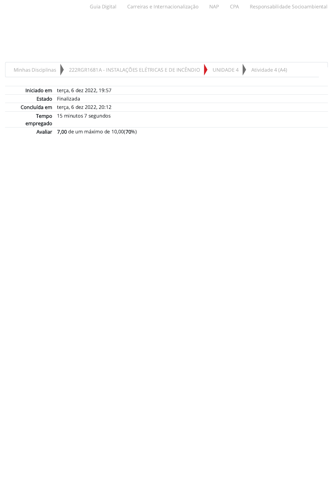 06/12/2022 20:12 Atividade 4 (A4): Revisão da tentativa https://ambienteacademico.com.br/mod/quiz/review.php?attempt=1621764&cmid=498541 1/10 Minhas Disciplinas 222RGR1681A - INSTALAÇÕES ELÉTRICAS E DE INCÊNDIO UNIDADE 4 Atividade 4 (A4) Iniciado em terça, 6 dez 2022, 19:57 Estado Finalizada Concluída em terça, 6 dez 2022, 20:12 Tempo empregado 15 minutos 7 segundos Avaliar 7,00 de um máximo de 10,00(70%) Guia Digital Carreiras e Internacionalização NAP CPA Responsabilidade Socioambiental https://ambienteacademico.com.br/my/ https://ambienteacademico.com.br/course/view.php?id=18114 https://ambienteacademico.com.br/course/view.php?id=18114§ion=5 https://ambienteacademico.com.br/mod/quiz/view.php?id=498541 https://codely-fmu-content.s3.amazonaws.com/Moodle/GuiaDigital/Guia+digital/index.html https://informa.fmu.br/carreiras/ https://codely-fmu-content.s3.amazonaws.com/Moodle/NAP/inicial/nap/fmu/index.html https://codely-fmu-content.s3.amazonaws.com/Moodle/CPA/landing_CPA/index.html https://portal.fmu.br/sustentabilidade 06/12/2022 20:12 Atividade 4 (A4): Revisão da tentativa https://ambienteacademico.com.br/mod/quiz/review.php?attempt=1621764&cmid=498541 2/10 Questão 1 Incorreto Atingiu 0,00 de 1,00 Leia o excerto a seguir. “Estes pequenos disjuntores termomagnéticos em caixa moldada são hoje utilizados na proteção da grande maioria dos circuitos terminais, em todos os tipos de instalação. Sua importância é decisiva na proteção da instalação, uma vez que os incêndios de origem elétrica geralmente se iniciam de problemas nos circuitos terminais ou nos equipamentos a eles ligados, por exemplo, em uma fiação dentro da canaleta, em uma tomada de corrente, em uma derivação para a ligação de um equipamento etc.” (COTRIM, 2009, p. 207). COTRIM, A. M. B. Instalações elétricas. 5. ed. São Paulo: Pearson Prentice Hall, 2009. A figura a seguir mostra esses minidisjuntores sendo montados dentro de uma caixa de distribuição. Fonte: grigvovan / 123RF. A respeito destes minidisjuntores e da caixa de distribuição, analise as afirmativas a seguir e assinale V para a(s) Verdadeira(s) e F para a(s) Falsa(s). I. ( ) O C escrito antes do número 16 indica que este minidisjuntor pertence a classe C e o número 16 indica que esse equipamento possui corrente nominal de 16 A. II. ( ) A peça metálica em que esses disjuntores estão sendo fixados é chamada de trilho. III. ( ) O cabo branco é a fase e será instalado no disjuntor e o azul é o neutro que será instalado em uma das barras que podem ser vistas no canto superior da caixa. IV. ( ) O montador desse quadro poderia fazer esse serviço sem usar as luvas de algodão mostradas na figura. Assinale a alternativa que apresenta a sequência correta. a. F, V, F, V. b. V, V, F, F. c. V, V, V, F. d. F, F, F, F. e. V, V, F, V. Guia Digital Carreiras e Internacionalização NAP CPA Responsabilidade Socioambiental https://codely-fmu-content.s3.amazonaws.com/Moodle/GuiaDigital/Guia+digital/index.html https://informa.fmu.br/carreiras/ https://codely-fmu-content.s3.amazonaws.com/Moodle/NAP/inicial/nap/fmu/index.html https://codely-fmu-content.s3.amazonaws.com/Moodle/CPA/landing_CPA/index.html https://portal.fmu.br/sustentabilidade 06/12/2022 20:12 Atividade 4 (A4): Revisão da tentativa https://ambienteacademico.com.br/mod/quiz/review.php?attempt=1621764&cmid=498541 3/10 Questão 2 Correto Atingiu 1,00 de 1,00 Leia o excerto a seguir. “A maioria dos cabos utilizados em instalações elétricas são isolados com PVC (Cloreto de Polivinila), que é uma mistura de cloreto de polivinila puro (uma resina sintética), plastificante, cargas e estabilizantes. Sua rigidez dielétrica é elevada, porém, comparado com o polietileno, seu poder indutor específico é alto e sua resistência de isolamento mais fraca. Este cabo transmite mal o fogo, mas sua combustão (em grande quantidade) provoca a produção de fumaça, gases corrosivos e tóxicos” (COTRIM, 2009, p. 153). COTRIM, A. M. B. Instalações elétricas. 5. ed. São Paulo: Pearson Prentice Hall, 2009. Considerando o excerto apresentado, sobre os cabos elétricos isolados em PVC, analise as afirmativas a seguir. I. Os cabos de PVC podem ser usados em instalações com muita aglomeração de pessoas. II. Eles são cabos flexíveis vendidos em rolos de acordo com a metragem que o instalador deseja. III. No Brasil a classe de isolação, de 750 V ou 0,6 / 1 kV deve vir estampada ao longo do cabo. IV. Os cabos HEPR, XLPE ou EPR com isolação de 0,6 /1 kV são para uso externo e nos ramais de ligação de entrada. Assinale a alternativa que apresenta a(s) afirmativa(s) correta(s). a. II e III, apenas. b. I e II, apenas. c. II, III e IV, apenas. d. I, II e IV, apenas. e. I, II e III, apenas. Guia Digital Carreiras e Internacionalização NAP CPA Responsabilidade Socioambiental https://codely-fmu-content.s3.amazonaws.com/Moodle/GuiaDigital/Guia+digital/index.html https://informa.fmu.br/carreiras/ https://codely-fmu-content.s3.amazonaws.com/Moodle/NAP/inicial/nap/fmu/index.html https://codely-fmu-content.s3.amazonaws.com/Moodle/CPA/landing_CPA/index.html https://portal.fmu.br/sustentabilidade 06/12/2022 20:12 Atividade 4 (A4): Revisão da tentativa https://ambienteacademico.com.br/mod/quiz/review.php?attempt=1621764&cmid=498541 4/10 Questão 3 Correto Atingiu 1,00 de 1,00 Leia o excerto a seguir. “Os disjuntores desarmam também quando ocorre um curto-circuito em uma ou nas três fases. Para a escolha do disjuntor devem ser fornecidas pelo fabricante as seguintes informações: tensão nominal em Vca; nível de isolamento, curvas características (tempo x corrente) do disparador magnético, corrente e frequência nominais. A condição de sua atuação por curto-circuito é estabelecida por I 1,45 I , sendo que I é a corrente do disjuntor e I é a corrente máxima que pode percorrer o cabo sem danificá-lo” (NISKIER, 2015, p. 188-189). NISKIER, J. Manual de Instalações El