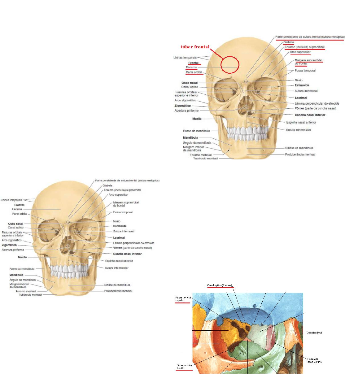 Anatomia da cabeça e do pescoço Vista anterior do crânio O crânio subdivide-se em: Neurocrânio: caixa óssea do encéfalo; Viscerocrânio. O neurocrânio em adultos é formado por 8 ossos, sendo 4 deles ímpares e 2 pares: Frontal; Etmoide; Esfenoide; Occipital; Parietal (bilateral); Temporal (bilateral). A vista frontal ou anterior do crânio é formada pelos ossos frontal e zigomático, órbitas, região nasal, maxila e mandíbula. O frontal, especificamente sua escama (parte plana), forma o esqueleto da fronte, articulando-se na porção inferior com o osso nasal e o zigomático. Em alguns adultos pode-se ver uma sutura frontal (sutura metópica) persistente ou remanescente, na linha mediana da glabela, a área lisa e ligeiramente deprimida situada entre os arcos superciliares. Os arcos superciliares se situam nas regiões próximas às sobrancelhas. Na escama do osso frontal vê-se duas elevações arredondadas, mais proeminente nos homens, chamadas de túber frontal. A parte horizontal, chamada parte orbital do osso frontal, forma o teto das órbitas. A margem supraorbital do osso frontal, o limite angular entre a escama e a parte orbital do frontal, tem um forame ou incisura supraorbital que dá passagem ao nervo e aos vasos supraorbitais e a um ramo do nervo oftálmico. A fossa média do crânio se conecta com as órbitas pelo canal óptico, por onde passa o nervo óptico (II par) e a artéria oftálmica. Próximo ao canal óptico, temos a fissura orbital superior e a inferior. Pela fissura orbital superior passam o nervo oculomotor (III par), nervo troclear (IV par) e nervo abducente (VI par), que se direcionam aos músculos extrínsecos do olho. Também passa por essa fissura o nervo oftálmico e as veias oftálmicas, que conectam as veias superficiais e profundas. Os zigomáticos, que formam as proeminências das bochechas, situam-se nas paredes inferior e lateral das órbitas, apoiados sobre as maxilas. Possuem 3 faces. Um pequeno forame zigomaticofacial perfura a face lateral do zigomático, por onde passa o nervo zigomaticofacial. A sutura frontozigomática conecta o processo zigomático do osso frontal ao processo frontal do osso zigomático. Na face anterior da maxila, temos uma projeção para o osso frontal, chamada de processo frontal da maxila, onde se localiza a crista lacrimal anterior. Posteriormente ao processo frontal da maxila, temos o osso lacrimal, onde se localiza a crista lacrimal posterior. Entre as cristas lacrimais, localiza-se a fossa do saco lacrimal, que se conecta ao canal lacrimonasal. As maxilas formam o esqueleto do arco dental superior, e são unidas na linha mediana pela sutura intermaxilar. Elas circundam a maior parte da abertura piriforme e formam a margem infraorbital. Inferiormente a margem infraorbital, temos os forames infraorbitais, que dão passagem ao nervo e vasos infraorbitais. Os nervos infraorbitais inervam o lábio superior. A maxila e a mandíbula possuem processos alveolares, que sustentam os dentes. As raízes dos dentes geram eminências, chamadas de eminências alveolares. Obs: a maior eminência alveolar é a eminência canina. A fossa canina se localiza posterolateralmente a eminência canina. Inferiormente aos ossos nasais está a abertura piriforme, formada tanto pelos ossos nasais quanto pela maxila. A abertura piriforme leva esse nome devido ao formato similar ao de uma pera. Inferiormente à abertura piriforme, observa-se um processo pontiagudo, ao qual dá-se o nome de espinha nasal anterior, que pertence à maxila. O septo nasal ósseo pode ser observado através dessa abertura, dividindo a cavidade nasal em partes direita e esquerda. O septo nasal é composto por 2 ossos e 1 cartilagem, os 2 ossos que o compõem são: vômer e lâmina perpendicular do etmoide. Na parede lateral de cada cavidade nasal há lâminas ósseas curvas, as conchas nasais. Temos as conchas nasais inferiores, médias e superiores. As conchas nasais inferiores são ossos independentes. Já as conchas nasais médias e superiores são ossos provenientes do osso etmoide. Obs: na vista anterior do crânio conseguimos ver apenas as conchas nasais inferiores e médias. A mandíbula é um osso em formato de U que tem processos alveolares, assim como a maxila, que sustentam os dentes mandibulares. Consiste em uma parte horizontal, o corpo, e uma parte vertical, o ramo da mandíbula. A protuberância mentual, que forma a proeminência do queixo, é uma elevação óssea triangular situada em posição inferior à sínfise da mandíbula. Lateralmente a protuberância mentual, em ambos os lados, notam-se elevações, as quais dá- se o nome de tubérculos mentuais. Nota-se também a presença de forames, chamados forames mentuais. Por estes forames passam os nervos e vasos mentuais. Os nervos mentuais inervam o lábio inferior. Como já dito, a mandíbula possui 2 partes: o corpo da mandíbula e o ramo da mandíbula. A borda anterior do ramo da mandíbula se projeta para o corpo da mandíbula por meio da linha oblíqua. O processo coronóide da mandíbula é anterior, e é onde se insere o músculo temporal. O processo condilar é posterior, e é dividido em colo e cabeça. Sendo o colo a parte menor, e a cabeça a parte superior e maior. A tuberosidade massetérica é a superfície irregular que se localiza próxima ao ângulo da mandíbula. É onde se insere o músculo masseter. A fóvea pterigoidea é medial ao colo da mandíbula, e é o local onde se insere o músculo pterigoideo lateral. Vista lateral do crânio A vista lateral do crânio é formada pelo neurocrânio e viscerocrânio. A fossa temporal do crânio é formada pelo osso parietal, frontal, temporal e esfenoide. Os limites superior e posterior da fossa temporal são as linhas temporais superior e inferior; o limite anterior é representado pelo frontal e pelo zigomático; e o limite inferior é o arco zigomático. No processo zigomático do frontal temos a linha temporal, que se divide
