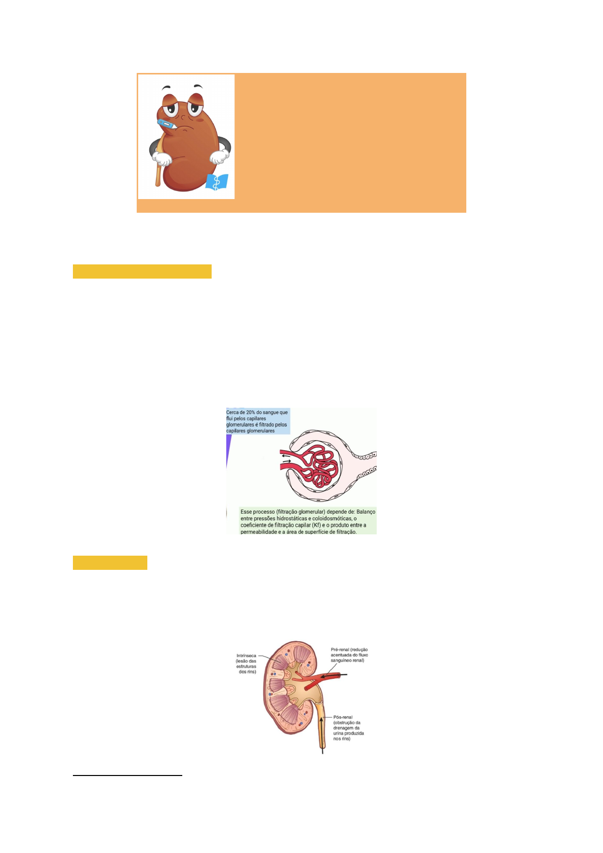 S9P1: FIM DA PICADA| APG 17| SOI IV |Isabella Afonso Lesã� rena� agud� Objetivos: estudar a �siopatologia da injúria renal e a relação com a picada de cobras/ compreender a etiologia e epidemiologia da lesão renal por crotalus/ Buscar fatores de risco, diagnóstico e tratamento para lesão renal aguda. Considerações gerais • caracteriza-se por redução abrupta (em horas a dias) da taxa de �ltração glomerular, resultando na inabilidade de o rim exercer suas funções básicas de excreção das escórias nitrogenadas e manutenção da homeostase hidroeletrolítica do organismo. • é reversível, podendo se manter por tempo variável • a mortalidade associada à doença ainda permanece elevada (entre 30 e 50%). ETIOLOGIA • pode ser de origem pré-renal, renal (ou intrínseca) ou pós-renal, a depender do nível de acometimento •A LRA pré-renal S9P1: FIM DA PICADA| APG 17| SOI IV |Isabella Afonso -redução da perfusão renal》 eventos que culminam 》 diminuição do volume circulante》 desidratação, diarreia, vômitos,febre, sangramentos, uso de diuréticos e insu�ciência cardiaca. -Caracteriza-se por redução da excreção urinária de sódio e de água, com elevação da osmolaridade urinária. -é facilmente reversível, desde que os fatores precipitantes sejam rapidamente corrigidos. •A LRA renal -causada por fatores intrínsecos ao rim, sendo classi�cada de acordo com principal local afetado: glomérulo; túbulos; interstício; e vasos. -Sua etiologia mais comum é lesão tubular, principalmente de origem isquêmica ou tóxica S9P1: FIM DA PICADA| APG 17| SOI IV |Isabella Afonso -a principal e mais frequente causa de necrose tubular aguda (NTA) é isquêmica e o seu principal fator causal tem origem pré-renal, como consequência da redução do �uxo sanguineo não revertida, especialmente se houver comprometimento su�ciente para provocar a morte das células tubulares. -Eventos isquêmicos mais graves (como nas complicações obstétricas e síndrome hemolítico-urêmica), sobretudo se ocorrer coagulação microvascular, podem resultar em necrose cortical irreversível. -Depois das isquêmicas, as causas nefrotóxicas são as mais frequentes •LRA renal nefrotóxicos -Os agentes nefrotóxicos incluem principalmente antibióticos aminoglicosídeos, contrastes radiológicos e quimioterápicos, além de pigmentos (p. ex, mioglobina) e venenos ofídicos. - os medicamentos e as drogas podem causar diversos tipos de danos por: Modi�cações hemodinâmicas, Dano tubular direto, Reação alérgica, causando a nefrite intersticial aguda, Obstrução intratubular, Desenvolvimento da sindrome hemolítico-urêmica. •A LRA por nefrite intersticial - causada por reações alérgicas a medicamentos. -Causas menos frequentes incluem doenças autoimunes (lúpus eritematoso) agentes infecciosos, determinadas, por exemplo, pela leptospirose ou, ainda, pela pielonefrite aguda por bactérias, como E. coli, Proteus sp, Klebsiella sp, entre outras bactérias. •LRA Pós-renal - Ocorre por causa da obstrução das vias urinárias, que pode ser observada em qualquer parte do trato urinário. S9P1: FIM DA PICADA| APG 17| SOI IV |Isabella Afonso - uma LRA por causa da obstrução do ureter, deve ser uma obstrução bilateral. -As principais causas são: o Hiperplasia prostática benigna; o Neoplasia de próstata ou bexiga; os Distúrbios retroperitoneais; Bexiga neurogênica; o Cálculos renais bilaterais o Fibrose retroperitoneal. - A reversibilidade depende do tempo de duração da obstrução, pois a elevação da pressão hidráulica da via urinária resulta na ação de vasoconstritores locais 》 obstrução prolongada tem como complicação a lesão parenquimatosa do rim. FISIOPATOLOGIA •as lesões renais isquêmica ou tóxica》 origens mais comuns 》 LRA intrínseca renal》 envolve alterações estruturais e bioquímicas comprometimento vascular e/ou celular 》 vasoconstrição, alteração da função e morte celular, descamação do epitélio tubular e obstrução intraluminal, vazamento transtubular do �ltrado glomerular e in�amação. •As principais alterações �siopatológicas na LRA são: 1)Vasoconstrição intra renal: -causada pelo desequilíbrio entre os fatores vasoconstritores e vasodilatadores, tanto de ação sistêmica quanto local. - Mecanismo particularmente importante na LRA por nefrotóxicos, com ativação de hormônios vasoconstritores (angiotensina Il, endotelina etc.) e/ou inibição de vasodilatadores (prostaglandinas, óxido nitrico etc.) Lesão tubular: associada principalmente a uma redução dos níveis intracelulares de ATP e a lesões de reperfusão. - A reversibilidade do dano às células tubulares dependerá da intensidade, do tempo de duração e do tipo do evento agressor. -A possibilidade de reversão da L.RA decorre da capacidade de regeneração e diferenciação das células tubulares renais, restabelecendo um epitélio íntegro e funcionante. - em situações mais graves com destruição de 90% das células epiteliais do túbulo proximal, os 10% de células remanescentes podem entrar em processo de proliferação estimulados por hormônios e fatores de crescimento, recompondo a epitélio tubular. QUADRO CLÍNICO •o curso clínico da LRA subdivide-se em quatro fases: inicial; oligúria; poliúrica; e recuperação funcional. S9P1: FIM DA PICADA| APG 17| SOI IV |Isabella Afonso 1)A fase inicial -começa a partir do momento de exposição ao insulto, isquėmico ou tóxico -Tem duração variável e depende do tempo de exposição ao agente agressor. - ovolume urinário pode estar normal ou diminuído, porém o rim começa a perder a capacidade de excretar adequadamente os compostos nitrogenados. 2)A fase oligúrica - pode ter grau e duração variáveis. - Um volume urinário inferior a 500 m e/dia é insu�ciente para excretar as quantidades necessárias de soluto, já que a produção de produto