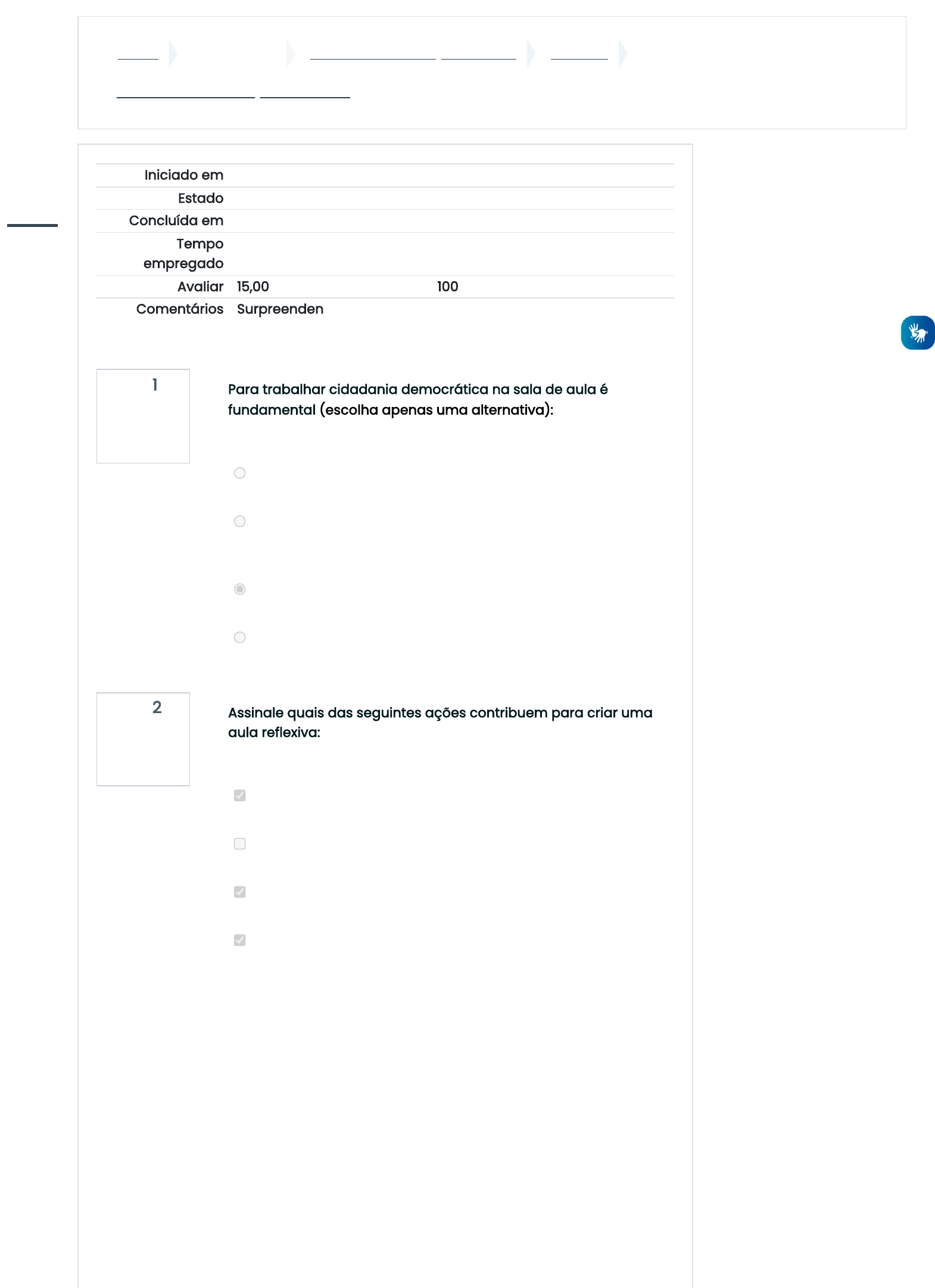 Painel Meus cursos CIDADANIA - 3ª Edição -2023_1 Módulo 1 Teste de auto avaliação - Módulo 1 Questão 1 Correto Atingiu 3,00 de 3,00 Questão 2 Correto Atingiu 3,00 de 3,00 Iniciado em quarta, 29 Mar 2023, 10:16 Estado Finalizada Concluída em quarta, 29 Mar 2023, 10:18 Tempo empregado 2 minutos 28 segundos Avaliar 15,00 de um máximo de 15,00(100%) Comentários Surpreenden! Parabéns pelo seu excelente desempenho no questionário. Para trabalhar cidadania democrática na sala de aula é fundamental (escolha apenas uma alternativa): Escolha uma opção: a. Decorar as leis e normas que regem o funcionamento de uma sociedade. b. Limitar o compartilhamento de experiências, ideias e visões entre os/as estudantes e fomentar o aprendizado individual. c. Criar e manter um ambiente de aprendizagem positivo, baseado no respeito e na confiança entre todos/as. d. Evitar os debates sobre questões difíceis e polêmicas. Assinale quais das seguintes ações contribuem para criar uma aula reflexiva: Escolha uma ou mais: a. Fornecer oportunidades de reflexão para o/a estudante. b. Contradizer diretamente aos/as estudantes quando eles/as estão falando algo que você acha errado. c. Refletir primeiro sobre você mesmo e a sua prática docente. d. Promover o diálogo e a troca de experiências entre os participantes. https://escolavirtual.educacao.go.gov.br/my/ https://escolavirtual.educacao.go.gov.br/course/view.php?id=2251 https://escolavirtual.educacao.go.gov.br/course/view.php?id=2251§ion=1 https://escolavirtual.educacao.go.gov.br/mod/quiz/view.php?id=171559 javascript:void(0); https://escolavirtual.educacao.go.gov.br/user/index.php?id=2251 https://escolavirtual.educacao.go.gov.br/grade/report/index.php?id=2251 https://escolavirtual.educacao.go.gov.br/course/view.php?id=2251&stopjsnav=1 https://escolavirtual.educacao.go.gov.br/course/view.php?id=2251&datapref=1 https://escolavirtual.educacao.go.gov.br/my/ https://escolavirtual.educacao.go.gov.br/?redirect=0 https://escolavirtual.educacao.go.gov.br/calendar/view.php?view=month&course=2251 javascript:void(0); https://escolavirtual.educacao.go.gov.br/user/files.php Questão 3 Correto Atingiu 3,00 de 3,00 Questão 4 Correto Atingiu 3,00 de 3,00 Questão 5 Correto Atingiu 3,00 de 3,00 Para criar uma aula reflexiva, o espaço da sala de aula (escolha apenas uma): Escolha uma opção: a. Deve estar bem organizado, cada estudante na sua mesa, organizadas em fileiras. b. É muito importante, pois a maneira como é arranjado transmite uma mensagem aos/às estudantes. Algunos arranjos na sala de aula, como a posição das cadeiras ou colocar cartazes na parede, promovem uma comunidade reflexiva melhor que outros. c. Não deve conter cartazes, mapas ou fotos na parede, pois podem distrair os/as estudantes. Refletindo sobre algumas estratégias para a introdução de tópicos controversos na sala de aula, assinale verdadeiro ou falso para as afirmações abaixo: a. Incentivar os/as estudantes a manterem orgulho de sua cultura vivida, suas experiências, suas famílias e suas comunidades. b. Forçar a participação dos/as estudantes nas discussões, ainda quando eles/as não quiserem falar. c. Dividir a classe em grupos menores. Verdadeira Falsa Verdadeira Sobre conectar os debates na sala de aula com a realidade, assinale as opções corretas: a. Permite que os/as estudantes vejam como as escolhas das pessoas que fazem a história também podem levar à reflexão sobre como fazer a diferença. b. Dificulta a compreensão dos conteúdos de aprendizado. c. Contribui com que os/as estudantes possam imaginar formas de participar na comunidade. Correta Errada Correta ATIVIDADE ANTERIOR ◄ Módulo 1 - Versão para Impressão Seguir para... PRÓXIMA ATIVIDADE Fórum de interação - Módulo 2 ► Obter o aplicativo para dispositivos móveis https://escolavirtual.educacao.go.gov.br/mod/resource/view.php?id=171558&forceview=1 https://escolavirtual.educacao.go.gov.br/mod/forum/view.php?id=171561&forceview=1 https://download.moodle.org/mobile?version=2019111809&lang=pt_br&iosappid=633359593&androidappid=com.moodle.moodlemobile javascript:void(0); https://escolavirtual.educacao.go.gov.br/user/index.php?id=2251 https://escolavirtual.educacao.go.gov.br/grade/report/index.php?id=2251 https://escolavirtual.educacao.go.gov.br/course/view.php?id=2251&stopjsnav=1 https://escolavirtual.educacao.go.gov.br/course/view.php?id=2251&datapref=1 https://escolavirtual.educacao.go.gov.br/my/ https://escolavirtual.educacao.go.gov.br/?redirect=0 https://escolavirtual.educacao.go.gov.br/calendar/view.php?view=month&course=2251 javascript:void(0); https://escolavirtual.educacao.go.gov.br/user/files.php