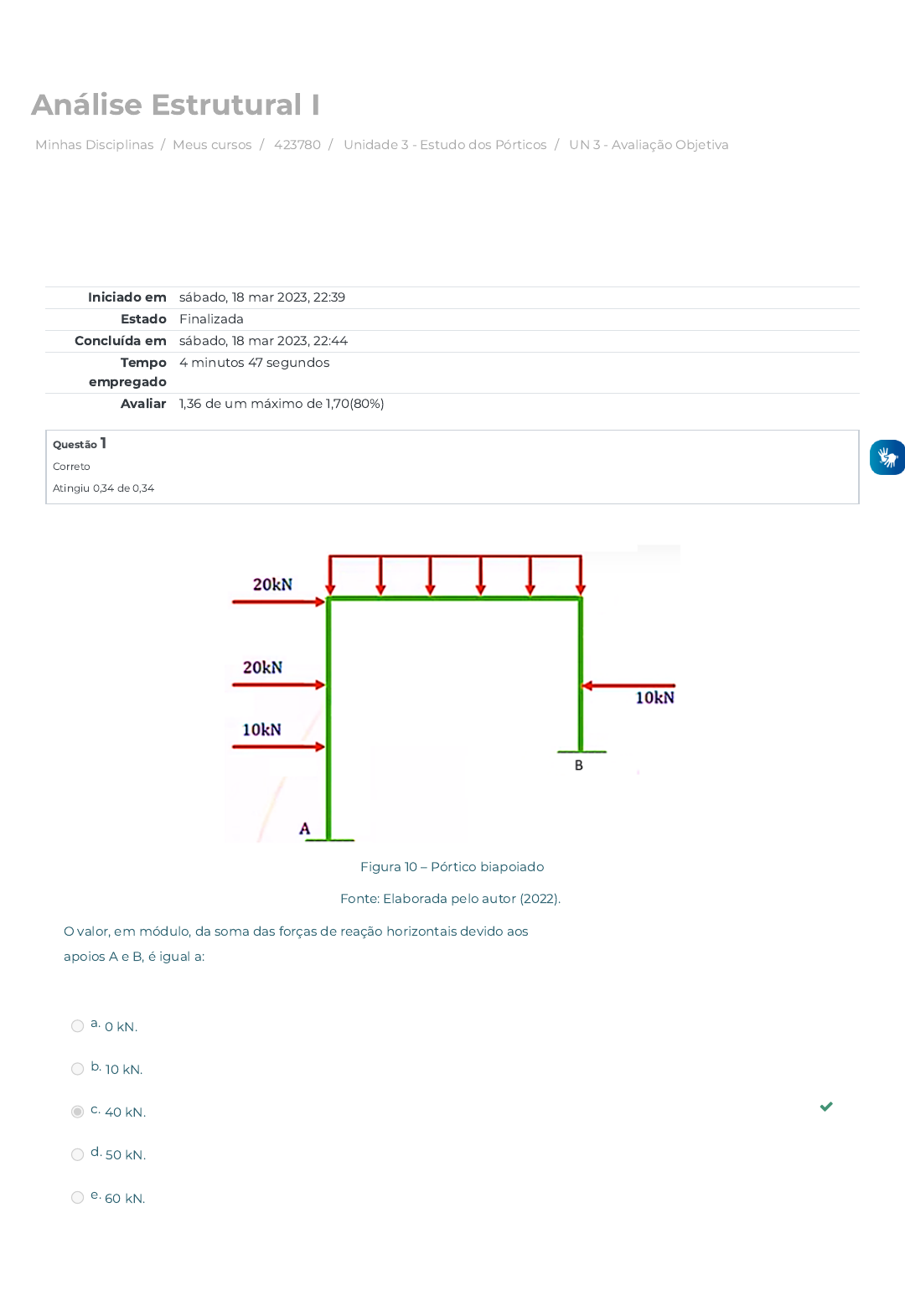 Minhas Disciplinas / Meus cursos / 423780 / Unidade 3 - Estudo dos Pórticos / UN 3 - Avaliação Objetiva Análise Estrutural I Iniciado em sábado, 18 mar 2023, 22:39 Estado Finalizada Concluída em sábado, 18 mar 2023, 22:44 Tempo empregado 4 minutos 47 segundos Avaliar 1,36 de um máximo de 1,70(80%) Questão 1 Correto Atingiu 0,34 de 0,34 Figura 10 – Pórtico biapoiado Fonte: Elaborada pelo autor (2022). O valor, em módulo, da soma das forças de reação horizontais devido aos apoios A e B, é igual a: a. 0 kN. b. 10 kN. c. 40 kN. d. 50 kN. e. 60 kN. https://avap.multivix.edu.br/my/ https://avap.multivix.edu.br/course/view.php?id=20413 https://avap.multivix.edu.br/course/view.php?id=20413§ion=4 https://avap.multivix.edu.br/mod/quiz/view.php?id=1309119 Questão 2 Correto Atingiu 0,34 de 0,34 Os pórticos ou quadros são geralmente usados na construção e são compostos por vigas e colunas conectadas. Os quadros se estendem em duas ou três dimensões. Os pórticos podem ser de vários materiais, ou seja, aço, madeira etc. No caso de estrutura em pórtico, as cargas dos pisos, telhados e paredes dos painéis são suportadas pelas vigas que, em última análise, transmitem essas cargas aos pilares. Sobre os tipos de pórticos e seus apoios é correto a�rmar que: a. a �gura traz um exemplo de pórtico engastado com barras inclinadas. Figura 4 – Pórtico Fonte: Adaptada de Udoeyo (2020, p. 58). b. a �gura representa um exemplo de pórtico biapoiado. Figura 6 – Pórtico Fonte: Adaptada de Udoeyo (2020, p. 77). c. a �gura traz um exemplo de pórtico engastado com extremidade livre. Figura 7 – Pórtico Fonte: Adaptada de Udoeyo (2020, p. 58). d. a �gura representa um exemplo de pórtico composto. Figura 8 – Pórtico Fonte: Adaptada de Udoeyo (2020, p. 83). Questão 3 Correto Atingiu 0,34 de 0,34 e. a �gura traz um exemplo de pórtico atirantado. Figura 5 – Pórtico Fonte: Adaptada de Udoeyo (2020, p. 58). O pórtico biapoiado, representado na �gura, encontra-se submetido a uma carga distribuída com valor igual a w= 100 N/m. A dimensão L possui valor igual a 6 metros. Observa-se que o carregamento está distribuído de forma simétrica em relação aos apoios A e B. Figura 3 – Pórtico biapoiado Fonte: Elaborada pelo autor (2022). Desconsiderando o peso da estrutura, o valor das reações verticais nos apoios A e B apresentam valores, respectivamente, iguais a: a. 100 N e 100 N. b. 100 N e 600 N. c. 600 N e 600 N. d. 300 N e 300 N. e. 100 N e 600 N. Questão 4 Correto Atingiu 0,34 de 0,34 O pórtico engastado e com extremidade livre mostrado na �gura, encontra-se carregado verticalmente por uma força concentrada de 20kN e horizontalmente, por uma carga distribuída no valor de 10kN/m. Figura 11 – Pórtico livre e engastado Fonte: Adaptada de Udoeyo (2020, p. 77). O valor em módulo da força de reação horizontal referente ao apoio A será igual a: a. 1 kN. b. 10 kN. c. 100 kN. d. 50 kN. e. 5 kN. Questão 5 Incorreto Atingiu 0,00 de 0,34 A �gura mostra um exemplo de pórtico engastado e com extremidade livre. Observe que a estrutura encontra-se carregada verticalmente por uma força concentrada e horizontalmente, por uma carga distribuída. Figura 9 – Pórtico livre e engastado Fonte: Adaptada de Udoeyo (2020, p. 77). Sobre o pórtico representado na �gura, é correto a�rmar que: a. a carga vertical provocará uma força de reação horizontal no apoio A. b. tanto o carregamento vertical, quanto o horizontal provocam tendência de rotação no pórtico. c. a carga distribuída horizontal não provoca tendência de rotação na estrutura. d. a carga concentrada vertical não provoca tendência de rotação na estrutura. e. o apoio A reage somente com forças verticais e horizontais, visto que não há momento gerado pelas caras externas. ← Conteúdo online Seguir para... Conteúdo online → https://avap.multivix.edu.br/mod/scorm/view.php?id=1309118&forceview=1 https://avap.multivix.edu.br/mod/scorm/view.php?id=1309120&forceview=1
