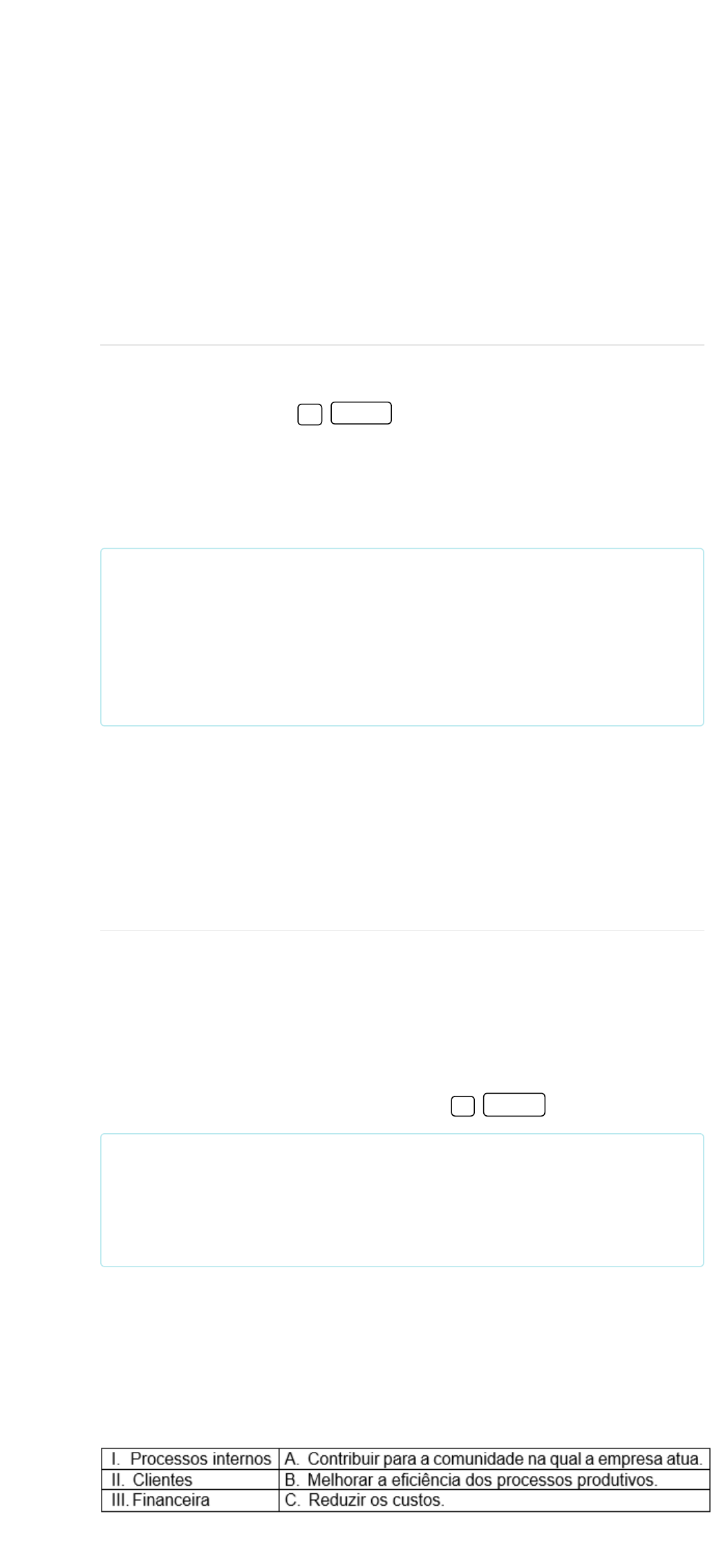 30/03/2023 10:43 Cosmos · Cosmos https://kroton.platosedu.io/lms/m/aluno/disciplina/index/2774820/5674779 1/5 Gerenciamento de processos Professor(a): Charlie Hudson Turette Lopes (Especialização) 1) 2) 3) Prepare-se! Chegou a hora de você testar o conhecimento adquirido nesta disciplina. A Avaliação Virtual (AV) é composta por questões objetivas e corresponde a 100% da média final. Você tem até cinco tentativas para “Enviar” as questões, que são automaticamente corrigidas. Você pode responder as questões consultando o material de estudos, mas lembre-se de cumprir o prazo estabelecido. Boa prova! As dimensões denominadas ___________, utilizadas na governança corporativa, são utilizadas para __________ o ambiente no qual empresas podem estar inseridas. __________ e __________ são exemplos. Assinale a alternativa que completa adequadamente as lacunas: Alternativas: 8 Ps; mapear; papeis; poder. CORRETO Valores; mapear; papeis; empatia. 8 Ps; regrar; transparência; poder. Valores; compreender; empatia; equidade. 8 Ps; modificar; responsabilidade corporativa; transparência. Código da questão: 69581 Existem algumas práticas administrativas para o estudo de processos. Seus praticantes costumam utilizar seus nomes mercadológicos ao se referirem a tais práticas. Sobre a filosofia japonesa Kaizen, assinale a alternativa correta sobre a prática administrativa. Alternativas: A filosofia é aceita apenas em setores operacionais. Significa mudança radical. Está voltada para a reengenharia de processos. Aplicada em níveis estratégicos, sendo ferramenta do balanced scorecard (BSC). Amplamente utilizada para melhoria de processos. CORRETO Código da questão: 69575 O BSC descreve as perspectivas de mensuração que uma empresa deve fazer para uma correta autoavaliação de seus resultados. Leia e associe as duas colunas conforme as perspectivas do BSC e exemplos de ações que podem ser associadas a elas. Assinale a alternativa que traz a associação correta entre as duas colunas: Resolução comentada: Seja para empresas privadas ou estatais, familiares ou não, que buscam fusões ou expansões, a GC pode ser aplicada para mapear o ambiente nos quais elas estão inseridas a partir de dimensões denominadas 8 Ps (ROSETTI, ANDRADE; 2022). Fonte: ROSETTI, José P.; ANDRADE, Adriana de. Governança Corporativa: Fundamentos, Desenvolvimento e Tendências. 7. ed. São Paulo: Atlas, 2022. Resolução comentada: Programas de melhoria de processos (business process improvement – BPI) são programas de curta duração, baseados em atividades rotineiras, visando redução de desperdícios a partir de soluções simples. 30/03/2023 10:43 Cosmos · Cosmos https://kroton.platosedu.io/lms/m/aluno/disciplina/index/2774820/5674779 2/5 4) 5) Alternativas: I-C; II-A; III-B. I-B; II-A; III-C. CORRETO I-A; II-C; III-B. I-A; II-B; III-C. I-B; II-C; III-A. Código da questão: 69573 Sobre os indicadores chave de desempenho (KPI’s), analise as afirmativas a seguir e assinale-as com V (verdadeiro) ou F (falso): ( ) Um exemplo de indicador de capacidade produtiva pode ser uma empresa que entrega 99,5% de seus produtos conformes. ( ) “Aumentar a produtividade em 20% até o fim do semestre corrente” é um exemplo de meta. ( ) Uma empresa que vendeu R$ 500.000,00 em um mês, com lucro de R$ 25.000,00, teve lucratividade de 5%. ( ) Uma empresa que vendeu R$ 300.000,00 com lucratividade de 10%, teve R$ 3.000,00 em lucro. ( ) A meta de retrabalho no setor de corte de peças em uma empresa é de 2% sobre os itens fabricados, com tolerância de 1%, para mais ou para menos. Em julho do último ano o valor atingido foi 3,5%, portanto, o setor atingiu a meta. Assinale a alternativa que contenha a sequência correta de V e F: Alternativas: V – F – V – F – V. F – V – V – F – F. CORRETO F – F – V – F – F. V – V – V – F – V. F – V – V – V – F. Código da questão: 69572 Sobre a governança corporativa (GC), analise as afirmativas a seguir e assinale-as com V (verdadeiro) ou F (falso): ( ) A GC busca garantir a integridade das informações. Resolução comentada: Uma ação para os processos internos pode ser melhorar a eficiência dos processos produtivos. Já na perspectiva dos clientes, contribuir para a comunidade na qual a empresa atua e auxilia para o reconhecimento social da marca. Na perspectiva financeira, reduzir os custos pode gerar bons resultados para os acionistas. Resolução comentada: A segunda e a terceira afirmativas são verdadeiras. Veja a forma correta das afirmativas falsas: Primeira – Um exemplo de indicador de QUALIDADE pode ser uma empresa que entrega 99,5% de seus produtos conformes. Quarta – Uma empresa que vendeu R$ 300.000,00 com lucratividade de 10%, teve R$ 30.000,00 em lucro. Quinta – A meta de retrabalho no setor de corte de peças em uma empresa é de 2% sobre os itens fabricados, com tolerância de 1%, para mais ou para menos. Em julho do último ano o valor atingido foi 3,5%, portanto, o setor NÃO atingiu a meta. Para atingir a meta, o valor não poderia ser superior a 3%. 30/03/2023 10:43 Cosmos · Cosmos https://kroton.platosedu.io/lms/m/aluno/disciplina/index/2774820/5674779 3/5 6) 7) ( ) A GC possui princípios como transparência e equidade. ( ) A GC pode ser muito útil para empresas que desejam realizar fusões. ( ) A GC possui princípios como poder e normas. ( ) Apenas alguns tipos de empresas podem utilizar GC. Por exemplo, empresas do terceiro setor não podem adotar as práticas de GC. Assinale a alternativa que contenha a sequência correta de V e F: Alternativas: F – F – V – V – F. V – V – V – F – F. CORRETO V – F – F – V – V. V – F – V – F – V. V – V – F – F – F. Código da questão: 69583 Sobre o gerenciamento de processos de negócio (BPM), analise as afirmativas a seguir e assinale-as com V (verdadeiro) ou F (falso): ( ) Processos primários são responsáveis 