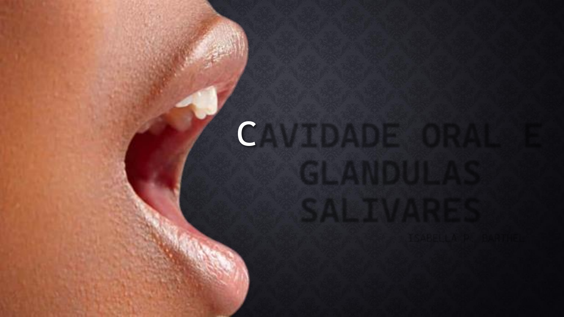 CAVIDADE ORAL E GLANDULAS SALIVARES ISABELLA P. BARTHEL CAVIDADE ORAL A cavidade oral é a primeira porção do canal alimentar e responsável pela fonação. Os limites são: ▪ Anterior: Lábios; ▪ Lateral: Bochechas; ▪ Superior: Palato; ▪ Inferior: Assoalho bucal; ▪ Posterior: Istimo da garganta. CAVIDADE ORAL • Divisão da cavidade oral: ▪ Vestíbulo da boca: É o espaço situado entre os lábios e bochechas, externamente, e os dentes e a gengiva, internamente. ▪ Cavidade propriamente dita: Situa-se entre as arcadas dentárias, língua, palato e arco palatoglosso VESTÍBULO DA BOCA LÁBIOS ▪ O lábio superior é limitado superiormente pelo nariz, ao qual se une por meio de um sulco raso e largo denominado de filtro, é separado das bochechas, de ambos os lados, por um sulco profundo, chamado de sulco nasolabial. ▪ O lábio inferior apresenta como limite externo, inferiormente, o sulco labiomentoniano. 1. Comissura labial 2. Rima bucal 3. Filtro 4. Sulco nasolabial 5. Sulco labiomentoniano Funções dos lábios: • apreender os alimentos • Sugar líquidos • Atuar na modulação da fala • Manter o alimento dentro da cavidade (esfíncter) • Osculação (beijo) LÁBIOS A posição dos lábios está diretamente relacionada com a dimensão vertical de oclusão (DVO) LÁBIOS Camadas: Pele – tecido subcutâneo – músculo – submucosa - mucosa A pele é separada da mucosa por uma zona de transição -> vermelhão dos lábios - Artéria labial inferior: origina-se próximo do ângulo da boca, corre medialmente no lábio inferior e se encontra com a do lado oposto. - Artéria labial superior: origina-se próximo do ângulo da boca, corre medialmente no lábio superior e dá ramos para o septo e para a asa do nariz. - A camada muscular dos lábios é formada pelo músculo orbicular da boca e por algumas fibras musculares que convergem para as bordas livres dos lábios. LÁBIOS • A face interna dos lábios é revestida por uma mucosa de coloração rósea e aspecto liso brilhante. • No vestíbulo podemos notar pregas mucosas mediana superior e inferior, o frênulo do lábio e freios laterais. 7. Mucosa alveolar 8. Fórnice do vestíbulo 9.Freio labial superior 10. Freio lateral 7. Mucosa labial 8. Fórnice do vestíbulo 9.Freio labial superior 10. Freio lateral EDÊNTULOS Relação do fórnice de vestíbulo em situações de atrofia do osso alveolar As bochechas estão em ligação direta com os lábios a apresentam também uma superfície cutânea e outra mucosa. A camada muscular da bochecha é representada principalmente pelo músculo bucinador. BOCHECHAS BICHECTOMIA BOCHECHAS Internamente está delimitado por: • fórnice do vestíbulo (superior e inferior) • prega pterigomandibular (posterior). Na altura do segundo molar superior, abre-se o ducto parotídeo. Em muitas pessoas é possível observar a linha alba. GENGIVA Tecido eptelial e conjuntivo É formada por: • Gengiva livre • Gengiva inserida • Mucosa alveolar • Papila interdentária GENGIVA CAVIDADE PROPRIAMENTE DITA CAVIDADE PROPRIAMENTE DITA • É composta por: • Palato • Soalho bucal • Língua • Istimo da garganta PALATO • É divido em uma porção anterior ou palato duro e outra posterior ou palato mole (véu palatino). • A mucosa que reveste o palato duro é espessa e unida ao periósteo (mucoperiósteo). • Onde encontramos as pregas palatinas transversas (rugas palatinas). Palato duro Palato mole PALATO • O limite entre o palato duro é reconhecido devido a diferença de coloração entre ambas as regiões. • Na borda livre do palato mole encontramos uma projeção cônica de comprimento variável chamada de úvula. • Lateralmente, divide-se em duas pregas, uma de cada lado, que são os arcos palatinos do istmo da garganta • O palato mole é formado pelos músculos elevador e tensor do véu palatino, palatoglosso, palatofaríngeo e da úvula. PALATO • Glândulas salivares menores (glândulas palatinas) se estendem em direção ao palato mole, localizando-se entre a mucosa e a camada muscular. PALATO • Músculos: 1. Levantador do véu palatino 2. Tensor do véu palatino 3. Músculo da úvula 4. Palatoglosso 5. palatofaríngeo TENSOR DO VÉU PALATINO LEVANTADOR DO VÉU PALATINO M Ú S C U L O D A Ú V U L A P A L A T O F A R Í N G E O P A L A T O G L O S S O ISTMO DA GARGANTA • É a comunicação entre a cavidade da boca com a parte oral da faringe (orofaringe). • Delimitado pelo: ▪ Superior: palato mole; ▪ Inferior: raiz da língua; ▪ Lateralmente: Arcos palatoglosso e palatofaringeo. 1.Palato mole 2. Úvula 3.Arco palatoglosso 4.Arco palatofaríngeo 5.Istmo da garganta 6.Raíz da língua. ISTMO DA GARGANTA SOALHO BUCAL É formado por: Músculos Da Língua Suprahióideos Glândulas Submandibular Sublingual Vasos e Nervos A. Lingual N. Lingual (V) N. Hipoglosso (XII) SOALHO BUCAL • Formado exclusivamente por tecidos moles; • Recoberto por uma mucosa delgada, vermelha, translúcida e apresentando-se frouxamente fixada aos planos profundos. • A mucosa do soalho da boca continua com a mucosa da língua. SOALHO BUCAL 1.Margem da língua 2.Freio da língua 3.Carúncula sublingual 4.Prega sublingual 5.Mucosa do soalho bucal MÚSCULOS SUPRA HIOIDEOS Digástrico Estilo-hioideo Milo-hioideo Genio-hioideo Digástrico MÚSCULOS SUPRA HIOIDEOS LÍNGUA Função: • Mastigação; • Deglutição; • Fonação; • Paladar; • Fonação • limpeza dos dentes • É formada por 2 porções : ▪ Parte Livre: ▪ Face Dorsal; ▪ Margens Laterais; ▪ Ápice; ▪ Face Ventral; ▪ Raiz (Base): Insere-se por meios de Tratos Fibrosos e Fascículos ao Osso Hióide; Palato; Processo Estilóide e à Mandíbula Órgão da Gustação: Eminência Muscular móvel que ocupa o Soalho da Cavidade Bucal CONFORMAÇÃO EXTERNA DA LÍNGUA ➢ 2/3 ANTERIORES: • Superior (Dorso) • Inferior (Ventre) • Margens • Àpice ➢ 1/3 POSTERIOR: • Base ou Raiz R A Í Z C