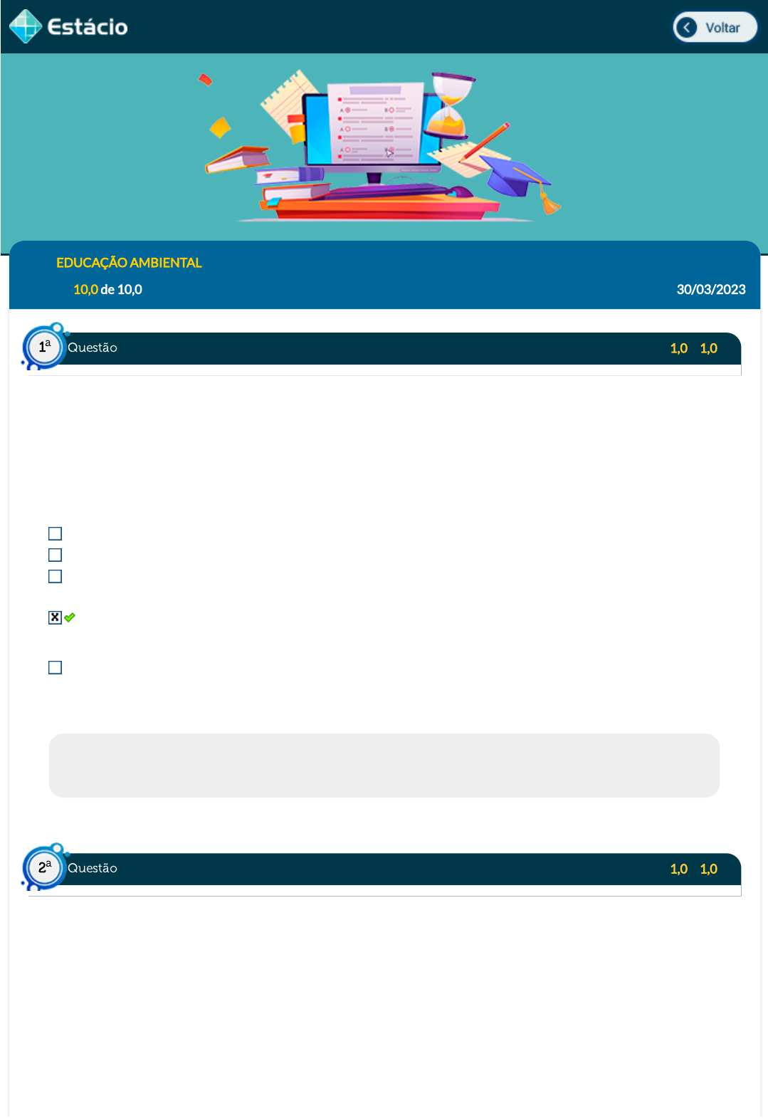 Disc.: EDUCAÇÃO AMBIENTAL Acertos: 10,0 de 10,0 30/03/2023 Acerto: 1,0 / 1,0 A reorientação do ensino no sentido do desenvolvimento sustentável é a garantia da satisfação das necessidades básicas de aprendizagem para todos. A promoção do treinamento busca a formação de recursos humanos para as práticas sustentáveis. Já o aumento da consciência pública está relacionado à melhoria na distribuição das informações sobre o meio ambiente ¿ em especial, nos espaços de ensino formal. Esses assuntos são tratados em qual capítulo da Agenda 21 Brasileira? 16. 26. 9. 36. 30. Respondido em 30/03/2023 09:31:49 Explicação: 36. Acerto: 1,0 / 1,0 ¿O investimento em cidades sustentáveis pode neutralizar emissões de carbono. De acordo com o estudo, um dos primeiros passos é mudar a matriz energética. Segundo os dados apresentados, as cidades consomem cerca de 78% das fontes primárias de energia do planeta. Nos Estados Unidos, 67,5% da energia primária é desperdiçada. Com a queima de combustíveis fósseis, calor é gerado durante o processo e há demanda por consumo adicional de energia para a extração e o transporte dos combustíveis. Com a transição para energias renováveis como fonte primária, há menos desperdício ao longo do processo. Em relação ao Brasil, o relatório apontou que é possível atingir benefícios econômicos e ambientais até 2025 com mudanças nas cidades. Há um potencial de redução de 45 milhões de toneladas de CO2 em emissões até 2025 com um ganho de 7% na e�ciência energética com equipamentos mais modernos, serviços públicos, mobilidade elétrica e geração distribuída.¿ Fonte: THOMAS, J. A. Investimento em cidades sustentáveis pode neutralizar emissões de carbono. Veja. Publicado em: 8 jun. 2021. Consultado na internet em: 30 jun. 2021. Questão1 a Questão2 a https://simulado.estacio.br/alunos/inicio.asp javascript:voltar(); Nessa reportagem, podemos entender um pouco da importância de se mudar hábitos e transformar o nosso entorno com práticas mais sustentáveis. Algumas cidades ao redor do mundo possuem algumas estratégias para isso, como o uso de ciclovias e o planejamento de áreas verdes. O desenvolvimento de cidades sustentáveis no Brasil é um dos eixos temáticos de um importante documento redigido no país. Indique a seguir o nome dele. Agenda 21 Brasileira. Operação LimpaOca. Conferência sobre Meio Ambiente e Desenvolvimento. Conferência Nacional de Meio Ambiente. Conferência das Cidades e Conferência da Saúde. Respondido em 30/03/2023 09:42:40 Explicação: Agenda 21 Brasileira. Acerto: 1,0 / 1,0 ¿A estrutura física da Escola Bosque começou a ser construída de forma concomitante a sua proposta pedagógica. Obedeceu a uma preocupação central com a adequação de linhas e estruturas ao sentido e signi�cado das práticas educativas a serem realizadas. Espaços circulares, salas com formato octogonal, ventiladas, com iluminação natural facilitada, laboratórios, trilhas, espaço para horta, tudo pensado a partir de uma proposição pedagógica também circular e dialogal, construída coletivamente num diálogo entre comunidade, técnicos da Secretaria Municipal de Educação e instituições de ensino e pesquisa da região. Uma escola concebida para ser um lugar pensante, lugar onde a vida amazônica seria cenário, cena e principal atriz, lugar onde a educação seria ambiental por excelência, desde a educação infantil, ensino fundamental e ensino médio pro�ssionalizante ¿ formando o técnico em meio ambiente.¿ Fonte: SILVA, M. L. da. A Escola Bosque e suas estruturas educadoras ¿ uma casa de educação ambiental. In: Vamos cuidar do Brasil ¿ conceitos e práticas em Educação Ambiental na escola. Brasília: MMA/MEC, 2007. O texto acima se refere à construção física e pedagógica da Escola Bosque, um colégio na cidade de Belém, no Pará, que busca promover o aprendizado da educação formal por meio de diversas abordagens em sintonia com o meio ambiente. A construção dessa escola faz parte do projeto ¿Vamos cuidar do Brasil¿, um dos diversos programas criados para incentivar a prática da educação ambiental no ensino formal. Esse projeto constitui uma determinação que vem sendo cumprida a partir dos direcionamentos de qual documento? Política Nacional da Gestão da Educação Ambiental. Parâmetros Curriculares Nacionais. Questão3 a Constituição Federal de 1988. Política Nacional da Educação Ambiental. Lei de Diretrizes e Bases. Respondido em 30/03/2023 09:38:48 Explicação: Política Nacional da Educação Ambiental. Acerto: 1,0 / 1,0 Qual das alternativas abaixo contém apenas características típicas de uma paisagem do ambiente rural? Ausência de infraestrutura urbana, áreas de uso regulamentado por lei e vegetação natural preservada. Baixa densidade populacional, pouca área construída e extrema poluição ambiental. Extensas áreas agrícolas, elementos naturais preservados e áreas de uso restrito por leis e normas. População densa, predomínio de atividades agrícolas e recursos naturais em abundância. Predomínio de pastagens e cultivares, pouca densidade populacional e distribuição espaçadas das moradias. Respondido em 30/03/2023 09:29:16 Explicação: A paisagem rural é caracterizada principalmente pela predominância de áreas destinadas à agropecuária comercial, pela baixa densidade populacional com moradias distribuídas de modo espaçado e com pouca área construída. O uso restrito de áreas determinado por lei é uma característica de Unidades de Conservação, assim como recursos naturais em abundância e vegetação natural preservada. Já a extrema poluição ambiental e população densa são características de áreas urbanas. Acerto: 1,0 / 1,0 A imagem a seguir apresenta em verde áreas com baixo grau de urbanização, que representam áreas rurais e preservadas do Brasil. Dentre as alternativas abaixo, escolha a qu