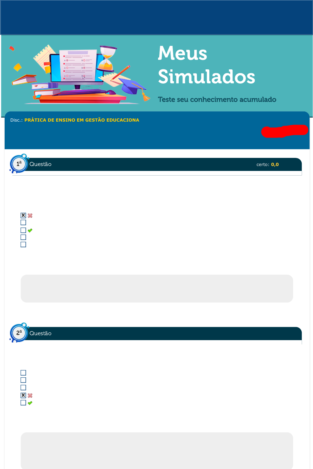 Meus Simulados Teste seu conhecimento acumulado Disc.: PRÁTICA DE ENSINO EM GESTÃO EDUCACIONAL Aluno(a): JORDANA APARECIDA BARRA 202011074417 Acertos: 8,0 de 10,0 07/02/2023 Acerto: 0,0 / 1,0 A Resolução CEB/CNE nº 2/99 ainda estabelece a organização curricular do Curso Normal em nível médio em áreas ou núcleos curriculares assegurando a formação básica, geral e comum em consonância com as determinações contidas na Lei de Diretrizes e Bases da Educação Nacional, Lei nº 9394/96 no que se refere aos conteúdos necessários na educação básica. Essa estabelece a organização curricular do curso de formação para o magistério em nível médio, modalidade Normal, estipula a garantia, além da Formação Profissional: Cursos de Extensão. Módulo de Aprendizagens. A Base Nacional Comum. Módulos para suprir o ensino médio. Supletivo do ensino médio. Respondido em 07/02/2023 15:24:34 Explicação: Por ser um curso de nível médio e terceira etapa da educação básica deve ser garantida a formação básica geral e comum como um direito inalienável e condição necessária ao exercício da cidadania plena. Acerto: 0,0 / 1,0 Dentre as competências específicas para a formação profissional docente, definidas pela Resolução CNE/CP nº 2/2019, encontramos "Planejar as ações de ensino que resultem em efetivas aprendizagens". Esta competência específica é localizada na dimensão fundamental: Engajamento social. Cooperação Profissional. Empatia Profissional. Conhecimento Pedagógico. Prática Profissional. Respondido em 07/02/2023 15:24:45 Explicação: A dimensão fundamental para a formação de professores denominada: prática profissional, corresponde à forma como os conteúdos são trabalhados em situação de aula: sequências didáticas, progressão e complexidade de conhecimentos abordados, experiências práticas e planejamento. A prática docente é a associação contínua entre o conhecimento e o ensino. Esta dimensão é uma das bases do tripé: conhecimento-prática-engajamento profissionais. Questão1 a Questão2 a https://simulado.estacio.br/alunos/inicio.asp javascript:voltar(); Acerto: 1,0 / 1,0 Leia o texto, a seguir. O debate sobre a cultura do fracasso escolar precisa se disseminar para toda a sociedade e o registro de dados sobre o assunto pode ser um ponto de partida para a identificação da reprovação como um desafio a ser enfrentado coletivamente e que pode conduzir à promoção de maior equidade. Disponível em https://www.unicef.org/brazil/relatorios/enfrentamento-da-cultura-do-fracasso-escolar. Acesso em 23 nov 2021. Considerando as informações acima, avalie as asserções a seguir e a relação proposta entre elas. O conceito de fracasso escolar ignora as ações locais dos espaços educativos Porque Esvazia a falência do projeto educacional e ignora as ações locais. A respeito dessas asserções, assinale a opção correta. A número II é uma preposição falsa I e II são proposições verdadeira. As asserções I e II são preposições verdadeiras, e a II justifica a número I. As asserções I e II não são preposições verdadeiras. Não existe relações entre as asserções I e II. As asserções I e II são preposições falsas, a número I não possui relação com a número II. Respondido em 07/02/2023 15:12:22 Explicação: Gabarito: As asserções I e II são preposições verdadeiras, e a II justifica a número I. Justificativa: Ao pensarmos no conceito de fracasso escolar, precisamos fazer o exercício de entender a cultura que culpa os profissionais da educação pelos fracassos. Deixando de lado as intervenções cotidianas que superam os limites de investimentos. Acerto: 1,0 / 1,0 É importante que o estagiário compreenda que o livro didático e as atividades regulares de ensino não serão as únicas ferramentas de aprendizagem e que os alunos, de maneira regular trarão para nossas relações de aprendizagem conteúdos que não fazem parte do conjunto prévio curricular. Como pode ser construída a relação de aprendizagens dos estudantes nas ferramentas multimídias? Dentro das ordens do currículo escolar, uma vez que a legislação educacional determina a equidade de acesso. Apenas como reforço e nunca pela curiosidade, já que jovens não gostam de conteúdo digital. No silenciamento da curiosidade dos estudantes, uma vez que tecnologia não pode ser acessada nas escolas. Todos os estudantes vão agir da mesma maneira, no seu contato com conteúdos digitais. Por meio da mediação das famílias, na sua curiosidade e na participação dos educadores. Respondido em 07/02/2023 15:13:49 Explicação: Gabarito: Por meio da mediação das famílias, na sua curiosidade e na participação dos educadores. Questão3 a Questão4 a Justificativa: O professor em formação precisa reconhecer que existem outros espaços de trocas pedagógicas e que este movimento pode ser inserido em suas atividades docentes. Podemos dizer aqui, que as tecnologias podem atuar como uma ferramenta de inclusão digital e social. Por isto, se faz necessário, abrir um espaço em suas observações para estudar com detalhes a dimensão prática destas atuações. Precisamos entender que as tecnologias, quando são utilizadas em favor dos territórios e das identidades poderá ser uma aliada de uma educação inclusiva. Acerto: 1,0 / 1,0 (Adaptado de Itame 2020) As etapas da educação básica oferecidas, o funcionamento dos órgãos colegiados, o calendário, as normas para matrícula, cancelamento e transferência, as normas de convivência, as sanções disciplinares, as regras para utilização dos espaços, as condições de aprovação e reprovação de alunos, são componentes do: Plano de Ação. Plano de Ensino. Plano de Gestão. Regimento Escolar. Manual do Aluno. Respondido em 07/02/2023 15:17:27 Explicação: Toda escola é obrigada a ter seu regimento. Nele, encontram-se as regras e as normas da escola. Tais regras f