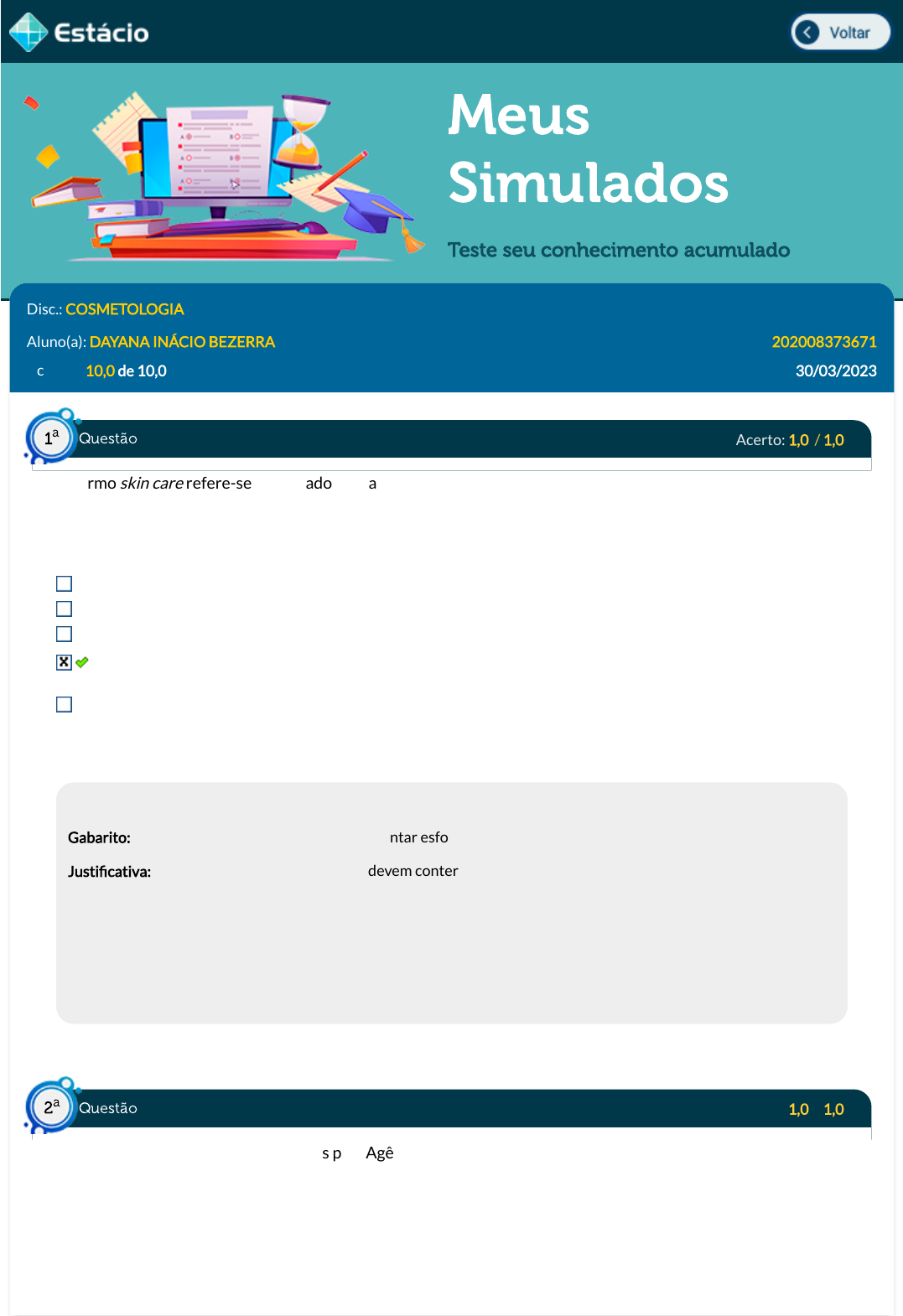 Meus Simulados Teste seu conhecimento acumulado Disc.: COSMETOLOGIA Aluno(a): DAYANA INÁCIO BEZERRA 202008373671 Acertos: 10,0 de 10,0 30/03/2023 Acerto: 1,0 / 1,0 O termo skin care refere-se ao cuidado com a pele. A indústria cosmética tem investido bastante em produtos destinados a esse cuidado e tem aprimorado diversos produtos para o cuidado com a pele facial, assim como investe bastante em maquiagens, cuja principal função é enaltecer a beleza. A partir disso, assinale a alternativa correta sobre produtos cosméticos destinados à face: Maquiagens para diferentes tons de pele utilizam combinação idêntica de pigmentos. Protetores solares destinados à face se apresentam como cremes com alto teor graxo. As matérias-primas utilizadas nessas formulações apresentam propriedade comedogênica. Formulações cosméticas podem apresentar esfoliantes que se caracterizam como mecânicos ou químicos. Produtos cosméticos presentes no mercado são ine�cientes quanto ao efeito antienvelhecimento. Respondido em 30/03/2023 19:46:47 Explicação: Gabarito: Formulações cosméticas podem apresentar esfoliantes que se caracterizam como mecânicos ou químicos. Justi�cativa: Produtos cosméticos para a face devem conter matérias-primas não comedogênicas, ou seja, que não obstruem os poros. Além disso, deve-se evitar formulações com alto teor de fase oleosa ou de conteúdo graxo. Em relação às maquiagens, hoje os diferentes pigmentos são combinados adequadamente, de forma a atender os diferentes tipos de tonalidades de pele; e atender às demandas de cores para maquiagem de acordo com as tendências do mercado. Atualmente, o setor cosmético apresenta muitos produtos que apresentam efeito antienvelhecimento comprovado. Portanto, a alternativa correta é aquela que aponta que esfoliantes podem se caracterizar como mecânicos (que apresentam microesferas) ou químicos (como ácidos). Hoje em dia existem novas tecnologias para esfoliantes, menos utilizadas, que são representados por enzimas. Acerto: 1,0 / 1,0 Os cosméticos são produtos regulados pela Agência Nacional de Vigilância Sanitária (ANVISA), cuja missão é "proteger e promover a saúde da população, mediante a intervenção nos riscos decorrentes da produção e do uso de produtos e serviços sujeitos à vigilância sanitária, em ação coordenada e integrada no âmbito do Sistema Único de Saúde" (informação extraída do site do governo federal: https://www.gov.br/anvisa/pt- br/acessoainformacao/institucional). Nesse contexto, a ANVISA elabora resoluções especí�cas para cada área, inclusive para cosméticos. Leia atentamente as a�rmativas abaixo e assinale a correta. Questão1 a Questão2 a https://simulado.estacio.br/alunos/inicio.asp javascript:voltar(); A lista restritiva de componentes para cosméticos refere-se a conservantes, que são componentes utilizados para evitar a contaminação microbiológica. A ANVISA publicou uma RDC sobre conservantes permitidos para cosméticos que está em consonância com o Regulamento aprovado pelo Mercosul. A RDC n.º 7, de 2015, traz as informações sobre ingredientes cosméticos recomendados e não recomendados para as formulações. De acordo com a RDC n.º 36, de 2009, é permitida a utilização do formaldeído em produtos destinados a alisar o cabelo. Produtos cosméticos não apresentam riscos associados ao seu uso, portanto, qualquer matéria-prima pode ser utilizada em sua formulação. Respondido em 30/03/2023 19:47:40 Explicação: Gabarito: A ANVISA publicou uma RDC sobre conservantes permitidos para cosméticos que está em consonância com o Regulamento aprovado pelo Mercosul. Justi�cativa: Como os produtos cosméticos apresentam risco em relação ao seu uso, existem diferentes resoluções para garantir a segurança do consumidor. A RDC n.º 29, de 1 de junho de 2012, apresenta os conservantes permitidos para cosméticos e está de acordo com o Regulamento aprovado pelo Mercosul (Resolução GMC MERCOSUL n.º 08/2011). Adicionalmente, temos uma outra lista, conhecida como lista restritiva, que apresenta os componentes que não devem estar presentes em formulações cosméticas devido ao potencial cancerígeno, mutagênico ou tóxico, de acordo com a International Agency for Research on Cancer (IARC) e a Comissão Europeia. Conforme a RDC n.º 36, de 17 de junho de 2009, a utilização de formaldeído para alisar os cabelos não é permitida em salões de beleza. A questão envolve mais uma RDC (n.º 7, de 2015), que está relacionada à regularização de produtos de higiene pessoal, cosméticos e perfumes. Acerto: 1,0 / 1,0 A utilização de produtos de higiene pessoal, cosméticos e perfumes acompanha a história da humanidade desde os seus primórdios. Os primeiros produtos provavelmente se basearam na utilização de cinzas e óleos para a limpeza corporal. Com o avanço do conhecimento e da tecnologia, hoje existe uma diversidade de produtos no setor cosmético. No Brasil, tais produtos são regulados pela Agência Nacional de Vigilância Sanitária (ANVISA). Considere as a�rmativas abaixo e assinale a alternativa correta de acordo com a Resolução da Diretoria Colegiada (RDC) n.º 7, de 10 de fevereiro de 2015 (ANVISA). I - As substâncias presentes em cosméticos são de origem natural. II - Cosméticos são formulações destinadas a uso externo. III - Cosméticos apresentam propriedades terapêuticas para a pele. IV - Uma das funções dos cosméticos é a limpeza da pele e dos cabelos. V - Dentrifrícios representam um tipo de formulação cosmética. I, II e IV estão corretas. I, II e III estão corretas. II, IV e V estão corretas. III, IV e V estão corretas. II, III e IV estão corretas. Respondido em 30/03/2023 19:48:19 Explicação: Gabarito: II, IV e V estão corretas. Justi�cativa: De acordo com a de�nição de ANVISA para produtos de higiene pessoal, cosméticos e perfumes, presente na RDC n.º 7/2015, os compone