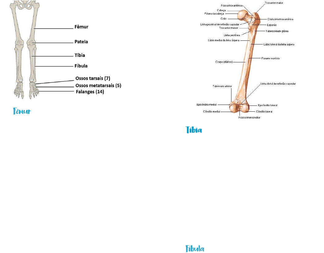 APG 13 1- Compreender a anatomia dos ossos, músculos e articulações dos membros inferiores; 2- Analisar a histologia das articulações. OSSOS 1. Cabeça do fêmur. 2. Trocante maior. 3. Trocante menor. 4. Colo do fêmur. 5. Fóvea da cabeça do fêmur. 6. Corpo do fêmur. 7. Epicôndilo lateral. 8. Epicôndilo medial. 9. Côndilo lateral. 10. Côndilo medial. 11. Face patelar. 12. Fossa intercondilar. 1. Eminência intercondilar. 2. Tuberosidade da tíbia. 3. Côndilo lateral. 4. Côndilo medial. 5. Face articular inferior. 6. Face articular do maléolo medial. 7. Maléolo medial. 1. Cabeça da fíbula. 2. Colo da fíbula. 3. Maléolo lateral. 4. Fossa do maléolo lateral 5. Face articular do maléolo lateral. 6. Patela. 1. Calcâneo. 2. Tálus. 3. Navicular. 4. Cubóide. 5. Cuneiforme (medial, intermédio, lateral). 6. Ossos metatarsais I, II, III, IV, V (cabeça, corpo e base). 7. Falanges proximais. 8. Falanges médias. 9. Falanges distais. ARTICULAÇÕES Conexão do fêmur e cíngulo (cabeça do fêmur com o acetábulo da pelve). É uma articulação sinovial esferóidea multiaxial forte e estável. – permite uma grande amplitude de movimentos, mas não tem tanta mobilidade – 2ª mais móvel. Aguenta todo peso do corpo em pé – sustentação. Movimentos ocorrem em todos os eixos possíveis – mais limitados, ligamentos e cavidade profunda. Ligamento Iliofemoral – É o mais forte do corpo. Está intimamente unido a cápsula e serve para reforça-la. Ele impede a hiperextensão da articulação do quadril. Ligamento Pubofemoral – faz com que haja um impedimento de uma abdução excessiva. Ligamento Isquiofemoral – mais fraco Ligamento da Cabeça do Fêmur Conexão entre fêmur e tíbia. É a maior e a mais superficial. É basicamente uma articulação sinovial do tipo gínglimo. Permite flexão, extensão, rotação medial e lateral. É formada por 3 articulações: ● Duas articulações tibiofemoral (lateral e medial) → entre os côndilos laterais e mediais do fêmur e da tíbia. ● Uma articulação femoropatelar → intermediária entre a patela e o fêmur. Do ponto de vista mecânico essa articulação é uma articulação fraca – muito comum ter lesões. A sua estabilidade depende da força das ações dos músculos e dos ligamentos que unem o fêmur e a tíbia. Ligamentos Intra-Articulares: - Ligamento Cruzado Anterior: É muito pequeno, o mais fraco dos ligamentos cruzados. Tem função de impedir o movimento de deslizamento anterior da tíbia ou posterior do fêmur, além da hipertensão do joelho. - Ligamento Cruzado Posterior: É o mais forte dos ligamentos cruzado. Função: O LCP é estirado durante a flexão da articulação do joelho, impedindo o deslocamento anterior do fêmur sobre a tíbia ou o deslocamento posterior da tíbia sob o fêmur. Também ajuda a impedir a hiperextensão do joelho. Meniscos – São placas semilunares de fibrocartilagem – atuam absorvendo choques e impactos. Ficam na face articular da tíbia. Função de preenchimento, estabilização, absorção do impacto, aumento da área de contato, auxiliar de lubrificação. A tíbia e a fíbula estão unidos por duas articulações: ● Articulação tibiofibular → é sinovial plana entre a face articular plana na cabeça da fíbula e uma face articular semelhante em posição posterolateral no côndilo lateral da tíbia. ● Sindesmose tibiofibular → é fibrosa composta. É a união fibrosa da tíbia e fíbula por meio da membrana interóssea (que une os corpos) e os ligamentos tibiofibulares anterior, interósseo e posterior. – É um ligamento sinovial do tipo gínglimo. Entre as extremidades distais da tíbia e da fíbula e a parte superior do tálus. Dorsiflexão e flexão. ● Articulações intertarsais → Características planas, onde os ossos que compõem o tarso, deslizam levemente entre eles. ● Articulação calcaneocubóidea → sinovial plana, inversão, eversão e circundução. A extremidade anterior do calcâneo articula-se com a face posterior do cubóide. ● Articulação cuneonavicular → face anterior do navicular articula-se com as faces posteriores dos cuneiformes. Pouco movimento. ● Articulação tarsometatarsal → ossos tarsais anteriores articulam-se com as bases dos ossos metatarsais. Deslizamento. ● Articulação intermetatarsal → as bases dos ossos metatarsais articulam-se entre si. Pouco movimento. ● Articulação metatarsofalângicas → as cabeças dos ossos metatarsais articulam-se com as bases das falanges proximais. Flexão, extensão e alguma abdução, adução e circundução. ● Articulação interfalângica → A cabeça de uma falange articula-se com a base da outra distalmente. Flexão e extensão. MÚSCULOS MÚSCULO ORIGEM INSERÇÃO AÇÃO AÇÃO Obturador externo Face externa da Membrana obturadora Depressão profunda inf. ao trocanter maior (fossa trocantérica) do fêmur Rotação lateral e abdução da coxa na artic. do quadril Nervo obturador Gêmeo superior Espinha isquiática Face medial do trocanter maior do fêmur Rotação lateral e abdução da coxa na artic. do quadril Nervo para o M. obturador interno Gêmeo inferior Tuberosidade isquiática Face medial do trocanter maior do fêmur Rotação lateral e abdução da coxa na artic. do quadril Nervo para o M. quadrado femoral Quadrado femoral Tuberosidade isquiática Elevação superior à porção média da crista inter trocantérica (tubérculo quadrado) no fêmur posterior Rotação lateral e estabilização da artic. do quadril Nervo para o M. quadrado femoral Adutor longo Crista púbica e sínfise púbica Linha áspera do fêmur Adução e flexão da coxa na artic. do quadril e rotação da coxa* AMR: extensão da coxa Nervo obturador Adutor curto Ramo inferior do púbis Metade superior da linha áspera do fêmur Adução e flexão da coxa na artic. do quadril e rotação da coxa* AMR: extensão da coxa Nervo obturador Adutor magno Ramo inferior do p
