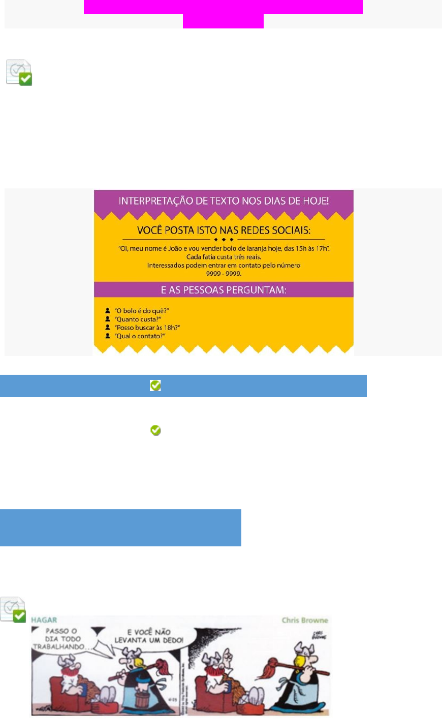 INTERPRETAÇÃO E PRODUÇÃO DE TEXTOS TELEAULA I Pergunta 1 0 em 0 pontos Para o significado de suas comunicações, as pessoas recorrem a estratégias textuais que organizam as informações para que o receptor entenda, mas para isso é necessário conhecer o código em que a mensagem está sendo veiculada. Desse modo, considerando a figura, identifique uma ordem das etapas de leitura para entender a mensagem a seguir: Fonte: Grupo Unip – Objetivo. Resposta Selecionada: b. Compreensão e interpretação. a. Decodificação e codificação. b. Compreensão e interpretação. c. Interpretação e compreensão. d. Construção e desconstrução. e. Desconstrução e construção. Comentário da resposta: Resposta: B Pergunta 2 0 em 0 pontos · Fonte: SARMENTO, L. L. Oficina de redação. 3. ed. São Paulo: Moderna, 2006, p. 112. Na tirinha, quando Helga fala “E você não levanta um dedo”, é correto afirmar que a resposta do Hagar é tomada em seu sentido: Resposta Selecionada: b. Denotativo. a. Conotativo. b. Denotativo. c. Investigativo. d. Conjuntivo. e. Nominativo. Comentário da resposta: Resposta: B Pergunta 3 0 em 0 pontos Fonte: BECK, A. Armandinho. São Paulo: Matrix, 2017, p. 27. Considerando-se a situação de comunicação comum do gênero contos de fadas e o contexto específico da contação de histórias infantis, o termo “agrotóxico” tem função predominantemente no contexto de: Resposta Selecionada: b. Agricultura. a. Obra de arte. b. Agricultura. c. Indústria. d. Medicina. e. Esportes. Comentário da resposta: Resposta: B Pergunta 4 0 em 0 pontos Fonte: SARMENTO, L. L. Oficina de redação. 3. ed. São Paulo: Moderna, 2006, p. 416. A noção de gêneros textuais é apoiada em práticas sociais e em saberes socioculturais, porém podem sofrer variações, na medida em que um texto representativo de um gênero pode incorporar outras características. Desse modo, considerando o anúncio, indique a exemplificação: Resposta Selecionada: c. Intertextualidade. a. Sustentabilidade. b. Informatividade. c. Intertextualidade. d. Solidariedade. e. Aplicabilidade. Comentário da resposta: Resposta: C