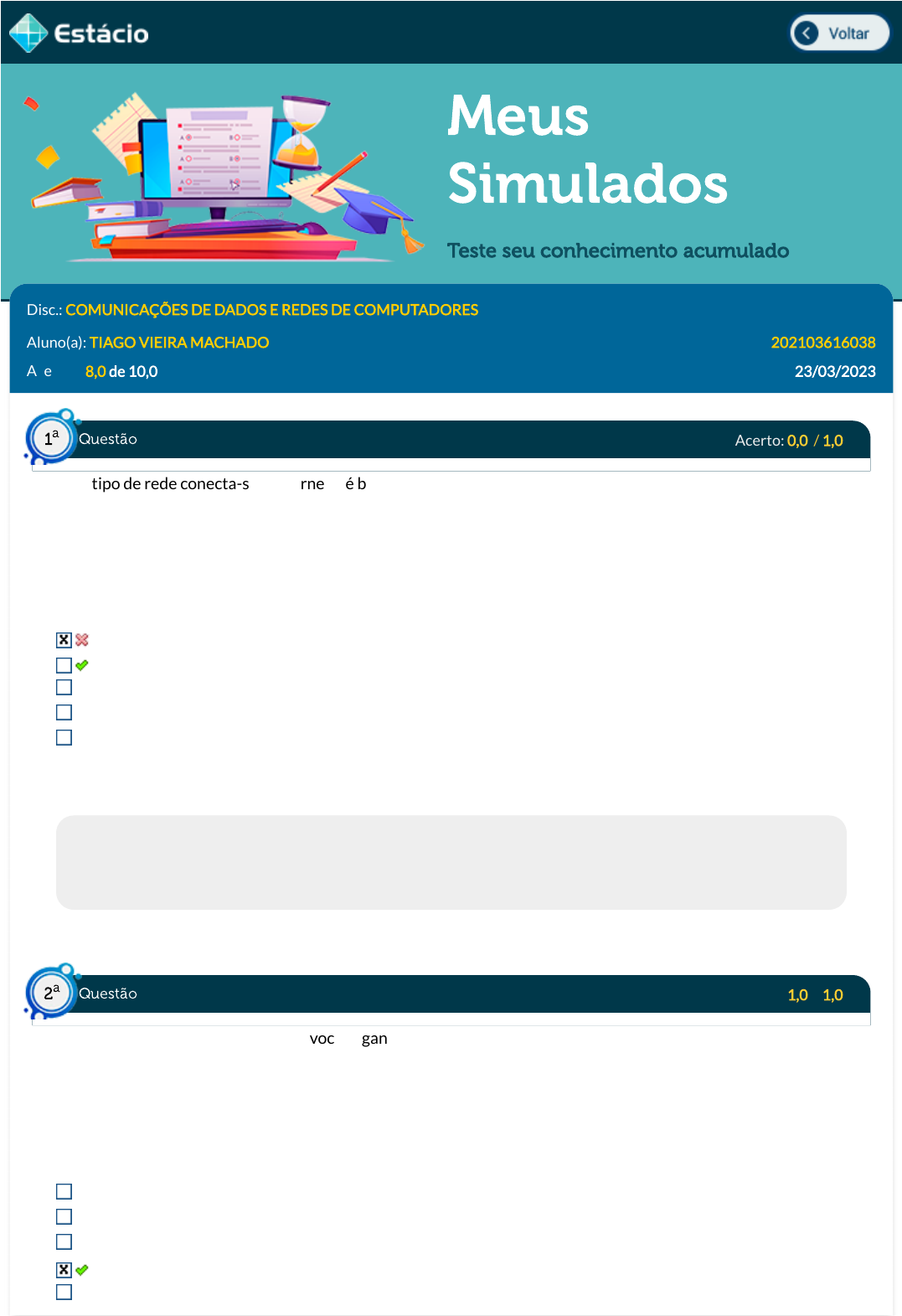 31/03/2023, 10:57 Estácio: Alunos https://simulado.estacio.br/alunos/ 1/5 Meus Simulados Teste seu conhecimento acumulado Disc.: COMUNICAÇÕES DE DADOS E REDES DE COMPUTADORES Aluno(a): TIAGO VIEIRA MACHADO 202103616038 Acertos: 8,0 de 10,0 23/03/2023 Acerto: 0,0 / 1,0 Esse tipo de rede conecta-se à internet e é bastante usado tanto em ambientes residenciais quanto em empresas e em lugares públicos. Disponível em: https://canaltech.com.br/infra/lan-wlan-man-wan-pan-conheca-os-principais-tipos-de-redes/ . Acesso em: 19 set. 2022. Adaptado. Acerca dos principais tipos de redes, é correto a�rmar que o termo WLAN se refere a: Uma rede local. Uma rede local sem �o. Uma rede metropolitana. Uma rede de longa distância sem �o. A rede de todas as redes. Respondido em 23/03/2023 07:33:03 Explicação: A resposta correta é: Uma rede local sem �o. Interessante citar que Soluções de múltiplo acesso ao meio físico são empregadas tanto nas WLANs quanto nos uplinks de redes móveis celulares. Acerto: 1,0 / 1,0 A topologia de rede é a forma como você organiza os elementos de uma rede de comunicação. A estrutura topológica pode ser representada física ou logicamente. Disponível em: https://www.internationalit.com/post/topologia-de-rede-conhe%C3%A7a-os-principais-tipos . Acesso em: 19 set. 2022. Adaptado. Acerca da topologia em estrela, marque a alternativa correta. É amplamente utilizada em conexões BGP. Permite comunicação direta entre quaisquer pares de nós. Apresenta maior redundância do que a topologia em anel. Tem o seu desempenho dependente do nó central. Foi empregada no surgimento da Internet. Questão1 a Questão2 a https://simulado.estacio.br/alunos/inicio.asp javascript:voltar(); 31/03/2023, 10:57 Estácio: Alunos https://simulado.estacio.br/alunos/ 2/5 Respondido em 23/03/2023 07:37:38 Explicação: A topologia em estrela é caracterizada por um elemento central. Logo, seu desempenho dependente do nó central Acerto: 0,0 / 1,0 As camadas do modelo OSI têm seus serviços de�nidos, elas sabem o que devem fazer, entretanto, não estão de�nidos protocolos, ou o como fazer. A camada que é responsável por garantir a comunicação con�ável entre processos é a: Sessão. Rede. Enlace. Transporte. Todas as alternativas estão incorretas. Respondido em 23/03/2023 07:38:25 Explicação: A resposta correta é: Transporte. A camada de transporte é uma das camadas do modelo de referência OSI (Open Systems Interconnection) e é responsável por garantir a entrega con�ável dos dados da origem ao destino. Ela atua como intermediária entre as camadas de aplicação e de rede, oferecendo serviços a camada de aplicação e usando os serviços da camada de rede. Acerto: 1,0 / 1,0 As redes de computadores são estruturadas utilizando o conceito de camadas, com o objetivo de facilitar a manutenção e evolução dos serviços de redes. Acerca do conceito de camadas de rede podemos dizer que: Todas as alternativas estão incorretas. Permitiu a diminuição no volume de dados a ser transmitido pelo meio de comunicação. Uma camada utiliza o serviço da camada superior e oferece para a camada inferior. Tornou o problema de transmissão de dados mais complexo do que se fosse desenvolvido em uma camada única. Uma camada utiliza o serviço da camada inferior e oferece para a camada superior. Respondido em 23/03/2023 07:41:10 Explicação: A resposta correta é: Uma camada utiliza o serviço da camada inferior e oferece para a camada superior. Uma camada utiliza o serviço da camada inferior e oferece serviço para a camada superior, permitindo que cada camada se concentre nas tarefas especí�cas que lhe são atribuídas e abstraia o detalhamento das camadas inferiores. O conceito de camadas não visa necessariamente a diminuição do volume de dados transmitidos, mas sim a divisão das tarefas em camadas especí�cas para facilitar a manutenção e evolução dos serviços de redes. É a camada superior que utiliza o serviço da camada inferior e não o contrário. Questão3 a Questão4 a 31/03/2023, 10:57 Estácio: Alunos https://simulado.estacio.br/alunos/ 3/5 O conceito de camadas, na verdade, tornou o problema de transmissão de dados mais fácil de resolver, pois permite que cada camada se concentre nas tarefas especí�cas e facilitou a evolução dos serviços de redes. Acerto: 1,0 / 1,0 O protocolo UDP apresenta um cabeçalho extremamente simples utilizado precipuamente por aplicações como DNS, SNMP e TFTP. Acerca das características do protocolo UDP, marque a alternativa correta: Realiza retransmissões para garantir a entrega de dados. Não estabelece conexões para troca de dados. Responsável pela ordenação dos bits na camada física. Utilizado por aplicações que requerem uma comunicação con�ável, com a garantia da entrega de todos os pacotes. Trata-se de um protocolo de nível de enlace. Respondido em 23/03/2023 07:44:16 Explicação: O UDP é um protocolo sem estado e não orientado à conexão, sendo um protocolo da camada de Transporte. Acerto: 1,0 / 1,0 Quando o hospedeiro de origem vai enviar os dados, das mais diversas aplicações que estejam rodando, a camada de transporte vai dividir esses pacotes de informações em segmentos, antes de enviar para a camada de rede. Porém, antes disso, a camada de transporte precisa colocar no cabeçalho dos segmentos os dados do hospedeiro bem como a porta na qual cada segmento deve ir. Disponível em: https://www.programacaoprogressiva.net/2019/02/Portas-Multiplexacao-Demultiplexacao- Redes-de-Computadores-Curso.html. Acesso em: 22 set. 2022. Adaptado. Quanto ao processo de multiplexação, marque a alternativa correta. A multiplexação ocorre somente em protocolos sem conexão, como o UDP. A multiplexação ocorre somente em protocolos orientados à conexão, como o TCP. Se o protocolo IP for utilizado, não será necessária a multiplexação na camada de transporte. Os protocolos de transp