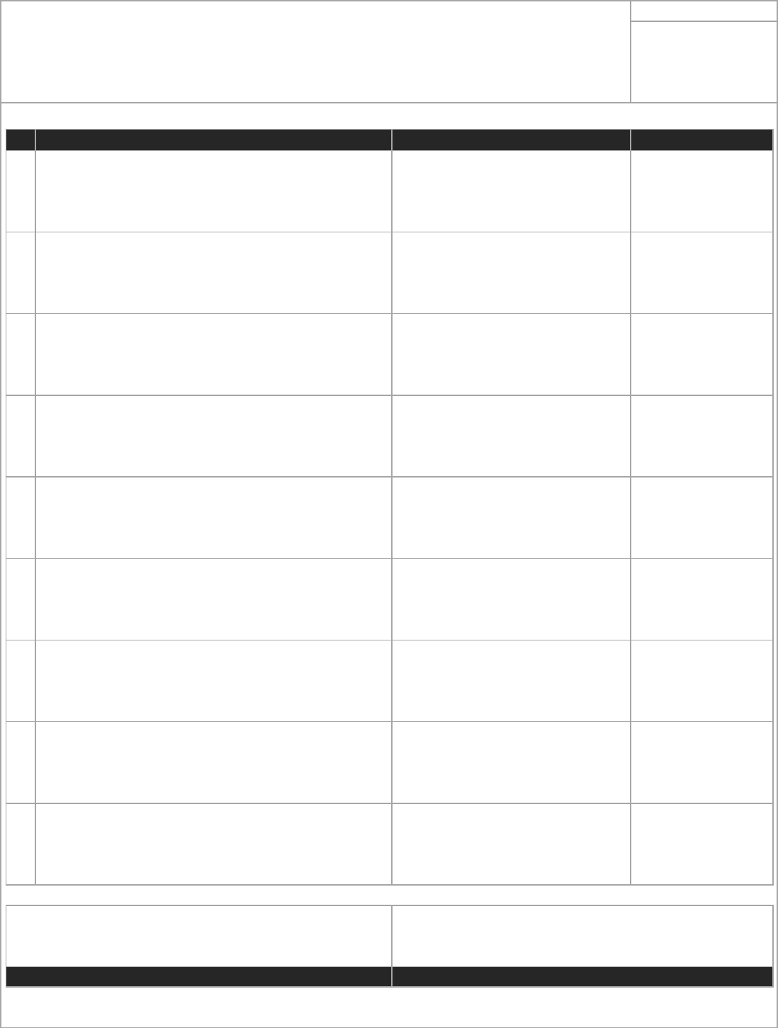 Planilha1 ISO 9001 - AUDITORIA DE COMPRA CHECKLIST Número do Formato: 5 # Pontos Checklists Observações Status 01 há procedimentos de compra são liberados para todos os povos de compra? 02 Quais são as sequências e interação dos procedimentos da compra? 03 Há recuos do departamento de usuários considerados para a compra do material? Se não qual é a base do material de compra? 04 Existe pedido de compra aprovado por pessoa autorizada? Ou aprovações do departamento de usuários? 05 As compras planejadas para os insumos e recebimentos de matérias-primas foram seguidas adequadamente? 06 Como as cobranças estão sendo rastreadas em relação ao pedido de compra? Existe saldo de material/quantidade pendente do fornecedor onde a identificação e o registro são mantidos? 07 todas as guias de remessa/contas de materiais estão registradas corretamente? 08 Qual é o procedimento para avaliação de fornecedores? A avaliação do fornecedor está atualizada? O que é método? Qualidade, prazo e entrega são considerados? 09 Existe avaliação da compra é preparada? Mantido e atualizado? Assinatura dos Auditores Auditado Assinatura