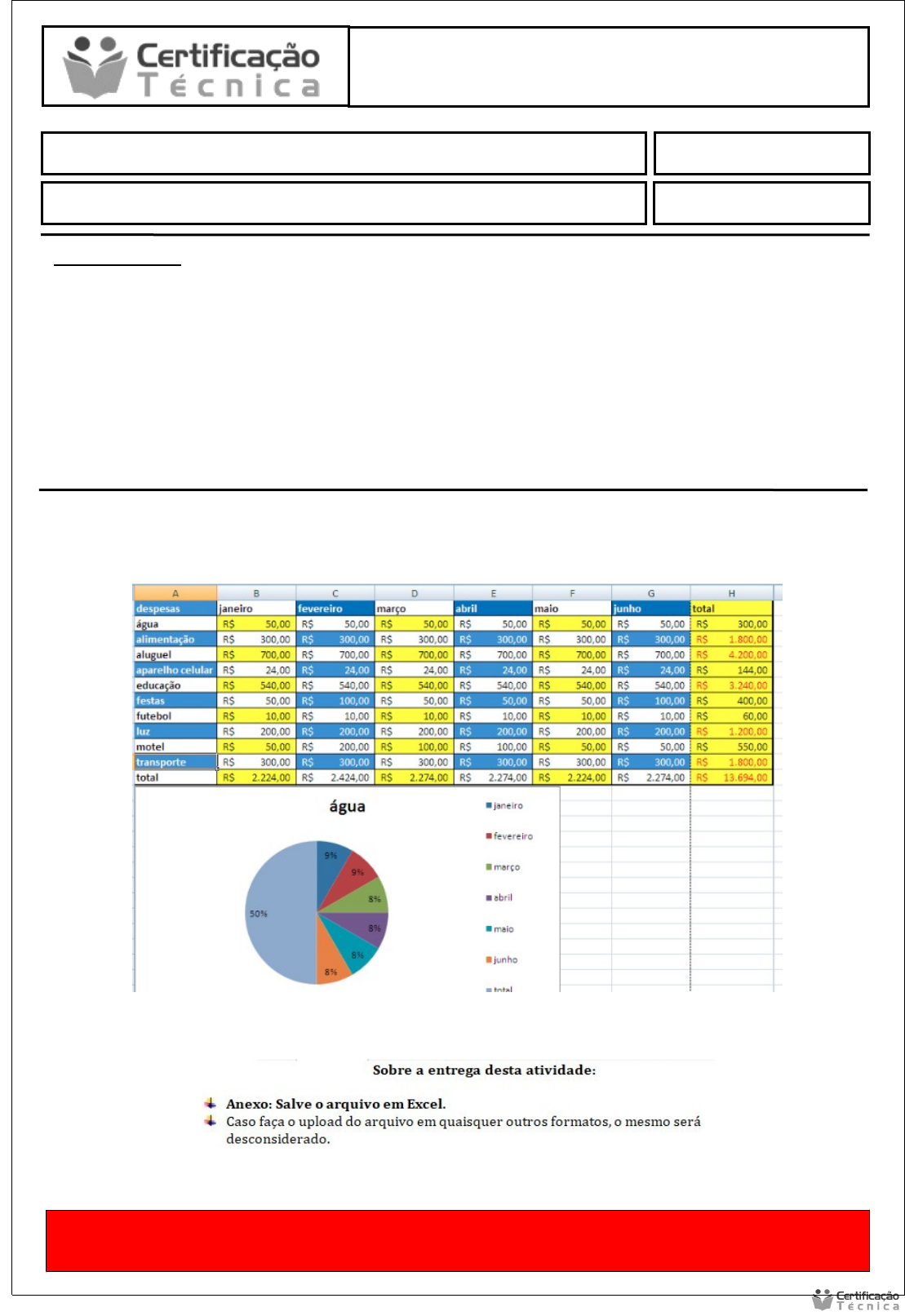 Pratica em Introdução ao Excel - rd Data: 29 / 03 / 2023 Aluno (a): Karine Gabriele Valeriano Silva Avaliação Prática INSTRUÇÕES: · Esta Avaliação contém 02 (duas) questões para execução, totalizando 10 (dez) pontos; · Baixe o arquivo disponível com a Atividade Pratica; · Você deve preencher dos dados no Cabeçalho para sua identificação: · Nome / Data de entrega. · O trabalho deve ser desenvolvido em outro arquivo; · Ao terminar grave o arquivo com o nome Atividade Prática; · Quando solicitado · Envio o arquivo pelo sistema no local indicado; · Em caso de dúvidas consulte o seu Tutor. 1 . Desenvolva a tabela abaixo no Excel. Use as formula de soma na coluna TOTAL Lembre-se que você possui uma atividade pratica para responder sobre o roteiro executado. CUIDADO, as atividades propostas são alteradas para impedir plágios, os quais quando confirmados penalizam o aluno com a interrupção do acesso por 30 dias. Lembre-se que você possui uma atividade pratica para responder sobre o roteiro executado. CUIDADO, as atividades propostas são alteradas para impedir plágios, os quais quando confirmados penalizam o aluno com a interrupção do acesso por 30 dias.