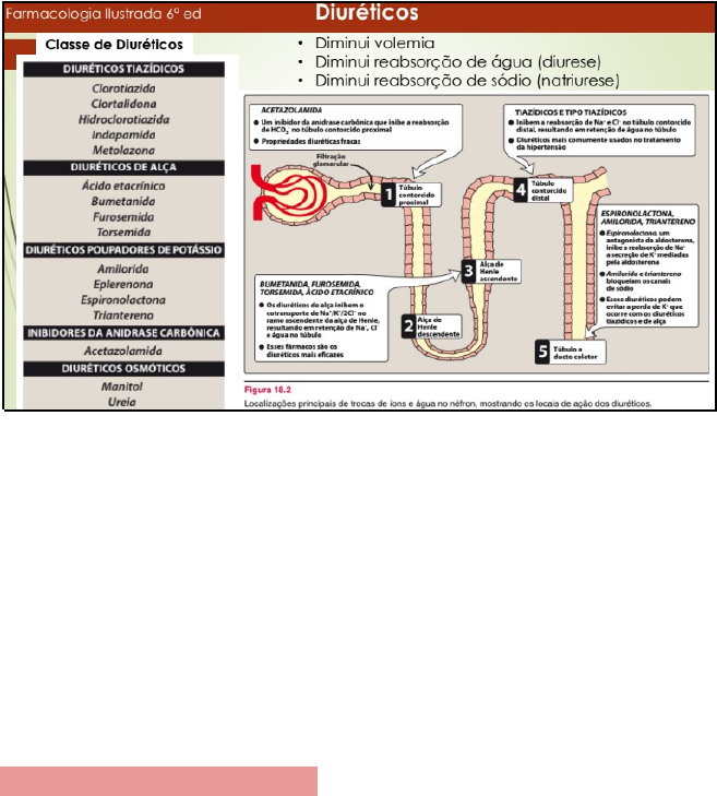 06.10 - FARMACO I - PROF. JU Bloqueadores adrenérgicos e fármacos de ação central, diuréticos Diuréticos - fármacos que aumentam o volume urinário Caso clínico 1 H.F.R, 35 anos, sexo masculino, procurou atendimento médico com queixa de dispneia e edema de membros inferiores. Relata que nos últimos 6 meses, a dispneia que era aos esforços moderados rapidamente progrediu até estar presente no repouso. Anamnese e exames complementares levaram ao diagnóstico de insuficiência cardíaca congestiva (ICC) de etiologia a ser esclarecida. Foram prescritos 80mg de furosemida, 0,125 mg de digoxina, 50 mg de losartana, 25 mg de espironolactona, 50 mg de hidroclorotiazida e 300mg de ranitidina diários, além de metoprolol (150 mg/dia). Em relação aos tratamentos prescritos, responda a questão a seguir: • Quais dos fármacos acima são da classe dos diuréticos? Explique seus respectivos mecanismos de ação. Espironolactona, hidroclorotiazida. Inibem a reabsorção de sódio, o qual fica acumulado no túbulo e puxa água, aumentando o volume urinário. Aumento de íons sódio, potássio e cloreto na urina, com aumento de água para manter o equilíbrio osmótico. Diuréticos Tiazídicos: os três primeiros são os que mais são utilizados na clínica (Clorotiazida, Clortalidona e Hidroclorotiazida) →os tiazídicos agem no túbulo contorcido distal Diuréticos de alça: o mais conhecido é a Furosemida; agem na alça de Henle ascendente Diuréticos poupadores de potássio: o mais conhecido é a Espironolactona, que é a mais utilizada. Amilorida em associação com Hidroclorotiazida. Inibidores da anidrase carbônica: Acetazolamida; age no túbulo contorcido proximal; estimula a excreção de bicarbonato pela urina. Muito utilizada em casos de intoxicação por um fármaco ácido. Diuréticos osmóticos: Manitol e Ureia DIURÉTICOS TIAZÍDICOS →no túbulo contorcido distal: há cotransportador de sódio e cloreto e transportador de cálcio; fisiologicamente, quando os íons chegam nessa região ocorre reabsorção de sódio e cálcio e cloreto. Íon cloreto tem seu próprio transportador; sódio é reabsorvido através da ação da bomba sódio potássio protease, e cálcio também, através de cotransportador de sódio voltar para a corrente sanguínea →mecanismo de ação dos tiazídicos: bloqueia o cotransportador NCC (transportador de sódio e cloreto), “prendendo” sódio e cloreto aumentando a excreção de sódio e cloreto. Além disso, um dos efeitos do bloqueio do NCC é aumentar a reabsorção de cálcio, assim o paciente pode apresentar aumento de concentração de cálcio plasmático. →não interfere no transporte de potássio de forma tão significativa; paciente pode ter uma leve perda de potássio mas não é tão grande quanto o que ocorre com diurético de alça →aumento de reabsorção de cálcio: hipercalcemia →normalmente é de primeira escolha Caso clínico 2 Jovem, 19 anos, no pronto atendimento de um hospital relata história de febre e dor de garganta há 12 dias. Há dois dias começou a apresentar inchaço nos tornozelos. Ao exame clínico nota-se aumento das tonsilas palatinas com presença de pontos de pus nas mesmas, edema nos tornozelos e sopro cardíaco. Solicitado ecocardiograma que mostrou alteração de função da valva atrioventricular esquerda. Para este paciente foi prescrito antibiótico, furosemida e cloreto de potássio. Com base no caso responda: a) Porque a furosemida e cloreto de potássio foram prescritos como tratamento para este paciente? Porque a furosemida causa bastante perda de potássio, e para não sentir tanto essa perda, o médico prescreve junto o cloreto de potássio. DIURÉTICOS DE ALÇA →bloqueia o cotransportador de sódio, cloreto e potássio →acúmulo de potássio na região da alça, por isso a perda de potássio é tão significativa →fisiologicamente, potássio sai, cloreto é reabsorvido, tem equilíbrio elétrico dentro da célula, o que faz com que ocorra reabsorção de cálcio e magnésio; bloqueio do cotransportador causa desestabilização, o que não permite mais a reabsorção de cálcio e magnésio; logo o paciente elimina na urina ordem de potência: diuréticos de alça > tiazídicos > antagonistas de receptores Caso clínico 3 Homem, 45 anos, tem hipertensão faz uso de diurético tiazídico para o controle da pressão arterial elevada. Nos últimos meses, periodicamente, tem tido câimbras noturnas. Os sintomas diminuíram com a inclusão de espironolactona ao diurético tiazídico. A inclusão do segundo fármaco foi feita para alcançar qual das seguintes opções? a) Reduzir a perda de sódio b) Reduzir perda de cálcio c) Reduzir a perda de potássio d) Reduzir hiperuricemia DIURÉTICOS POUPADORES DE POTÁSSIO →aldosterona: age em receptores no citosol; a aldosterona aumenta a expressão do transportador de sódio e da bomba de sódio e potássio ATPase, consequentemente, mais sódio começa a voltar para a célula, aumenta bastante a expressão da sódio potássio ATPase, por isso pode causar hipertensão arterial (aumento de volemia) →potássio deve sair, começa a sair muito potássio para o lúmen; corre o risco de hipertensão; glicocorticoide age no receptor semelhante ao receptor de aldosterona, também estimula a expressão dos mesmos receptores com muita retenção de sódio (isso explica o inchaço dos pacientes) Espironolactona - é antagonista do receptor de aldosterona; logo a expressão do transportador de sódio e bomba sódio e potássio ATPase diminui, ou seja menos sódio é reabsorvido e menos potássio é eliminado; efeito diurético dele não é tão potente - não chega a bloquear o transportador de sódio, apenas reduz a expressão Amilorida e Triantereno - também são poupadores de potássio, porém o mecanismo de ação é diferente. Bloqueiam direto o transportador de sódio no túbulo coletor. São mais fracos quando comparados com a Espironolacton
