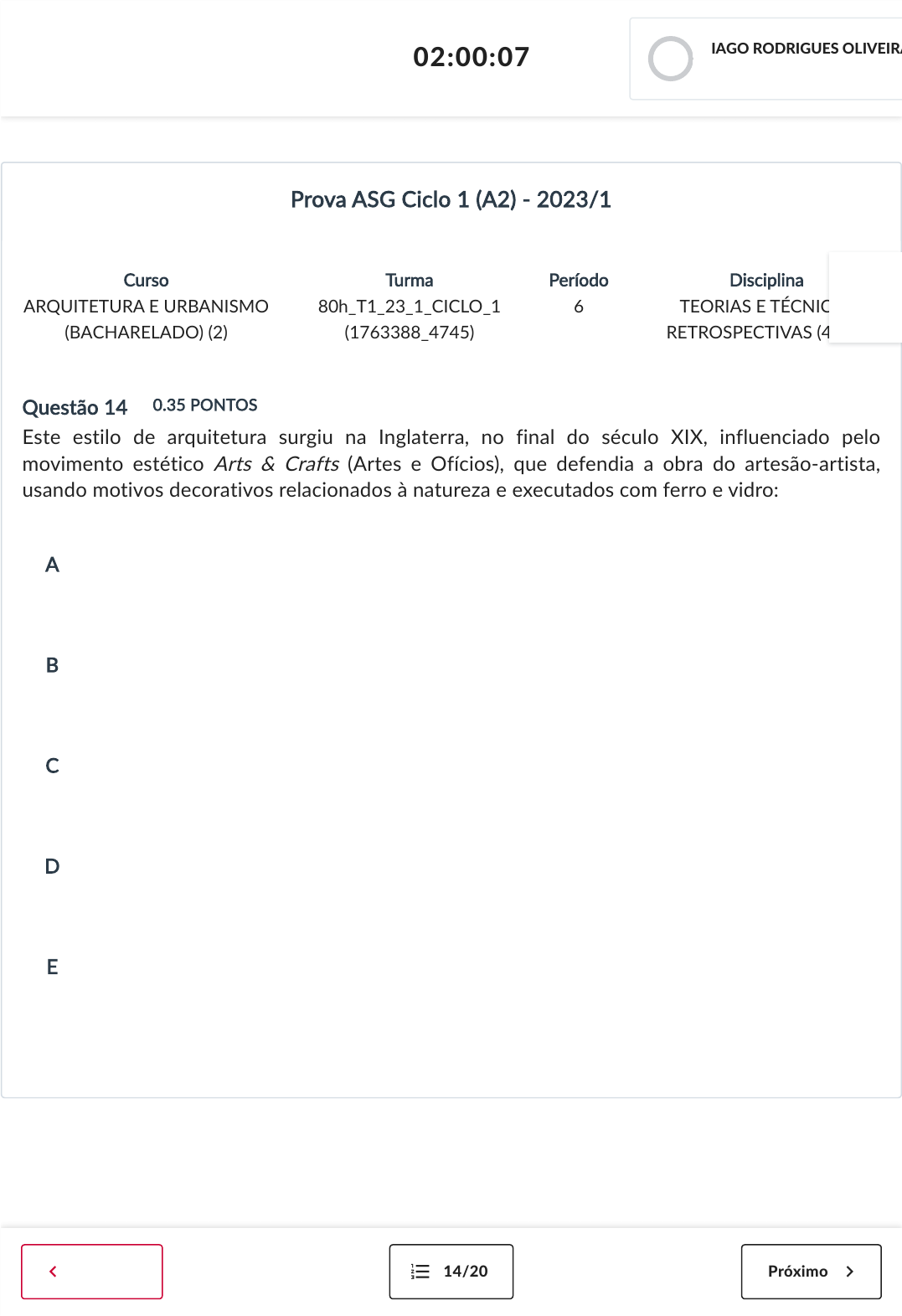 01/04/2023, 00:11 AvaliA Online :: AvaliA Online https://unifran.grupoa.education/avalia-online/app 1/1 Prova ASG Ciclo 1 (A2) - 2023/1 Curso ARQUITETURA E URBANISMO (BACHARELADO) (2) Turma 80h_T1_23_1_CICLO_1 (1763388_4745) Período 6 Disciplina TEORIAS E TÉCNICAS RETROSPECTIVAS (4745) Questão 14 Este estilo de arquitetura surgiu na Inglaterra, no final do século XIX, influenciado pelo movimento estético Arts & Crafts (Artes e Ofícios), que defendia a obra do artesão-artista, usando motivos decorativos relacionados à natureza e executados com ferro e vidro: A B C D E 0.35 PONTOS Arquitetura Neoclássica Arquitetura Neogótica Arquitetura Art Nouveau Arquitetura Neocolonial Arquitetura Art Déco Anterior 14/20 Próximo IAGO RODRIGUES OLIVEIRA 23_2353860102:00:07 IO
