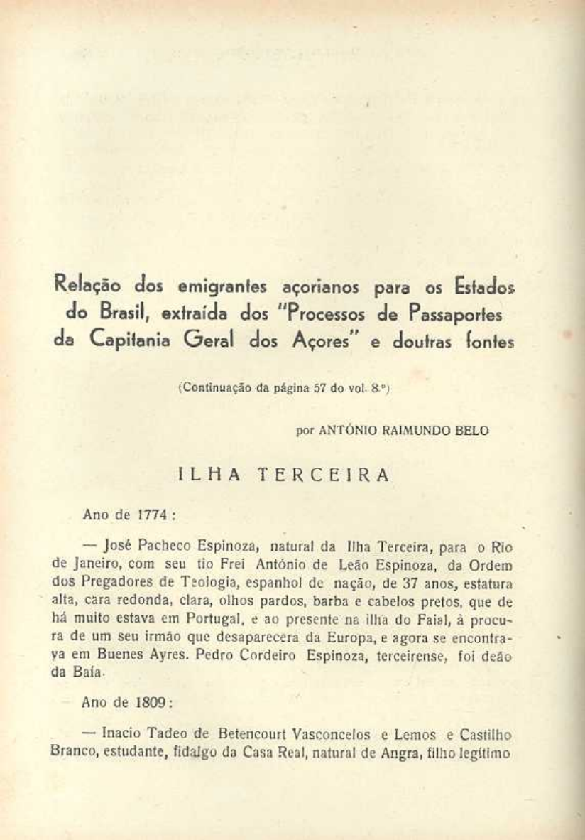 Relação dos emigrantes açorianos para os Estados do Brasil, extraida dos "Processos de Passaportes da Capitania Geral dos Açores" e doutras fontes iContinuação da página 57 do vol. 8.º por ANTÓNIO RAIMUNDO BELO ILHA TERCEIRA Ano de I774: � José Pacheco Espinoza, natural da Ilha Terceira, para o Rio de Janeiro, com seu tio Frei António de Leão Espinoza, da Ordem dus Pregadores de Teologia, espanhol de nação, de 37 anos, estatura alta, cara redonda, clara, olhos pardos, barba e cabelos pretos, que de há muito estava em Portugal, e ao presente na ilha do Faial, à procu- ra de um seu irmão que desaparecera da Europa, e agora se encontra- va em Buenes Ayres. Pedro Cordeiro Espinoza, terceirense, foi deão da Baia. Ano de 1800: � Inacio Tadeo de Betencourt Vasconcelos e Lemos e Castilho Branco, estudante, fidalgo da Casa Real, natural de Angra, filho legitimo DA ILHA TERCEIRA 71 do ex-governador do Castelo de São João Batista, Vital de Betencourt Vasconcelos e Lemos Castilho Branco, ao Rio de Janeiro, a negocio da utilidade de seu pai. ânu de 1810: Neste ano viveria nos Estados da Amética Portuguesa, Andino José Nunes Quinhão, casada cem Joaquina Rosa, que residia na Vila da Praia. Anu de 1811: � João Inácio Tristão, presbítero du habito de São Pedro, ao Rio de Janeiro. Ano de 1812: � Francisco Costa, de Angra, à Córte do Rio de Janeiro, à pro- curar o amparo de um seu � Francisca Mariana, viuva de António Vieira, da Vila da Praia, ao R. de Janeiro. � Pedro Inacio Gomes Toste, da Ribeirinha. ao R. de Janeiro, a tratar de certas dependencias. �- Hilário Coelho de Meto, filho de Vicente Coelho de Melo, dos Áltares, R. de Janeiro, a certa cobrança de dinheiro. � Teodoro José Teles, filho de Antôniv José Teles, de Angra, com Manuel Diogo de Menezes, ao R. de Janeiro. � Francisco Vieira da Mota, de S. Bartolomeu, ao Maranhão, � Antônio Carduso Ferreira, do Arícito, das Fontinhas, pata à Córte e cid. do R. de Janeiro. � Manuel Diogo Moniz de Sá, com sua familia, paro à cid. do R. de Janeiro. � Padre Joaquim José da Silveira Barcelos, presbítero secular, à mesma cidade. � D. Francisca Ursula Borges, de Angra, para a cid. do R. de Janeiro. � João Placido Teixeira, presbitero secular, para a Córte e cid. do R. de Janeiro, com seu criado Antônto José Mendes. � José Joaquim Leandro, filho de Jusé António Fernandes e de mao. A" 72 BOLETIM DO INSTITUTO HISTÓRICO sua mulher Maria Joaquina, para a cidade do Rio de Janeiro, para companhia dum irmão, que o deseja beneficiar. Ano de 1813: -� Antônio Pereira, solteiro, filho de Manuel Pereira e de sua mulher Maria do Rosário, já defuntos, de Santa Barbara, para a cidade do Rio de Janeiro, aonde tem um irmão. � Francisco Manuel Paes de Sande de Castro, para a Côrte e cidade do Rio de Janeiro. � Luiz de Freitas Borges, do Porto Judeu, à cidade do Rio de Janeiro, pelo tempo de 2 anos, Ano de 1814: � Joaquim Francisco, a Pernambuco, ende os pais tinham bens, filho de António Francisco Machado e de sua mulher Mariana Josefa, de Santa Bárbara. (Procuração de 23 de Dez, no tabelião Matos, de Angra). � Manuel Machado Ferreira, da Vila da Praia, à Baia. � Francisco Cardoso, de 12 anos. filho de Manuel Cardoso, da Vila da Praia, para a Vila da Caxoeira, recôncavo da cidade da Baia, para seu tio Manuel Machado Henrique, que o mandara buscar. � José Bernardo Lopes, de Angra, para a companhia de seus filhos Antônio Jacinto Lopes e Joaquim Guilherme Lemos Lopes, no Rio de Janeiro. � Manuel Tomaz de Betencaurt Vasconcelos Corte-Real, Fidalgo Cavaleiro da Casa de S. A. R., natural de Angra, ao Rio de Janeiro, a tratar de negócios de importância. � Luiz Gomes Pamplona Machado Corte-Real, ao Rio de Janei- ro, à negócio da sua utilidade. Ano de 1816: � João Ferreira de Aguiar, das Lagens, ao Rio de Janeiro. � Padre Jerónimo Francisco de Mendonça Ribeiro, de Angra, ao Rio de Janeiro. � João Cardoso Leal, filho do Capitão João Cardoso Leal, Juiz Ordinário da Vila da Praia, morador nas Lagens, alferes da 4a DA ILHA TERCEIRA 73 Companhia do Regimento de Milicias do termo da Praia, ao Rio de Janeiro, onde tem um tio por nome Manuel Leal Godinho. Ano de 1818: � José Borges Machado do Canto, filho de José Borges Macha- do de Ataide, dos Biscoitos, à Baia, donde viera � Joaquina Rosa, viuva de Lourenço José, de Angra, à Baia, pa- ra a companhia dum sobrinho, que a mandara buscar. � Francisco Borges Machado de Ataide, filho do Sargento Mór Joaquim Borges Machado de Ataide v de sua mulher D. Francisca Margarida Vitorina, natural de S. Bartolomeu dos Regatos, para a Baia, convidado por um tio e dois irmãos � Capitão Jusé Constantino da Fonseca, ao Rio de Jansiro. - Jacinto de Sousa, filho de outro, para a Capitania do Espirito Santo. Ano de 1819: � Honório Machado d'Andrade, filho natural de Simplício Honó- rio Machado d'Andrade, já falecido, «com assistência de seu curador o Capitão Jnão Silveira Machado, que se tem aplicado na arte Nauti- ca, em que se acha prompto com destino a ir servir S. Magestade na Real Armada do Rio de Janeiro, aonde também serve seu tio paterno, o Capitão Tenente Teófilo Rogério Machado de Andrade». � José da Rocha Compasso, natural de São Mateus, Cruz Dou- rada, para a cidade do R de Janeiro, para a companhia de um seu tio. � José Cardoso de Melo, dos Altares, para a cidade do R. de Janeiro, para à companhia dum seu irmão que o mandou buscar. � Ana Rosa, escrava livre por falecimento de Manuel de Sousa Sequeira, da Vila da Praia, a Pernambuco. � [oão António do Rego, a Pernambuco. � Joaquim José Luiz e mulher Ana Joaquina, e suas filhas me- nores Luzia e Maria, do Posto Santo, à Baia. Ano de 1820: José Joaquim da Custa, de Angra, a Pernambuco. � José dos Santos, sapateiro, de Angra, a Pernambuco. 74 BOLETIM DO INSTITUTO HISTÓRICO � João de Sousa, solteiro, de Angra, a Pe