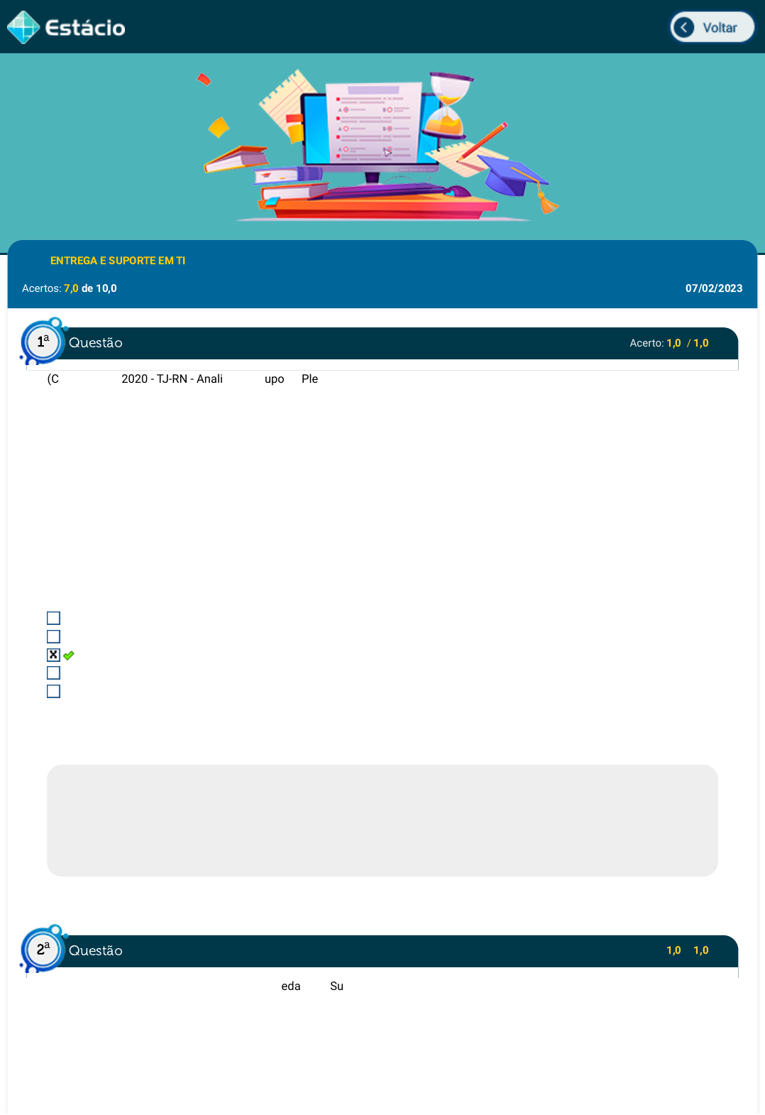 Disc.: ENTREGA E SUPORTE EM TI Acertos: 7,0 de 10,0 07/02/2023 Acerto: 1,0 / 1,0 (COMPERVE - 2020 - TJ-RN - Analista de Suporte Pleno - Infraestrutura) Sobre a ITIL V3, analise as informações ou as ações apresentadas em cada um dos itens abaixo. I. Requisitos de nível de serviço; plano de qualidade dos serviços, monitoração, revisão e informação; especificação do serviço. II. Plano de qualidade dos serviços, monitoração, revisão e informação; acordo de nível de serviço; alinhar ativos de serviço com produtos do cliente. III. Catálogo de serviços; acordos de nível operacional e contratos; programas de aperfeiçoamento do serviço; catálogo de serviços. IV. Monitoração, revisão e informação; gerenciamento do relacionamento com o cliente; acordo de nível de serviço. V. Portifólio de serviços; alinhar ativos de serviço com produtos do cliente; catálogo de serviços. Os itens que contêm apenas atividades do gerenciamento de nível de serviço são: II, III, V II, IV, V I, III, IV I, II, IV I, IV, V Respondido em 07/02/2023 05:16:05 Explicação: As principais atividades incluídas no gerenciamento do catálogo de serviços são as seguintes: concordar e documentar uma definição de serviço com todas as partes relevantes; interface e gerenciamento de portfólio de ; interface com os negócios e o gerenciamento de continuidade de serviços de TI nas dependências das unidades de negócios e seus processos de negócios com os serviços de TI de suporte; produzir e manter um catálogo de serviços e seu conteúdo; interface com o gerenciamento de relacionamento comercial e o gerenciamento de nível de serviço para garantir que as informações estejam alinhadas aos negócios e processos de negócios. Os demais itens não abrangem atividades do gerenciamento de nível de serviço. Acerto: 1,0 / 1,0 (IBADE - 2018 - Prefeitura de Cujubim - RO - Pedagogo Supervisor) Sobre a importância das novas tecnologias para a aprendizagem, leia as afirmativas a seguir. I. A disseminação e uso de tecnologias digitais, marcadamente dos computadores e da internet, favoreceu o desenvolvimento de uma cultura de uso das mídias e, por conseguinte, de uma configuração social pautada num modelo digital de pensar, criar, produzir, comunicar, aprender-viver; II. A evolução tecnológica tende a alterar com parlamentos, estabelecer processos comunicativos diversificados provocando uma interação que vai desde o contato entre pessoas diferentes como à relação entre conhecimentos e aprendizagens distintas; Questão1 a Questão2 a https://simulado.estacio.br/alunos/inicio.asp javascript:voltar(); III. A evolução tecnológica tende a alterar com parlamentos, estabelecer processos comunicativos diversificados, constituindo um risco à escola, haja vista a perda de foco e de atenção produzida nos alunos. Está correto apenas o que se afirma em: I I e III I e II II e III II Respondido em 07/02/2023 05:19:50 Explicação: A transformação digital e a necessidade de melhoria dos processos em diversas áreas e empresas apresenta uma nova forma de comunicação e relacionamento entre as partes, incluindo a de serviços de TI. Não há perda de foco entre as partes, mas sim uma nova era marcada pela digitalização dos negócios. Acerto: 1,0 / 1,0 (Concurso - Companhia de Processamento de Dados do Estado da Bahia) Para grande parte das organizações, a TI já faz muito mais do que a função de apenas entregar produtos de tecnologias. Assinale a alternativa que apresenta essa nova tarefa da TI nas empresas e organizações. Prática de ensino e desenvolvimento individual. Estratégia de negócio pessoal. Governança corporativa e contábil de entes da organização. Parcerias estratégicas com os demais setores de negócio. Gerenciamento de infraestrutura pessoal. Respondido em 07/02/2023 05:26:26 Explicação: A relação entre a área de Tecnologia da Informação (TI) e a área de negócios mudou bastante. Se no passado o objetivo da área de TI era manter a infraestrutura funcional, atualmente, o foco está em alinhar a área de Tecnologia de Informação às estratégias de negócios. A qualidade e a eficiência operacional se tornaram obrigatórias para as empresas, frente a um mercado tão competitivo, exigente e agressivo. Acerto: 1,0 / 1,0 (IADES - 2019 - CRF-TO - Analista de TI) Um dos objetivos da implantação da central de serviço, como descrita pela ITIL, é evitar que mudanças ocorram, fornecendo comunicação aos usuários quanto a mudanças evitadas. trabalhar em favor da prevenção de incidentes. não ter foco na satisfação do usuário. restaurar os serviços apenas quando necessário. dar suporte a mudanças, fornecendo comunicação aos usuários quanto ao agendamento de mudanças. Respondido em 07/02/2023 05:36:25 Explicação: A central de serviços tem como um dos objetivos a comunicação aos usuários quanto às mudanças, no que se refere ao agendamento, à informação do dia e horário, além de dar suporte para que a mudança ocorra de acordo com o planejado. As demais opções não são aplicáveis a esse objetivo. Questão3 a Questão4 a Acerto: 1,0 / 1,0 (IADES - 2014 - METRÔ - DF - Operador Metroferroviário Junior) Com relação à qualidade na prestação de serviços, sugere-se que os funcionários se adaptem ao tratamento ao cliente, para cada nível de formalidade. seja mensurado o grau de satisfação dos clientes, não sendo necessário medir o dos funcionários. os funcionários não se familiarizem com a estrutura organizacional, mas conheçam os serviços prestados. seja criado um processo de solução de problemas no qual cada funcionário saiba de uma etapa única do processo. sejam criadas expectativas nos clientes sobre os serviços fornecidos, para que depois sejam cumpridas ou não. Respondido em 07/02/2023 05:47:49 Explicação: Quando se aborda a questão da qualidade na prestação de serviços, é essencial o envolvim