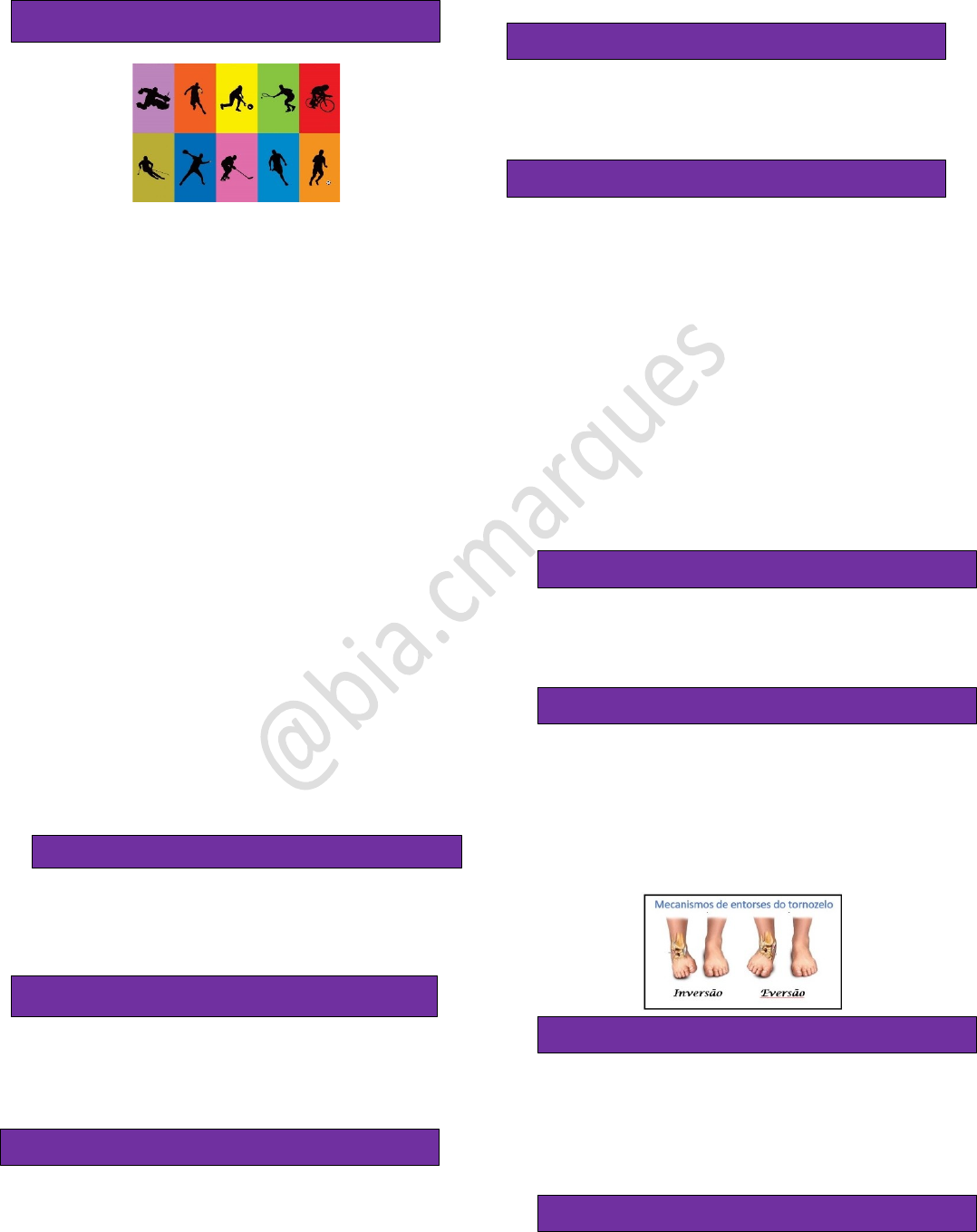 Avaliação fisioterapêutica do Aparelho locomotor Lesões no esporte O crescente aumento da frequência e da intensidade das atividades físicas, a busca de melhora da performance e de objetivos específicos, tem aumentado a exposição do aparelho musculoesquelético as lesões no esporte. · Overtrainig: Corresponde a síndrome do supertreinamento, ou seja, excesso de treinamento. · Ouveruse: Corresponde ao excesso de uso de uma determinada estrutura onde ocasiona lesão. A modalidade esportiva leva a outro tipo de situação Ouveruse dependendo da modalidade surge as distensões musculares e ligamentares. Ex: No ombro quando é praticado a natação, as epicondilites em tenistas e assim nas demais modalidades a uma sobrecarga de uma determinada estrutura. Devido as cobranças e exigências dos clubes os atletas passam por uma situação de Overtrainig, ou seja, vão além do seu limite fisiológico e psicológico, ocasionando o aparecimento de lesões, muitos clubes têm em mente que o supertreinamento levará a uma melhor performance, porém não é isso que ocorre. Traumatologia do esporte O movimento humano durante o esporte e exercícios é tipicamente mais rápido ou produtor de forças maiores que aquelas utilizadas nas AVDs. Processo de avaliação de lesões -Onde? -Quando? - Como foi a lesão? -Triagem -Saber a modalidade -Tipo da lesão -Posicionamento no esporte -Lesões reicidivantes -Intensidade da dorCompreensão das ciências do movimento k · Biomecânica · Patomecânica (Biomecânica de maneira anormal). Avaliação subjetiva e objetiva · Subjetiva: perguntas que são direcionadas ao atleta e que facilita o tratamento. · Objetiva: Exeme físico (Inspeção/Palpação). Etapas da avaliação · Histórico · Identificar o mecanismo da lesão · Diagnóstico clínico · Exame físico · Diagnóstico cinético-funcional · Condutas/plano terapêutico · Treinamento sensório-motor · Treinamento do gestual esportivo · Histórico · Traumas · Tempo de evolução · Dor · Tratamento · Exame físico Mecanismo lesiona O corpo humano é composto de diferentes tipos de tecidos que respondem diferentemente à aplicação de forças. As lesões podem ocorrer por causas estruturais e funcionais. Força e seus efeitos Alguns tecidos são anisotrópicos, ou seja, possuem maior resistência a forças de algumas direções que de outras. As propriedades anatômicas de muitas articulações do corpo humano também podem predispor ás lesões em uma direção específica. Ex: Entorse por inversão devido a posição dos maléolos. Prevenção de entorses · Calçada adequado; · Alongamento antes e depois da prática do esporte; · Orientação sobre o melhor gesto esportivo; · Programa de fortalecimento; · Treino proprioceptivo. Força compressiva Refere-se a uma carga axial que produz efeito de esmagamento ou compressão na estrutura. Exame físico · Inspeção · Análise da marcha se utiliza algum dispositivo (muletas, andadores) · Anamnese · Palpação (Avaliar a temperatura, sensibilidade, intensidade da dor). · ADM · ADM ativa: Avalia a capacidade funcional; análise das estruturas contráteis. · ADM passiva: Avalia a limitação; análise das estruturas não contráteis. As estruturas contráteis são aquelas que desenvolvem força ativa com gasto de energia metabólica – mecanismo de pontes cruzadas; as elásticas são aquelas que oferecem resistência mecânica ao alongamento sem custo energético – força passiva – e conservam energia elástica para uma nova contração. Testes · Teste de força muscular: avaliar a qualidade da força. · Testes funcionais: teste voltado para a atividade esportiva, ou seja, a função do atleta dentro da modalidade. · Testes especiais: testes realizados para a identificação de lesões. · Testes neurológicos: reflexo tendíneo, teste de sensibilidade, estesiometria. Inspeção estática · Vestígios de lesões traumáticas. · Edema · Hematoma · Avaliação postural · Deformidade da coluna cervical e torácica · Simetria do ombro e da escápula · Simetria da pelve · Contornos ósseos · Contorno muscular (trofismo) · Tecidos moles · Observar tónus · Consistência · Tamanho · Contorno Inspeção dinâmica · Marcha: uniformidade e simetria durante a movimentação. · Avaliar o lado afetado e a estrutura que não apresenta alterações servirá de parâmetro. · AVDs: ritmo, movimentação, leveza, movimentação anormal, substituição de movimentos, compensações, comparação bilateral. Anamnese · Dor. · Início lento: doenças inflamatórias e degenerativas. · Início súbito: lesões traumáticas, inflamatória aguda. · Tipo de dor: contínua ou com exacerbação noturna. Avaliação das lesões · Etapas da avaliação · Saber a modalidade · Posicionamento no esporte · Tipo de lesão (lesão por trauma, reicidivante) Diagnóstico cinético-funcional Realizada com base na entrevista (anamnese) e exame físico do paciente, quando são identificadas as limitações e disfunções. O agrupamento e análise desses dados pelo fisioterapeuta resulta numa conclusão acerca do estado funcional do paciente. O diagnóstico cinético-funcional pode então ser utilizada para que um programa objetivo de treinamento e/ou reabilitação seja posteriormente prescrito para esse paciente. Exames complementares Observar depois das informações colhidas. Achados fisioterapêuticos coincidem com os exames complementares. Exames complementares podem ser exames laboratoriais, radiografias, tomografias, ultrassom e etc. Métodos analgédicos · Crioterapia: frio age como agente analgésico, diminuindo a velocidade de condução nervosa, além de reduzir o edema e a hiperemia pela ação vasoconstritora, e nas articulações inibe a atividade da colagénese, enquanto que no tecido muscular diminui o espasmo, por reduzir a velocidade de disparo das fibras do fuso neuromuscular. 3 vezes ao dia. · Pós-operatório