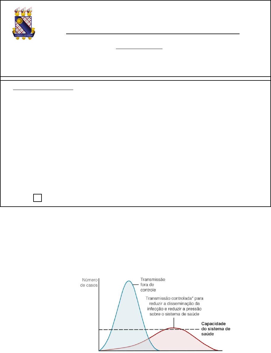 UNIVERSIDADE ESTADUAL DO CEARÁ CENTRO DE CIÊNCIAS DA SAÚDE - CCS MATEMÁTICA PARA CIÊNCIAS BIOLÓGICAS Avaliação 1 Assunto: Função, Limite, Continuidade e Derivada Prazo de devolução: 14/01/21 18:00h via e-mail do Professor ORIENTAÇÕES: • O tempo de prova é improrrogável. Se até o término do horário de entrega não chegar o e-mail com a resolução, esta não mais será recebida; • A folha de resolução deve está perfeitamente legível no email e sem rotação da folha; Caso não seja possível entender o que está escrito (discricionariedade do professor), a nota atribuída a questão será zero; • As questões notadamente copiadas, inclusive com cópias de erros serão zeradas. • Você pode optar por trocar a correção de duas das questões por seus pontos na entrega das atividades que podem somar até 2(dois) pontos se tiverem sido todas as atividades entregues e no prazo dado. Se optar pela troca , marque a opção abaixo indicando a questão e não envie a resolução da questão que você optou pela troca, ou informe no email de envio. Não responda as questões trocadas pelos pontos. Troco a(s) questão(ões) ____ pelos pontos de atividade. O custo total, em reais, para fabricar unidades (doses) da vacina contra a poliomielite é dado pela função C(n) = 𝑛3 −8𝑛2 + 5n + 20. 1) Determine o custo de fabricação de 10 doses da vacina; 2) Determine o custo de fabricação da 10ª dose da vacina. Use o gráfico acima para responder as questões 3 e 4. De acordo com o gráfico acima que mostra a curva da transmissão fora de controle e da transmissão controlada da covid-19, responda as perguntas: Figura para as questões 3 e 4. 3) Qual das duas curvas, a azul ou a vermelha, apresenta maior taxa de variação na transmissão? Justifique em uma linha. 4) Afirmar que a derivada (taxa de crescimento ou decrescimento) das curvas apresentadas no gráfico quando chega a zero é afirmar que não há mais contágio pelo vírus. Essa afirmação é verdade? Justifique em uma linha. 5) O número de bactérias de uma cultura, horas após o início de um certo experimento, é dado pela expressão N(t) = 1200∙ 20,4 𝑡 . Nestas condições, quanto tempo após o início do experimento a cultura terá 38.400 bactérias? (N=número de bactérias e t=tempo em horas.) Use o texto abaixo para responder as questões 6 e 7. Para estudar a rapidez com que os animais aprendem, um estudante de etologia executou um experimento no qual um rato teve que percorrer, várias vezes, um labirinto. Suponha que o tempo necessário para o rato encontrar a saída do labirinto, na n-ésima tentativa, seja dado, em minutos, aproximadamente por: t(n) = 3 + 12 𝑛 , t=tempo em minutos e n=número de tentativas 6) Para que valores de n a função tem significado no contexto do experimento? 7) Quanto tempo o rato levou para encontrar a saída do labirinto na terceira tentativa? 8) Numa floresta tropical da África a temperatura t (ºC) varia conforme o mês do ano, segundo a função ao lado: Pergunta: a) A função é contínua em x=3? b) A função é contínua em x=5? Justifique sua resposta. (*Se você desenhar corretamente o gráfico da função t(m), ele já justifica sua resposta) 9) A um mês de uma competição, um atleta de 75 kg é submetido a um treinamento específico para aumento de massa muscular, em que se anunciam ganhos de 180 gramas por dia. Suponha que isso realmente ocorra. a) Determine a “massa”(popularmente chamada de peso) do atleta após 7 dias de treinamento; b) Encontre a lei que relaciona a “massa” do atleta (m) em função do número de dias de treinamento (n). *Cuidado com a transformação de unidades (Kg/g) 10) Calcula-se que, daqui a meses, a população de certa cidade será Como se expressará a taxa de variação da população com o tempo?