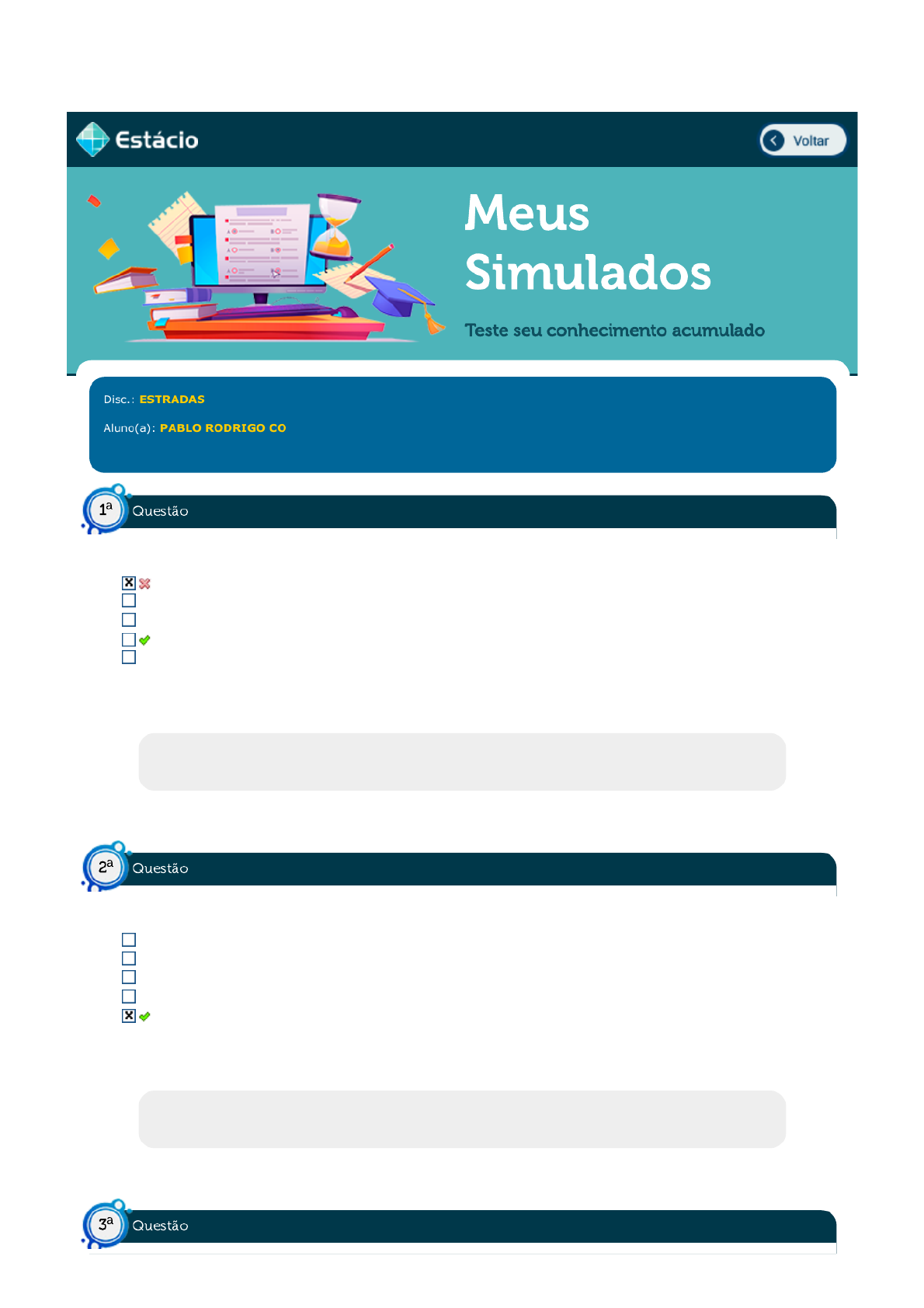 Impresso por Bruno Danillo, E-mail brunodanilloalvesdosreis15@gmail.com para uso pessoal e privado. Este material pode ser protegido por direitos autorais e não pode ser reproduzido ou repassado para terceiros. 26/03/2023, 09:14:53 09/09/2022 18:29 Estácio: Alunos https://simulado.estacio.br/alunos/ 1/6 Disc.: ESTRADAS Aluno(a): PABLO RODRIGO COLOMBO 201707270902 Acertos: de 10,0 08/09/20224,0 Acerto: 0,0 1,0 / Faz parte de um projeto definitivo de uma rodovia projeto em perfil. seções-tipo transversais da plataforma. quadro de características operacionais. projeto em planta. projeto de interseções. Respondido em 08/09/2022 14:39:41 Explicação: A resposta correta é: projeto em planta. Acerto: 1,0 1,0 / Que elemento não está presente em um estudo de traçado? Velocidade diretriz. Seção transversal. Perfil longitudinal. Distância de visibilidade. Perfil geotécnico. Respondido em 08/09/2022 15:11:55 Explicação: A resposta correta é: Perfil geotécnico. Acerto: 1,0 1,0 / Impresso por Bruno Danillo, E-mail brunodanilloalvesdosreis15@gmail.com para uso pessoal e privado. Este material pode ser protegido por direitos autorais e não pode ser reproduzido ou repassado para terceiros. 26/03/2023, 09:14:53 09/09/2022 18:29 Estácio: Alunos https://simulado.estacio.br/alunos/ 2/6 Dentre as opções a seguir, calcule a seção transversal de aterro de uma rodovia, considerando b = 15 m e h = 2,0 m. 31 m2 33 m2 35 m2 32 m2 34 m2 Respondido em 08/09/2022 15:11:39 Explicação: A alternativa correta é: 34 m2 Acerto: 0,0 1,0 / Uma curva vertical tem L = 200 m. O trecho a montante do PIV tem inclinação zero, e o trecho a jusante, i = 2% em declive. A flecha máxima dessa curva é de: 2,5 m. 1,0 m. 0,5 m. 1,5 m. 2,0 m. Respondido em 08/09/2022 15:11:40 Explicação: A alternativa correta é: 0,5 m. Acerto: 1,0 1,0 / Observe a figura a seguir. O desenho que melhor representa uma sarjeta de crista de aterro, integrada com o meio-fio, é: Imagem: DEPARTAMENTO NACIONAL DE INFRAESTRUTURA DE TRANSPORTES - DNIT. Álbum de Projetos-Tipo de Dispositivos de Drenagem. (2018, p.37). Impresso por Bruno Danillo, E-mail brunodanilloalvesdosreis15@gmail.com para uso pessoal e privado. Este material pode ser protegido por direitos autorais e não pode ser reproduzido ou repassado para terceiros. 26/03/2023, 09:14:53 09/09/2022 18:29 Estácio: Alunos https://simulado.estacio.br/alunos/ 3/6 Imagem: DEPARTAMENTO NACIONAL DE INFRAESTRUTURA DE TRANSPORTES - DNIT. Álbum de Projetos-Tipo de Dispositivos de Drenagem. (2018, p.33) Imagem: DEPARTAMENTO NACIONAL DE INFRAESTRUTURA DE TRANSPORTES - DNIT. Álbum de Projetos-Tipo de Dispositivos de Drenagem. (2018, p.30, adaptada). Imagem: DEPARTAMENTO NACIONAL DE INFRAESTRUTURA DE TRANSPORTES - DNIT. Álbum de Projetos-Tipo de Dispositivos de Drenagem. (2018, p.22). Imagem: DEPARTAMENTO NACIONAL DE INFRAESTRUTURA DE TRANSPORTES - DNIT. Manual de drenagem de rodovias. (2006, p.192, adaptada). Respondido em 08/09/2022 15:08:02 Explicação: A resposta correta é: Imagem: DEPARTAMENTO NACIONAL DE INFRAESTRUTURA DE TRANSPORTES - DNIT. Álbum de Projetos-Tipo de Dispositivos de Drenagem. (2018, p.30, adaptada). Impresso por Bruno Danillo, E-mail brunodanilloalvesdosreis15@gmail.com para uso pessoal e privado. Este material pode ser protegido por direitos autorais e não pode ser reproduzido ou repassado para terceiros. 26/03/2023, 09:14:53 09/09/2022 18:29 Estácio: Alunos https://simulado.estacio.br/alunos/ 4/6 Acerto: 0,0 1,0 / O raio hidráulico de uma valeta de drenagem em que b = 1,50m e lâmina d'água máxima de 1,20m é: 0,46m 0,36m 0,31m 0,26m 0,41m Respondido em 08/09/2022 15:12:01 Explicação: A resposta correta é: 0,46m Acerto: 0,0 1,0 / O modelo único que combina as informações de todas as disciplinas e de todos os modelos de projeto geralmente é chamado de: Modelo livre. Modelo de infraestrutura. Modelo unificado. Modelo comum. Modelo federado. Respondido em 08/09/2022 14:58:16 Explicação: A resposta correta é: Modelo federado. Acerto: 0,0 1,0 / Assinale o conceito que faz parte da configuração de um corredor no AutoCAD Civil 3D:NÃO Alinhamento horizontal. Superfície topográfica. Comprimento de transição. Seção transversal. Perfil longitudinal. Respondido em 08/09/2022 14:58:12 Explicação: A resposta correta é: Comprimento de transição. Acerto: 1,0 1,0 / A superelevação tem como objetivo: Impresso por Bruno Danillo, E-mail brunodanilloalvesdosreis15@gmail.com para uso pessoal e privado. Este material pode ser protegido por direitos autorais e não pode ser reproduzido ou repassado para terceiros. 26/03/2023, 09:14:53 09/09/2022 18:29 Estácio: Alunos https://simulado.estacio.br/alunos/ 5/6 Maximizar a velocidade da composição. Minimizar o impacto das forças laterais como a força centrípeta. Minimizar o impacto das forças laterais como a força centrífuga. Maximizar o impacto da resultante das forças. Maximizar a instabilidade do movimento. Respondido em 08/09/2022 15:12:12 Explicação: A alternativa correta é: Minimizar o impacto das forças laterais como a força centrífuga. Acerto: 0,0 1,0 / Na imagem abaixo, vemos vários aparelhos de mudança de via (AMV) em um pátio ferroviário. O dispositivo considerado o "coração" do AMV, que permite que haja efetivamente a bifurcação ou a junção da linha férrea é chamado de: Foto: Shutterstock.com (https://www.shutterstock.com/pt/image-photo/top-perspective-view-on-many- railway-216265039) Alma Agulha Boleto Patim Jacaré Respondido em 08/09/2022 15:12:29 Explicação: A alternativa correta é: Jacaré Impresso por Bruno Danillo, E-mail brunodanilloalvesdosreis15@gmail.com para uso pessoal e privado. Este material pode ser protegido por direitos autorais e não pode ser reproduzido ou repassado para terceiros. 26/03/2023, 09:14:53 09/09/2022 18:29 Estácio: Alunos https://simulado.estacio.br/alunos/ 6/6