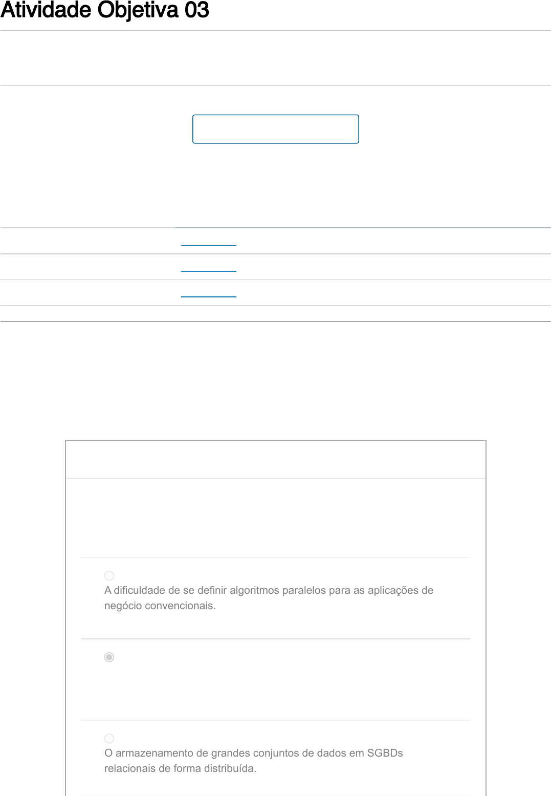 03/04/2023, 10:19 Atividade Objetiva 03: 09 - Engenharia de Dados (2022) https://pucminas.instructure.com/courses/90109/quizzes/321369 1/4 Atividade Objetiva 03 Entrega Sem prazo Pontos 10 Perguntas 5 Limite de tempo Nenhum Tentativas permitidas Sem limite Histórico de tentativas Tentativa Tempo Pontuação MANTIDO Tentativa 2 4 minutos 10 de 10 MAIS RECENTE Tentativa 2 4 minutos 10 de 10 Tentativa 1 9 minutos 8 de 10 As respostas corretas estão ocultas. Pontuação desta tentativa: 10 de 10 Enviado 3 abr em 10:20 Esta tentativa levou 4 minutos. Fazer o teste novamente 2 / 2 ptsPergunta 1 Pode-se dizer que é uma das vantagens da utilização do framework Hadoop no contexto de Big Data: A dificuldade de se definir algoritmos paralelos para as aplicações de negócio convencionais. A utilização de hardware barato e abundante para solução do problema de se armazenar grandes volumes de dados associados ao Big Data. O armazenamento de grandes conjuntos de dados em SGBDs relacionais de forma distribuída. https://pucminas.instructure.com/courses/90109/quizzes/321369/history?version=2 https://pucminas.instructure.com/courses/90109/quizzes/321369/history?version=2 https://pucminas.instructure.com/courses/90109/quizzes/321369/history?version=1 https://pucminas.instructure.com/courses/90109/quizzes/321369/take?user_id=166255 03/04/2023, 10:19 Atividade Objetiva 03: 09 - Engenharia de Dados (2022) https://pucminas.instructure.com/courses/90109/quizzes/321369 2/4 O alto custo da implementação de soluções para tratamento e análise de grandes volumes de dados. 2 / 2 ptsPergunta 2 Analise as afirmativas a seguir, considerando-se o contexto de Big Data: I – O que caracteriza as aplicações de Big Data é exclusivamente o grande volume de dados envolvido. II – Aplicações de Big Data gerenciam e manipulam dados que, por característica, são armazenados em bancos de dados relacionais. III – Sensores de IoT são atualmente responsáveis pela geração de um grande volume de dados que podem ser classificados como Big Data. É correto o que se afirma em: I apenas. I e II apenas. III apenas. II apenas. 2 / 2 ptsPergunta 3 Avalie as duas afirmativas a seguir: (I) A partir do desenvolvimento do Hadoop surgiu o termo ecossistema, associado ao conjunto de ferramentas desenvolvidas que oferecem funcionalidades adicionais no contexto de Big Data. POR QUE 03/04/2023, 10:19 Atividade Objetiva 03: 09 - Engenharia de Dados (2022) https://pucminas.instructure.com/courses/90109/quizzes/321369 3/4 (II) Esse conjunto de ferramentas é capaz de oferecer aos usuários de aplicações de Big Data uma vasta gama de recursos para processamento de grandes volumes de dados. Pode-se dizer que: apenas a segunda afirmação está correta. as duas afirmações estão corretas, mas a segunda não é uma explicação da primeira. apenas a primeira afirmação está correta. as duas afirmações estão corretas e a segunda é uma explicação da primeira. 2 / 2 ptsPergunta 4 Considere as duas definições apresentadas abaixo: I – Modelo de programação tradicionalmente utilizado em aplicações de Big Data, caracterizado por duas etapas principais: uma que divide o problema para o processamento paralelo e distribuído e outra que reúne as soluções parciais encontradas. II – Framework desenvolvido para suporte às tecnologias utilizadas no processamento de volumes massivos de dados (Big Data). Os itens (I) e (II) acima referem-se respectivamente a: Data Mining e Weka. SQL e Hadoop. MapReduce e Hadoop. MapReduce e Data Warehouse. 03/04/2023, 10:19 Atividade Objetiva 03: 09 - Engenharia de Dados (2022) https://pucminas.instructure.com/courses/90109/quizzes/321369 4/4 2 / 2 ptsPergunta 5 Há estudos de que o volume de dados gerados pela humanidade excede a capacidade de armazenamento e processamento pelas tecnologias disponíveis. O conceito associado ao tipo de aplicação que trata volumes de dados massivos ficou conhecido como _____________. Nesse contexto, os dados podem estar em variados _____________ e origens, com grande demanda por ferramentas para sua gerência e manipulação. A alternativa que preenche corretamente as lacunas acima é: Big Data – formatos data warehouse – modelos cloud computing – metadados data mining – conceitos Pontuação do teste: 10 de 10