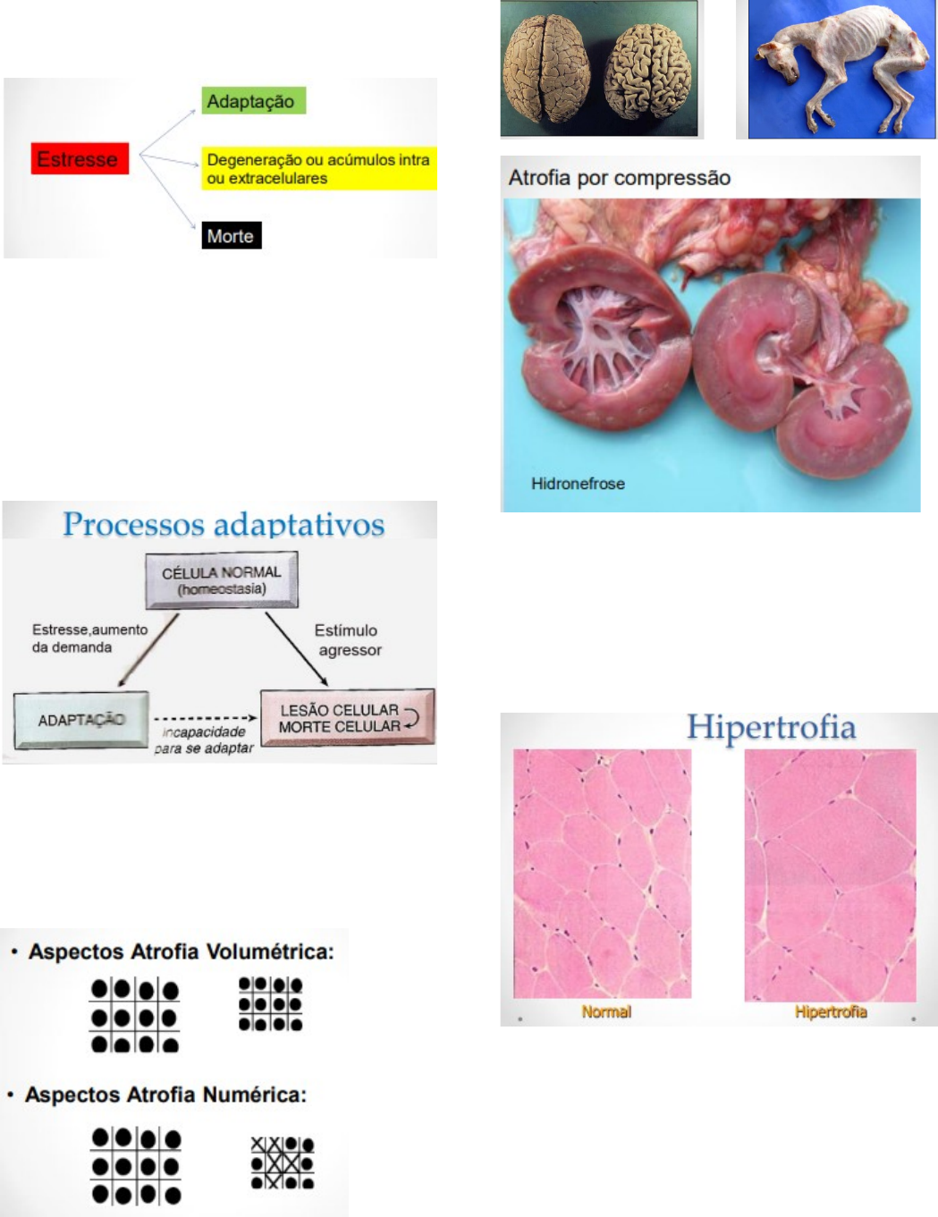 Adaptações celulares às injúrias e distúrbios do crescimento Célula pode sofrer lesão celular e passar por adaptação ou sofrer lesão, se for reversível, ocorre degeneração, se irreversível ocorre necrose, ou apoptose. Adaptação celular pode ser fisiológica ou patológica. Causas de lesão celular: deficiência de oxigênio, agentes físicos, agentes infecciosos, desequilíbrios e deficiências nutricionais, anormalidades genéticas, desequilíbrio da carga de trabalho, substâncias químicas, drogas e toxinas. Disfunção imunológica e envelhecimento. Atrofia: diminuição do tamanho e /ou volume celular. Causas = imobilização, perda de inervação, diminuição do fluxo de sangue, nutrição inadequada, perda de estimulação endócrina e idade. Atrofia é muito visível macroscopicamente, cérebro e muscular. Exemplo de quadro de hidronefrose (compressão renal pela urina). Hipertrofia: aumento do tamanho e ou volume celular, diferente de hiperplasia, células com baixo índice mitótico. Hipertrofia fisiológica: miométrica, mama e músculos. Hipertrofia patológica: hipertrofia cardíaca, órgãos ocos anterior a estenose e hepatócitos. Hiperplasia: aumento do n de células em órgãos com maior atividade mitótica, linfonodos, fígado e baço. Apenas visível microscopicamente, divisão entre fisiológica e patológica. Hiperplasia fisiológica: hormonal, útero, mama. Compensatória: rim, hepatócitos. Cicatrização: fibroblastos, endotélio Hiperplasia patológica: hiperestimulação hormonal, ex. útero, Adeno-hipófise, estrógeno. Metaplasia: desdiferenciação do formato anatômico das células, é reversível, alteração pre-neoplasica. Metaplasia escamosa Metaplasia em tecido mesenquimal Metaplasia em coloração Tricomio de Masson Displasia: desenvolvimento anormal de célula mesmo depois de atingir o estado adulto passando a apresentar atipias celulares, há proliferação celular com redução ou perda da diferenciação. Ocorre geralmente em epitélios ou locais com índice alto de mitoses. Epiderme: dermatose solar ou queratose actínica. Trato respiratório, mucosa gástrica e esofágica, bem comum. DISTÚRBIOS DO CRESCIMENTO Agenesia: ausência do órgão por ausência do broto embrionário, falta completa de formação de um órgão ou parte dele, as causas normalmente são fatores genéticos não esclarecidos e as consequências são hipofunção e ou morte. Pode ocorrer: no crânio, cérebro, rim, septo interatrial, lobo pulmonar e membros como dígitos, dentes e mandíbula. Amelia: ausência de braços ou pernas, agnatia com hipoglossia ou aglossia: ausência da mandíbula e língua, adactilia: ausência de dígitos. Acrânia: ausência de crânio. Aplasia: desenvolvimento incompleto de um órgão, com broto embrionário, ocorre no embrião ou feto. As causas são defeitos hereditários, morte acidental de uma célula num período crítico e doenças da mãe, principalmente virais. Consequências: hipofunção e ou morte. Hipoplasia: órgão de tamanho menor que o normal, desenvolvimento deficiente de um órgão ou parte dele, as causas são anomalias congênitas, fluxo inadequado de sangue, inervação inadequada e desnutrição. Hipoplasia renal Hipoplasia do cerebelo Adaptações celulares à s injúrias e distúrbio s do crescimento Célula pode sofrer lesão celular e passar por adaptação ou sofrer lesão, se for reversível, ocorre degeneração, se irreversível ocorre necrose, ou apoptose. Adaptação celular pode ser fisiológica ou patológica. Causas de lesão celular: deficiência de oxigênio, agentes físicos, agentes infecciosos, desequilíbrios e deficiências nut ricionais, anormalidades genéticas, desequilíbrio da carga de trabalho, substânci as químicas, drogas e toxinas. Disfunção imunológica e envelhecimento. Atrofia: diminuição do tamanho e /ou volume celular. Causas = imobilização, perda de inervação, diminuição do fluxo de sangue, nutrição inadequada, perda de estimulação endócrina e idade. Atrofia é muito visível macroscopicamente, cérebro e muscular. Exemplo de quadro de hidronefrose (compressão renal pela urina). Hipertrofia: aumento do tamanho e ou volume celular, diferente de hiperplasia, células com baixo índice mitótico. Hipertrofia fisiológica: miométrica, mama e músculos. Hipertrofia patológica: hipertrofia cardíaca, órgãos ocos anterior a estenos e e hepató citos. Adaptações celulares às injúrias e distúrbios do crescimento Célula pode sofrer lesão celular e passar por adaptação ou sofrer lesão, se for reversível, ocorre degeneração, se irreversível ocorre necrose, ou apoptose. Adaptação celular pode ser fisiológica ou patológica. Causas de lesão celular: deficiência de oxigênio, agentes físicos, agentes infecciosos, desequilíbrios e deficiências nutricionais, anormalidades genéticas, desequilíbrio da carga de trabalho, substâncias químicas, drogas e toxinas. Disfunção imunológica e envelhecimento. Atrofia: diminuição do tamanho e /ou volume celular. Causas = imobilização, perda de inervação, diminuição do fluxo de sangue, nutrição inadequada, perda de estimulação endócrina e idade. Atrofia é muito visível macroscopicamente, cérebro e muscular. Exemplo de quadro de hidronefrose (compressão renal pela urina). Hipertrofia: aumento do tamanho e ou volume celular, diferente de hiperplasia, células com baixo índice mitótico. Hipertrofia fisiológica: miométrica, mama e músculos. Hipertrofia patológica: hipertrofia cardíaca, órgãos ocos anterior a estenose e hepatócitos.