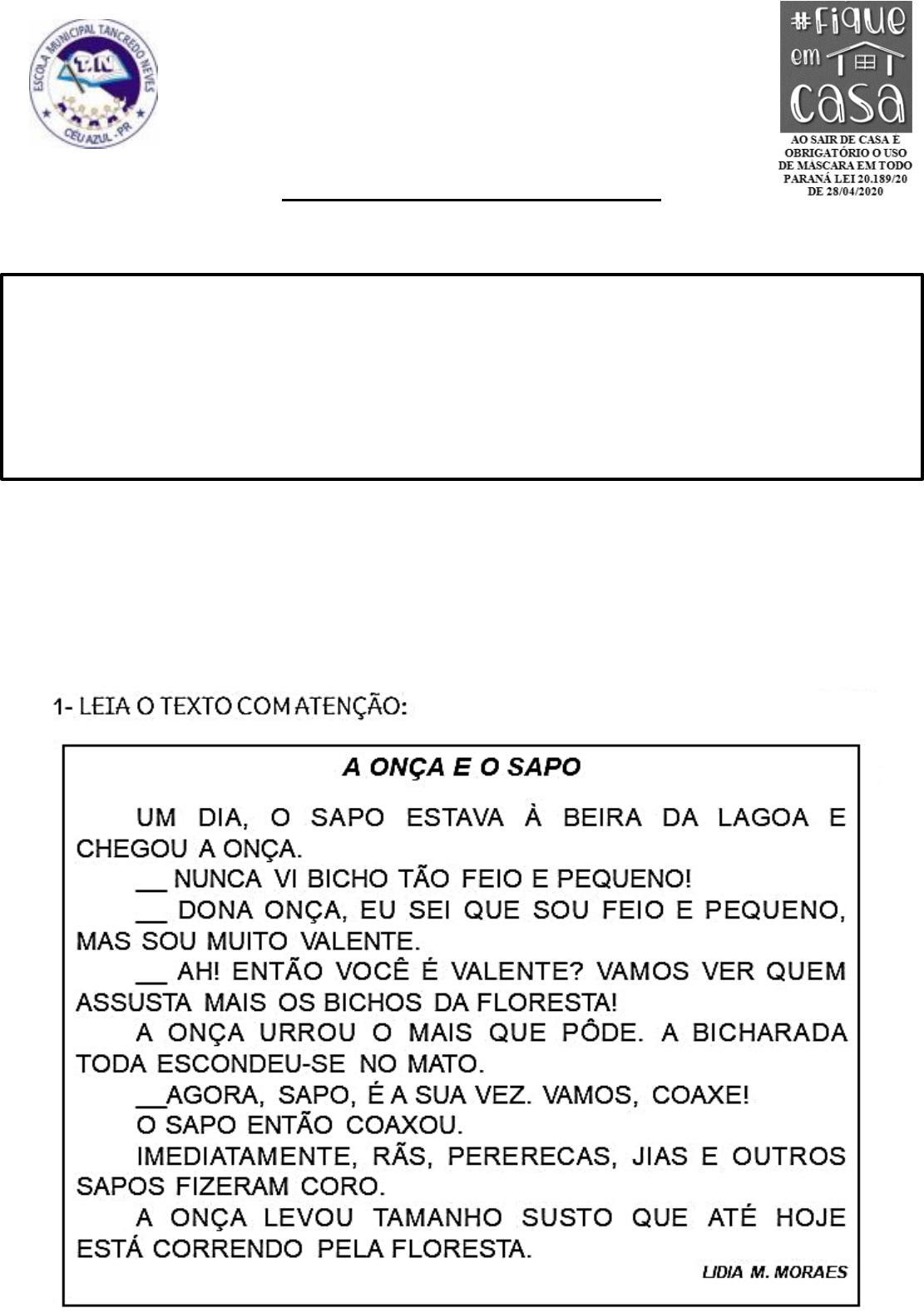 CADERNO DE ATIVIDADES 5º ANO – ENSINO FUNDAMENTAL PERÍODO DE REALIZAÇÃO DAS ATIVIDADES: De 22/02/2021 a 05/03/2021. DEVOLVER NO DIA: 08 / 03 / 2021. ESSE CADERNO DE ATIVIDADES ESTÁ DE ACORDO COM A PROPOSTA PEDAGÓGICA CURRICULAR - PPC ESCOLA MUNICIPAL TANCREDO NEVES PROFESSORA DE LÍNGUA PORTUGUESA, MATEMÁTICA, GEOGRAFIA E ENS. RELIGIOSO: VANDERLÉIA PROFESSOR DE EDUCAÇÃO FÍSICA:ANDRÉ PROFESSORA DE CIÊNCIAS: LAÍS PROFESSORA DE ARTE E HISTÓRIA: CLEONILDA ALUNO:________________________________________________________ 1º SEMANA DE 22/02/2021 A 26/02/2021 COMPONENTE CURRICULAR: LÍNGUA PORTUGUESA CÓDIGO DOS OBJETIVOS DE APRENDIZAGEM: PR.EF15LP PR.EF15LP01.a 02.a, PR.EF12LP01.a 3) Responda de acordo com o texto: a) Qual é o título da história? R_________________________________________________________ b) Quais eram os personagens principais dessa história? R_________________________________________________________ c) A onça disse que o sapo era....... R_________________________________________________________ d) Qual o desafio que a onça fez ao sapo? R_________________________________________________________ e) No fim o que aconteceu com a onça? R_________________________________________________________ 4) Retire do texto: 3 substantivo comum__________________________________________________ Os sinais de pontuação que nele aparecem:________________________________ 4) Faça a leitura do texto “A ONÇA E O SAPO” e mande um áudio da leitura para a sua professora. Componente curricular – Ciências Código do objetivo de aprendizagem: PR.EF05CI.n O que é Ciência? Ciência pode ser definida como o conjunto de conhecimentos baseados na reflexão, na observação e na experimentação. Dessa forma, teorias podem ser criadas, aperfeiçoadas ou até mesmo abandonadas, para que a quantidade e qualidade dos conhecimentos sejam ampliadas. Ou seja ciência é aquele tipo de conhecimento que busca compreender verdades ou leis naturais para explicar o funcionamento das coisas e do universo em geral. De que é feito o corpo do ser humano O ser humano, como qualquer outro animal e planta, é formado de células. Embora de formas diferentes a maioria das células do corpo humano possui partes semelhantes: uma membrana que envolve um citoplasma e um núcleo. A membrana controla a entrada e a saída de substância na célula. Se for rompida por algum motivo, o citoplasma escapa e a célula morre. O citoplasma é a porção da célula que fica entre a membrana e o núcleo. É formado principalmente de água e proteínas e é local onde acontecem todas as reações químicas da vida da célula. O núcleo funciona como um centro de controle. Nele se encontra o material genético, que faz com que cada novo ser humano tenha características de ser humano e apresente semelhanças e diferenças com os pais. Tudo o que se passa no citoplasma é determinado e coordenado pelo núcleo. A maioria das células que formam o corpo do ser humano tem dimensões microscopias e só pode ser vista com auxílio do microscópio. Componente curricular – História Código do objetivo de aprendizagem: PR.EF04HI01.s História Estuda a vida do homem através do tempo, investiga o que os homens fizeram o que eles pensavam e sentiam enquanto seres sociais. Os objetos, as cidades, o mundo sofrem transformações a todo momento. Nós, desde o dia que nascemos até hoje estamos constantemente nos transformando. Hora da atividade a) Observe em sua casa, no seu bairro, as modificações que aconteceram, e conte para seus familiares sobre essas mudanças que você observou. Componente curricular: Matemática Código do objetivo de aprendizagem: PR.EF05MA01.S PR.EF05MA07.D PR.EF03MA10.S 1- Complete a sequência numérica: 4) Observe os números escritos por Renata: 408 - 849 - 740 - 509 O maior número escrito por Renata é:(faça um x na resposta correta) a) 408 b) 849 c) 740 5) observe os números escritos por Rodrigo: 363 – 691 – 149 – 408 O menor número escrito por Rodrigo é: (faça um x na resposta correta) a) 363 b)691 c)149 d) 408 6) O número mil trezentos e cinco pode ser escrito da seguinte forma: (faça um x na resposta correta) a) 1000 300 5 b) 1.350 c) 1.305 d) 1.005 Componente curricular – Geografia Código do objetivo de aprendizagem: PR.EF15AR01 Você sabe me dizer o que é Geografia? Faça uma pesquisa e escreva o que você encontrou sobre o assunto. _________________________________________________________ _________________________________________________________ __________________________________________________________ __________________________________________________________ __________________________________________________________ Componente curricular – Arte Código do objetivo de aprendizagem: PR.EF15AR01 Arte Ela desperta o interesse por diferentes culturas, ajuda a expressar os sentimentos e a desenvolver habilidades e desempenhar determinadas tarefas. Assista ao vídeo sobre o que é arte que será disponibilizado no grupo de whatsapp, ou através do link: https://www.youtube.com/watch?v=nw4z_db_2ai que irá complementar a explicação da professora. Componente curricular – Educação Física CÓDIGO DO OBJETIVO DE APRENDIZAGEM: PR.EF35F01 Vamos dar continuidade a nossa aula seguindo: A – de alongamento, a – de aquecimento, a – de atividade. Alongamento. Vamos alongar os membros superiores (braço, antebraço, ombro e mão). Vamos alongar os membros inferiores (quadril, coxa, perna e pé). Observação: o professor irá mandar um vídeo executando cada etapa do alongamento. Aquecimento. Musica: tchutchuê Tchutchuê, tchutchuê é uma dança bem legal tchutchuê, tchutchuê é uma dança sem igual tchutchuê, tchutchuê é uma dança bem legal tchutchuê, tchutchuê é uma dança sem igual polegar pra frente (polegar pra frente). Observação: O professor irá mandar um vídeo fazendo os movimentos da música. Convide a família toda para aquecer junto. Atividade: