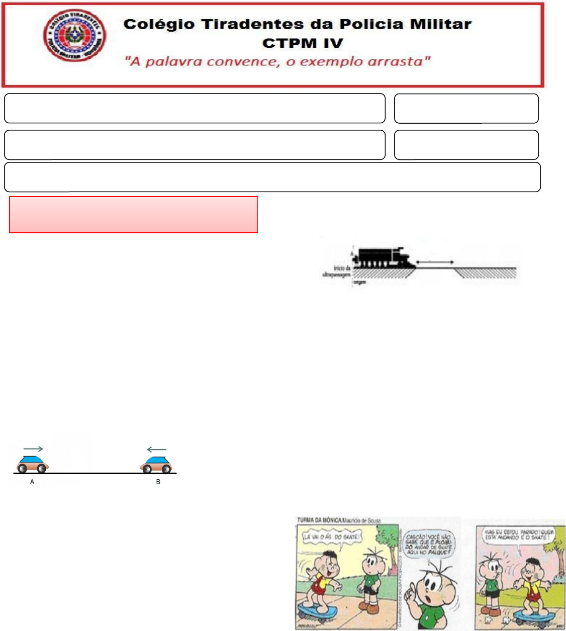 ALUNO (A): DATA: PROFESSOR (A): TURMA/ANO: TESTE DE FÍSICA 1° ANO – 1° BIMESTRE – •Permito o uso de calculadora na prova de Física! •Todos os cálculos devem constar na prova! 1 – Um atleta percorre 1500 metros em 120 segundos. Determine sua velocidade média em km/h. a) 27 b) 28,8 c) 32 d) 43,2 e) 45 2 – Dois moveis, A e B, partem simultaneamente de dois pontos de uma reta, separados por uma distância de 2000 metros, percorrendo-a na mesma direção e em sentidos contrários, com velocidades constantes e respectivamente iguais a 3 m/s 5 m/s. I - Em qual instante após a partida, se verifica o encontro? a) 100 s b) 112,5 s c) 125 s d) 150 s e) 162,5 s II - Qual a posição do Encontro? a) 875m b) 900 m c) 975 m d) 1150m e) 1200 m 3 – Um trem de 400 metros de comprimento tem velocidade escalar constante de 90 km/h. Determinar o tempo gasto para passar uma ponte de 100 metros. a) 10 s b) 12 s c) 16 s d) 20 s e) 24 s 4 – um carro se movimenta segundo a função horaria s = 100+5t (no SI). Determinar: a) Qual a posição inicial e a velocidade do carro? b) Qual a posição do carro no instante 10s? c) Em que instante o carro passa pela posição 500 metros? 5 - (PUC-SP) Leia com atenção a tira da Turma da Mônica mostrada a seguir e analise as afirmativas que se seguem, considerando os princípios da Mecânica Clássica. I. Cascão encontra-se em movimento em relação ao skate e também em relação ao amigo Cebolinha. II. Em relação a arvore, um Cascão encontra-se em movimento e Cebolinha está em repouso. IIl. Cascão encontra-se em repouso em relação ao skate, mas em movimento em relação ao amigo Cebolinha. Estão corretas: a) apenas I b) I e II c) I e III d) II e III e) I, II e III 6 - (Cefet-PR) Imagine um ônibus escolar parado no ponto de ônibus e um aluno sentado em uma de suas poltronas. Quando o ônibus entra em movimento, sua posição no espaço se modifica: ele se afasta do ponto de ônibus. Dada esta situação, podemos afirmar que a conclusão CORRETA é que: a) o aluno que está sentado na poltrona, acompanha o ônibus, portanto também se afasta do ônibus. b) podemos dizer que um corpo está em movimento em relação a um referencial quando a sua posição não muda em relação a esse referencial. c) o aluno está em repouso em relação ao ônibus e em movimento em relação ao ponto de ônibus. d) neste exemplo, o referencial adotado só pode ser o ônibus. e) para dizer se um corpo está parado ou em movimento, não é necessário relacioná-lo a nenhum ponto ou a um conjunto de pontos de referência. 8 - A partir do gráfico abaixo, escreva a função horária da posição para o móvel que executa movimento uniforme. a) S = 50 + 5.t b) S = 50 + 2.t c) S = 50 – 5.t d) S = 50 + 10.t e) S = 50 – 2.t 9 - A velocidade de 15 m/s, 20 m/s e 25 m/s, quando convertida para km/h, respectivamente, equivale a: a) 54 km/h, 72 km/h e 90 km/h b) 54 km/h, 80 km/h e 90 km/h c) 50 km/h, 72 km/h e 90 km/h d) 54 km/h, 72 km/h e 80 km/h e) 54 km/h, 72 km/h e 108 km/h 10 - Questão Bônus - (Unitau-SP) Uma motocicleta com velocidade escalar constante de 20 m/s, andando paralelamente à uma ferrovia, ultrapassa um trem de comprimento 400 m que “caminha”, no mesmo sentido, com velocidade escalar constante de 15 m/s. Desconsiderando o tamanho da moto, a duração da ultrapassagem é: a) 5 s b) 15 s c) 20 s d) 25 s e) 30 s