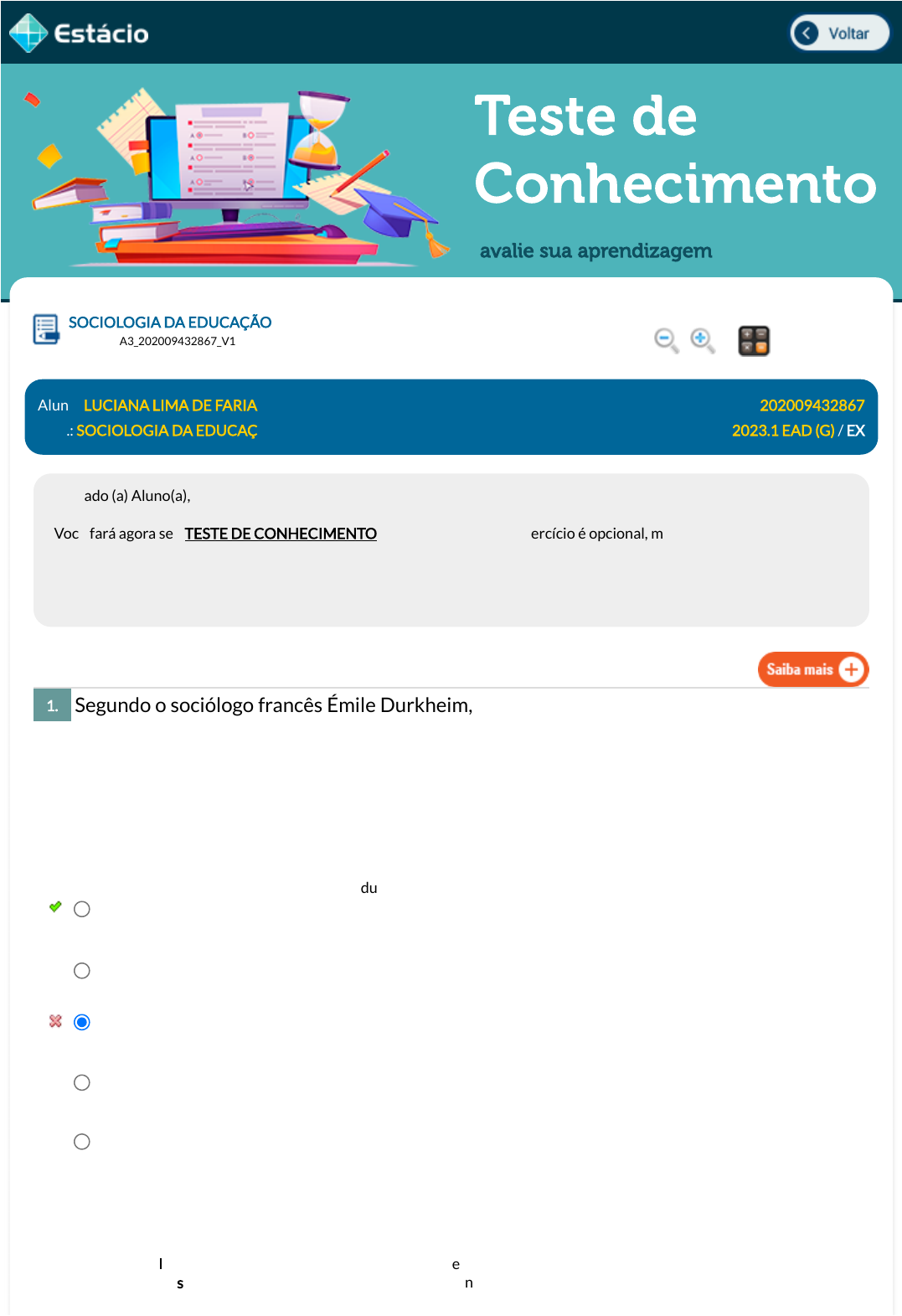 23/03/2023 20:56 Estácio: Alunos https://simulado.estacio.br/alunos/ 1/4 Teste de Conhecimento avalie sua aprendizagem Segundo o sociólogo francês Émile Durkheim, o objeto de estudo da Sociologia são os fatos sociais, ou seja toda maneira de agir �xa ou não, suscetível de exercer sobre o indivíduo uma coerção exterior; ou ainda, que é geral na extensão de uma sociedade dada, apresentando uma existência própria, independente das manifestações individuais que possa ter. (DURKHEIM, Émile. As regras do método sociológico. São Paulo: Companhia Editora Nacional, 1974, p. 11). Sobre o conceito de fatos sociais em Durkheim, NÃO é correto a�rmar: SOCIOLOGIA DA EDUCAÇÃO Lupa Calc. CEL0546_A3_202009432867_V1 Aluno: LUCIANA LIMA DE FARIA Matr.: 202009432867 Disc.: SOCIOLOGIA DA EDUCAÇ 2023.1 EAD (G) / EX Prezado (a) Aluno(a), Você fará agora seu TESTE DE CONHECIMENTO! Lembre-se que este exercício é opcional, mas não valerá ponto para sua avaliação. O mesmo será composto de questões de múltipla escolha. Após responde cada questão, você terá acesso ao gabarito comentado e/ou à explicação da mesma. Aproveite para se familiarizar com este modelo de questões que será usado na sua AV e AVS. 1. Os fatos sociais são exteriores aos indivíduos porque são fenômenos coletivos como, por exemplo, os sistemas econômicos e as religiões. Eles existem independentes das vontades individuais e, por isso, não precisam ser internalizados no processo de socialização. A coerção social pode ser formal ou informal. É formal quando a obrigação e a punição estão previstas em leis, contratos, normas e estatutos, por exemplo, e informal quando a punição é exercida espontaneamente pelas pessoas no seu dia a dia. As maneiras de agir são fatos sociais menos consolidados que não têm uma longa duração no tempo, isto é, são efêmeros e instáveis como, por exemplo, as correntes de opinião e os movimentos coletivos. As maneiras de ser são fatos sociais que já se encontram concretizados na sociedade e possuem uma durabilidade no tempo, isto é, são permanentes e estáveis como, por exemplo, as regras jurídicas e os dogmas religiosos. A coerção dos fatos sociais nem sempre está visível, isto é, o indivíduo cumpre com bom grado e satisfação as suas tarefas na sociedade e não sente o peso da coerção social sobre a sua conduta. Explicação: De�ne fato social como os agentes reais ou o conjunto de maneiras que estão no centro focal de uma sociedade. São os instrumentos sociais e culturais que determinam na vida de um indivíduo as maneiras de agir, pensar e sentir. Esses o obrigam a se adaptar às regras da sociedade. javascript:voltar(); javascript:voltar(); javascript:duvidas('2945724','7244','1','7553562','1'); javascript:diminui(); javascript:aumenta(); javascript:calculadora_on(); 23/03/2023 20:56 Estácio: Alunos https://simulado.estacio.br/alunos/ 2/4 Leia o fragmento abaixo: "A despeito de se viver na era dos direitos, são signi�cativos os homicídios no mundo inteiro, as condições sub-humanas a que são submetidas centenas de milhões de pessoas [...]. No Brasil, aí estão assassínios praticados por graúdos mandantes que se servem de pistoleiros pro�ssionais, trabalho escravo, trá�co de mulheres, menores para prostituição, a deplorável guerra do trá�co de drogas e as chacinas em grandes cidades brasileiras, em pleno século XXI [...]. Pelo número de concepções, leis, tratados, etc., está-se na era dos direitos. No plano da efetivação dos direitos, para utilizar a expressão de Lipovetsky [...], não se estaria na era do vazio [de direitos]?" [Situações sociais desse tipo são analisadas por alguns sociólogos a partir da consideração de que nos encontramos em] "uma condição social em que as normas reguladoras do comportamento perderam a sua validade, [onde] a e�cácia das normas está em perigo". (Folha de São Paulo, São Paulo, 30 ago. 2004. p. A 3.) Assinale a alternativa que indica o conceito utilizado por Emile Durkheim (1858-1917) para de�nir uma "condição social" do tipo descrito no texto. Para Durkhein, os fatos sociais são modos de pensar, sentir e agir de um grupo social, que possuem as seguintes características: De acordo com Durkheim, a anomia refere-se à ausência ou inadequação das regras que regulam as situações de interação social. Analise as a�rmativas abaixo e marque a alternativa correta. 2. Con�ito social. Coerção social. Consciência coletiva. Fato social. Anomia. 3. espontaneidade, coercitividade e exterioridade. generalidade, exterioridade e excepcionalidade. generalidade, espontaneidade e coercitividade. generalidade, exterioridade e espontaneidade. generalidade, exterioridade e coercitividade. 4. O individualismo é natural nos seres humanos e sofre repressão na sociedade industrial. O individualismo das sociedades modernas con�gura um caso de anomia, pois desenvolveu-se graças à inadequação das regras familiares de convivência. Os casamentos grupais encontrados em algumas sociedades primitivas são anômicos, pois exprimem ausência de regras morais de conduta. Nas sociedades industriais a vida econômica sofre de anomia por falta de regras morais que limitem a ambição humana. A liberdade de expressão artística caracteriza uma situação tipicamente anômica. Gabarito Comentado javascript:duvidas('80804','7244','2','7553562','2'); javascript:duvidas('881061','7244','3','7553562','3'); javascript:duvidas('83809','7244','4','7553562','4'); 23/03/2023 20:56 Estácio: Alunos https://simulado.estacio.br/alunos/ 3/4 "A educação é a ação exercida pelas gerações adultas sobre as gerações que não se encontram ainda preparadas para a vida social; tem por objeto suscitar e desenvolver, na criança, certo número de estados físicos, intelectuais e morais, reclamados pela sociedade política, no seu conjunto, e pelo meio moral, a que a criança, parti