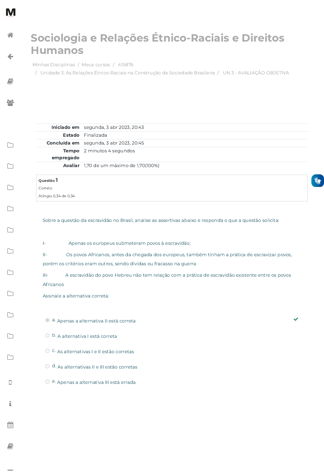 03/04/23, 20:45 UN 3 - AVALIAÇÃO OBJETIVA: Revisão da tentativa https://avap.multivix.edu.br/mod/quiz/review.php?attempt=2671171&cmid=1331671 1/4 Minhas Disciplinas / Meus cursos / 415876 / Unidade 3: As Relações Étnico-Raciais na Construção da Sociedade Brasileira / UN 3 - AVALIAÇÃO OBJETIVA Sociologia e Relações Étnico-Raciais e Direitos Humanos Iniciado em segunda, 3 abr 2023, 20:43 Estado Finalizada Concluída em segunda, 3 abr 2023, 20:45 Tempo empregado 2 minutos 4 segundos Avaliar 1,70 de um máximo de 1,70(100%) Questão 1 Correto Atingiu 0,34 de 0,34 Sobre a questão da escravidão no Brasil, analise as assertivas abaixo e responda o que a questão solicita: I- Apenas os europeus submeteram povos à escravidão; II- Os povos Africanos, antes da chegada dos europeus, também tinham a prática de escravizar povos, porém os critérios eram outros, sendo dívidas ou fracasso na guerra III- A escravidão do povo Hebreu não tem relação com a prática de escravidão existente entre os povos Africanos Assinale a alternativa correta: a. Apenas a alternativa II está correta b. A alternativa I está correta c. As alternativas I e II estão corretas d. As alternativas II e III estão corretas e. Apenas a alternativa III está errada https://avap.multivix.edu.br/my/ https://avap.multivix.edu.br/course/view.php?id=20592 https://avap.multivix.edu.br/course/view.php?id=20592§ion=4 https://avap.multivix.edu.br/mod/quiz/view.php?id=1331671 https://avap.multivix.edu.br/my/ https://avap.multivix.edu.br/course/view.php?id=20592 https://avap.multivix.edu.br/user/index.php?id=20592 https://avap.multivix.edu.br/course/view.php?id=20592§ion=1 https://avap.multivix.edu.br/course/view.php?id=20592§ion=2 https://avap.multivix.edu.br/course/view.php?id=20592§ion=3 https://avap.multivix.edu.br/course/view.php?id=20592§ion=4 https://avap.multivix.edu.br/course/view.php?id=20592§ion=5 https://avap.multivix.edu.br/course/view.php?id=20592§ion=6 https://avap.multivix.edu.br/course/view.php?id=20592§ion=7 https://avap.multivix.edu.br/course/view.php?id=20592§ion=8 https://avap.multivix.edu.br/course/view.php?id=20592§ion=9 https://avap.multivix.edu.br/course/view.php?id=20592§ion=10 https://avap.multivix.edu.br/course/view.php?id=20592§ion=11 https://avap.multivix.edu.br/hooks/portal/ https://avap.multivix.edu.br/mod/page/view.php?id=1252%2F%22%20target%3D%22_blank https://avap.multivix.edu.br/calendar/view.php/ https://avap.multivix.edu.br/local/staticpage/view.php?page=biblioteca https://portalweb.multivix.edu.br/gabaritos/login.aspx https://avap.multivix.edu.br/ 03/04/23, 20:45 UN 3 - AVALIAÇÃO OBJETIVA: Revisão da tentativa https://avap.multivix.edu.br/mod/quiz/review.php?attempt=2671171&cmid=1331671 2/4 Questão 2 Correto Atingiu 0,34 de 0,34 Escolha uma opção: a. III,IV e V apenas b. I, III ,IV e V, apenas. c. I, II, IV e V apenas. d. II e V apenas. e. I e II, apenas. O processo de abolição da escravidão está relacionado a diversas lutas da população negra, que em busca de melhores condições de vida e liberdade se mobilizaram para superar a escravidão. Considerando o processo de abolição da escravidão, avalie as afirmações a seguir. I. Os negros foram os principais protagonistas na conquista da própria liberdade; II. A Lei dos Sexagenários garantiu que todos os escravizados com mais de 80 anos fossem libertos; III. A princesa Isabel assinou a Lei Áurea em um período histórico quando, segundo o historiador Sidney Chalhoub (2011), apenas 5% da população negra ainda vivia escravizada. IV. Lei do Ventre Livre determinou que os escravizados nascidos, a partir da data da promulgação da lei, seriam considerados livres, porém essa liberdade seria concedida apenas quando o indivíduo completasse vinte e um anos de idade. V. A Lei Eusébio de Queiroz proibiu o tráfico negreiro em 1850. É correto o que se afirma em " https://avap.multivix.edu.br/my/ https://avap.multivix.edu.br/course/view.php?id=20592 https://avap.multivix.edu.br/user/index.php?id=20592 https://avap.multivix.edu.br/course/view.php?id=20592§ion=1 https://avap.multivix.edu.br/course/view.php?id=20592§ion=2 https://avap.multivix.edu.br/course/view.php?id=20592§ion=3 https://avap.multivix.edu.br/course/view.php?id=20592§ion=4 https://avap.multivix.edu.br/course/view.php?id=20592§ion=5 https://avap.multivix.edu.br/course/view.php?id=20592§ion=6 https://avap.multivix.edu.br/course/view.php?id=20592§ion=7 https://avap.multivix.edu.br/course/view.php?id=20592§ion=8 https://avap.multivix.edu.br/course/view.php?id=20592§ion=9 https://avap.multivix.edu.br/course/view.php?id=20592§ion=10 https://avap.multivix.edu.br/course/view.php?id=20592§ion=11 https://avap.multivix.edu.br/hooks/portal/ https://avap.multivix.edu.br/mod/page/view.php?id=1252%2F%22%20target%3D%22_blank https://avap.multivix.edu.br/calendar/view.php/ https://avap.multivix.edu.br/local/staticpage/view.php?page=biblioteca https://portalweb.multivix.edu.br/gabaritos/login.aspx 03/04/23, 20:45 UN 3 - AVALIAÇÃO OBJETIVA: Revisão da tentativa https://avap.multivix.edu.br/mod/quiz/review.php?attempt=2671171&cmid=1331671 3/4 Questão 3 Correto Atingiu 0,34 de 0,34 Questão 4 Correto Atingiu 0,34 de 0,34 Os negros africanos escravizados em nosso país protagonizaram diferentes revoltas em busca da conquista da liberdade. Contudo, tivemos um movimento que sua luta não se limitava a exigência de liberdade, havia também a ideia de instituir uma República na Bahia e, assim, instituir uma forma de governo que teria o papel de governar de acordo com os desejos do povo. Qual movimento protagonizou essa luta? Escolha uma opção: a. Revolta da Vacina b. Farroupilha. c. Cabanagem. d. Revolta dos Malês. e. Canudos. Observando a escravização dos povos africanos no Brasil, bem como a luta pela liberdade, notamos uma série de revoltas, motins, fugas e organização de quilombos. Toda essa trajetória nos revela que a abolição deu-se 