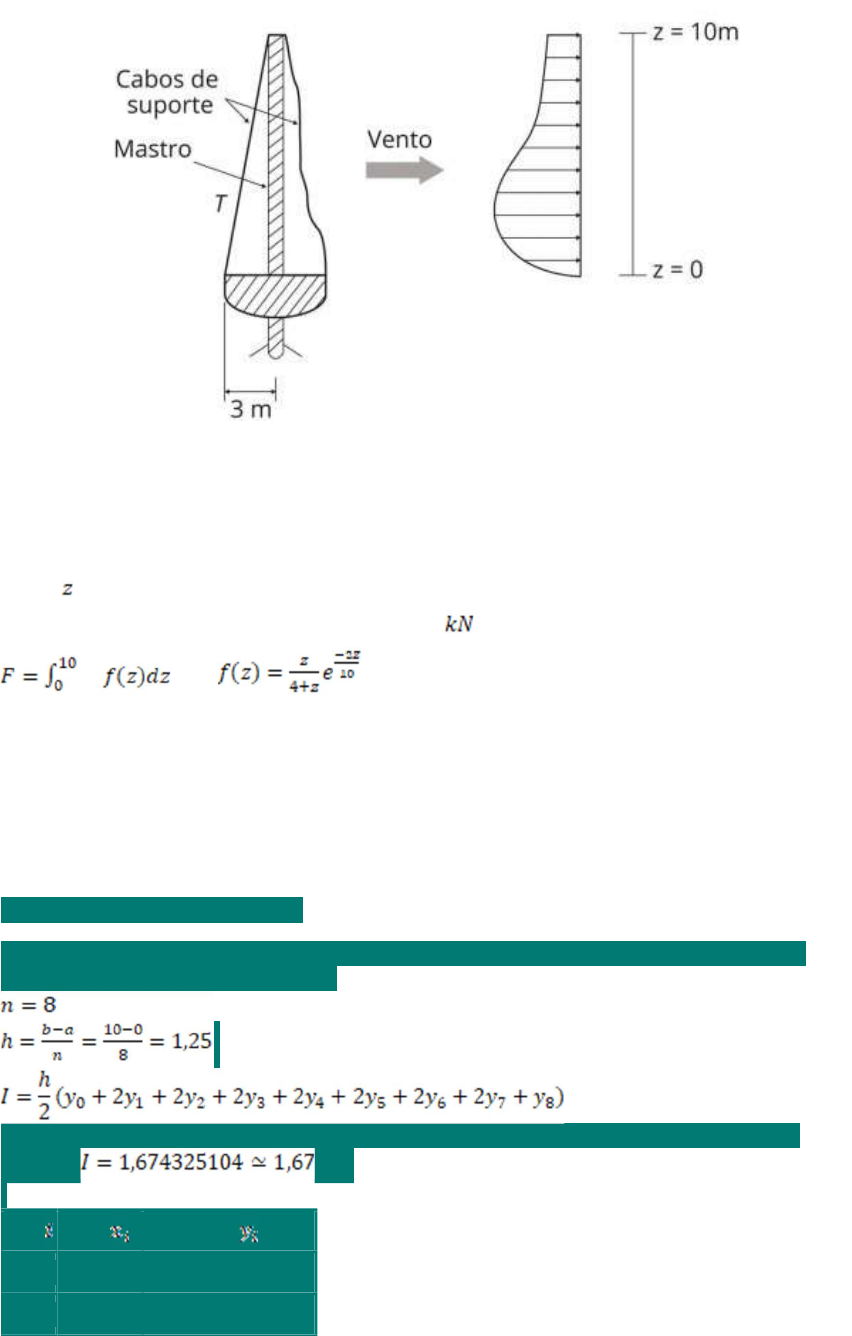 Franco (2013) a seção reta de um veleiro está mostrada na Figura abaixo: Fonte: Franco, Neide Maria Bertoldi. Cálculo Numérico. São Paulo: Editora Pearson, 2013, p. 376. A força que o vento exerce sobre o mastro (devido às velas) varia conforme a altura (em metros) a partir do convés. Medidas experimentais constataram que a força resultante exercida sobre o mastro (em ) é dada pela equação: , Usando a regra dos trapézios composta, com 8 trapézios, desconsiderando a fórmula do erro de truncamento, calcule essa força resultante. Referência: Franco, Neide Maria Bertoldi. Cálculo Numérico. São Paulo: Editora Pearson, 2013. RESPOSTA CORRETA: 1,67 kN Resposta correta. A alternativa está correta, pois aplicando a regra dos trapézios composta com 8 trapézios, temos Assim, arrumando e substituindo os pontos dados na tabela, podemos calcular o valor de kN. 0 0 0 1 1,25 0,185428758 2 2,5 0,233281023 3 3,75 0,228564461 4 5 0,204377467 5 6,25 0,174698047 6 7,5 0,14551967 7 8,75 0,119256628 8 10 0,096668059