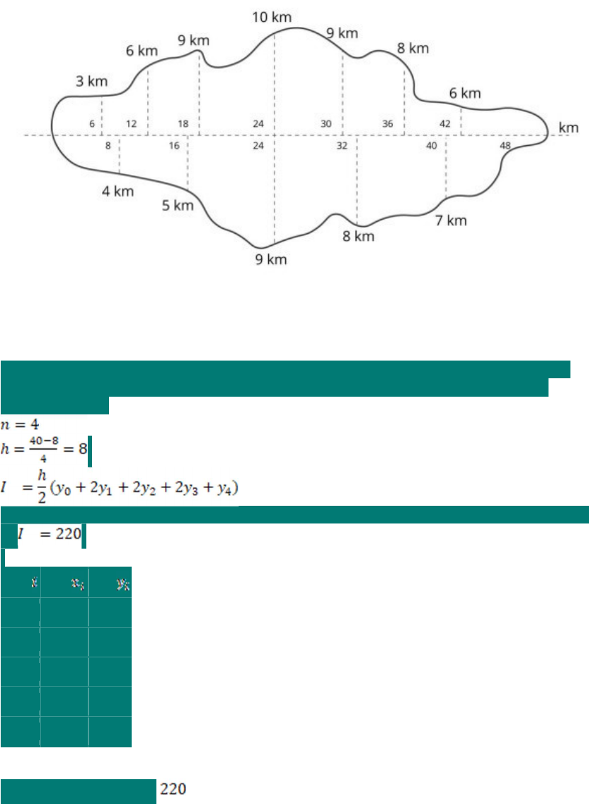 (Décio Sperandio et al, 2014, p. 222, adaptado) A Figura representa a fotografia de um lago com as medidas em quilômetros. Calcule uma aproximação para a área localizada abaixo da reta horizontal, em quilômetros quadrados, por meio da regra dos trapézios composta utilizando todos os pontos possíveis nesta região. Referência: Décio Sperandio; João Teixeira Mendes; Luiz Henry Monken e Silva. Cálculo numérico, 2ª edição. São Paulo: Editora Pearson, 2014 Resposta correta. A alternativa está correta, pois aplicando a regra dos trapézios composta com 5 pontos distintos, encontramos a área solicitada. Para a parte inferior, temos: Logo, arrumando e substituindo os pontos lidos na Figura, podemos calcular o valor de . 0 8 4 1 16 5 2 24 9 3 32 8 4 40 7 RESPOSTA CORRETA: