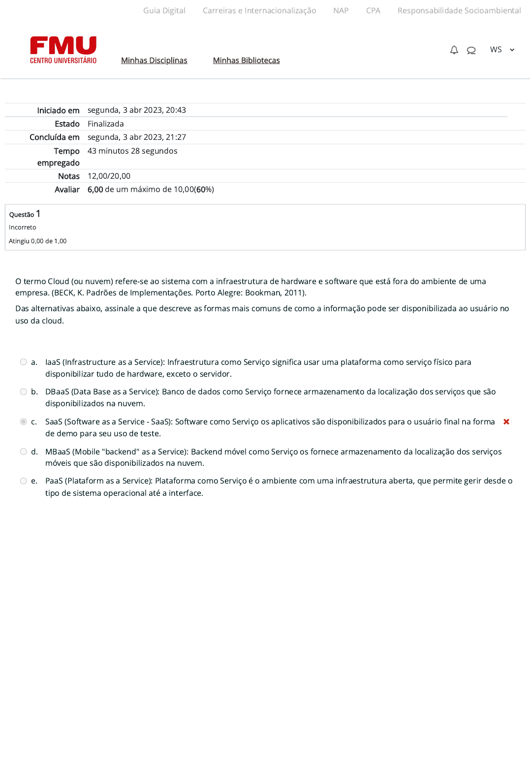 Iniciado em segunda, 3 abr 2023, 20:43 Estado Finalizada Concluída em segunda, 3 abr 2023, 21:27 Tempo empregado 43 minutos 28 segundos Notas 12,00/20,00 Avaliar 6,00 de um máximo de 10,00(60%) Questão 1 Incorreto Atingiu 0,00 de 1,00 O termo Cloud (ou nuvem) refere-se ao sistema com a infraestrutura de hardware e software que está fora do ambiente de uma empresa. (BECK, K. Padrões de Implementações. Porto Alegre: Bookman, 2011). Das alternativas abaixo, assinale a que descreve as formas mais comuns de como a informação pode ser disponibilizada ao usuário no uso da cloud. a. IaaS (Infrastructure as a Service): Infraestrutura como Serviço signi�ca usar uma plataforma como serviço físico para disponibilizar tudo de hardware, exceto o servidor. b. DBaaS (Data Base as a Service): Banco de dados como Serviço fornece armazenamento da localização dos serviços que são disponibilizados na nuvem. c. SaaS (Software as a Service - SaaS): Software como Serviço os aplicativos são disponibilizados para o usuário �nal na forma de demo para seu uso de teste. d. MBaaS (Mobile "backend" as a Service): Backend móvel como Serviço os fornece armazenamento da localização dos serviços móveis que são disponibilizados na nuvem. e. PaaS (Plataform as a Service): Plataforma como Serviço é o ambiente com uma infraestrutura aberta, que permite gerir desde o tipo de sistema operacional até a interface. Guia Digital Carreiras e Internacionalização NAP CPA Responsabilidade Socioambiental Minhas Disciplinas Minhas Bibliotecas WS https://codely-fmu-content.s3.amazonaws.com/Moodle/GuiaDigital/Guia+digital/index.html https://carreiras.fmu.br/ https://codely-fmu-content.s3.amazonaws.com/Moodle/NAP/inicial/nap/fmu/index.html https://codely-fmu-content.s3.amazonaws.com/Moodle/CPA/landing_CPA/index.html https://portal.fmu.br/sustentabilidade https://ambienteacademico.com.br/ https://ambienteacademico.com.br/ https://ambienteacademico.com.br/course/view.php?id=236 Questão 2 Correto Atingiu 1,00 de 1,00 Questão 3 Correto Atingiu 1,00 de 1,00 A linguagem UML (Uni�ed Modeling Language) apresenta diagramas que podem representar a estrutura do software com a �loso�a de orientação a objetos e ainda a descrição de seu comportamento (RUMBAUGH J; JACOBSON I; BOOCH, G. The Uni�ed Modeling Language Reference Manual. 2. ed. São Paulo: Pearson Education, 2005). Das alternativas abaixo, assinale a que descreve as características do diagrama de Atividades quando no uso de �loso�a UML. a. Muito utilizado por desenvolvedores e analistas, possui grande importância para o desenvolvimento do sistema, por ter característica estática dos eventos. b. Utilizado pelos representantes comerciais para demonstrar ao cliente como está a sequência de ações de desenvolvimento do produto. c. Tem todas as características técnicas determinantes para o para que o cliente compare com o escopo determinado para o sistema. d. Representa �uxo e processamento, para entender como os dados �uirão pelo sistema e ainda como as decisões são tomadas dentro dele. e. Descreve as funcionalidades da classe em todos os eventos que a mesma faz parte durante sua existência no sistema, em detalhes. A linguagem UML (Uni�ed Modeling Language) apresenta diagramas que podem representar a estrutura do software com a �loso�a de orientação a objetos e ainda a descrição de seu comportamento (RUMBAUGH J; JACOBSON I; BOOCH, G. The Uni�ed Modeling Language Reference Manual. 2. ed. São Paulo: Pearson Education, 2005). Das alternativas abaixo, assinale a que descreve as características dos diagramas estruturais em UML. a. Diagrama de classes é o diagrama que fornece a estrutura principal da solução apresentada, já do produto �nal desenvolvido. b. São utilizados por proporcionarem como ver o aspecto do sistema do ponto de vista do sistema, quanto aos seus componentes e classes. c. Representado por um diagrama que apresenta o desenho de como a solução será desenvolvida e que serve de documentação �nal. d. Os aspectos dinâmicos de um sistema de software são as classes, as interfaces, as colaborações, os componentes. e. De�nir a parte dinâmica de todas as partes do sistema, na forma como cada uma troca informação e se comunica. Guia Digital Carreiras e Internacionalização NAP CPA Responsabilidade Socioambiental Minhas Disciplinas Minhas Bibliotecas WS https://codely-fmu-content.s3.amazonaws.com/Moodle/GuiaDigital/Guia+digital/index.html https://carreiras.fmu.br/ https://codely-fmu-content.s3.amazonaws.com/Moodle/NAP/inicial/nap/fmu/index.html https://codely-fmu-content.s3.amazonaws.com/Moodle/CPA/landing_CPA/index.html https://portal.fmu.br/sustentabilidade https://ambienteacademico.com.br/ https://ambienteacademico.com.br/ https://ambienteacademico.com.br/course/view.php?id=236 Questão 4 Incorreto Atingiu 0,00 de 1,00 Questão 5 Correto Atingiu 1,00 de 1,00 A linguagem UML (Uni�ed Modeling Language) apresenta diagramas que podem representar a estrutura do software com a �loso�a de orientação a objetos e ainda a descrição de seu comportamento (RUMBAUGH J; JACOBSON I; BOOCH, G. The Uni�ed Modeling Language Reference Manual. 2. ed. São Paulo: Pearson Education, 2005). Das alternativas abaixo, assinale a que descreve as características do diagrama de objetos, quando no uso de �loso�a UML. a. É usado para mostrar como todo o sistema funciona, por ser mais especí�co e ter mais detalhes do que o diagrama de classes. b. Este diagrama não tem relação com a digrama de classes, pois trata das ações do objeto e não da forma como ele é feito. c. São diferentes em relação ao diagrama de classes na apresentação, mas trata objeto e classe da mesma forma. d. Mesmo pouco utilizado, tem sua importância quanto a apresentar uma visão da estrutura estática de um sistema. e. Ícone de objeto representa todas as instâncias, de uma classe especí�ca, que existem, existiram