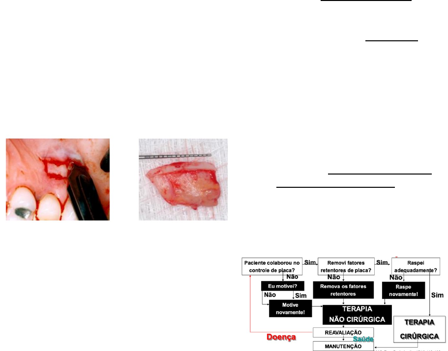 Tipos de retalho O que é retalho periodontal? · É uma secção do tecido periodontal no qual há separação dos tecidos adjacentes, mas o mesmo se mantem conectado em sua base por um pedículo · Enxerto não é retalho, para ser retalho a base precisa estar inserida em sua origem *Isso NÃO é um retalho Requisitos básicos das cirurgias à retalho · O retalho deve ser grande o suficiente para expor qualquer defeito ósseo subjacente ou mobilizar a extensão de tecido desejada · A base do retalho (quando houver incisão relaxantes) deve ser ampla o bastante para manter um suprimento sanguíneo adequado (a base do retalho deve ser sempre maior ou do tamanho da incisão coronária) · As incisões devem permitir o movimento do retalho sem tensão (quando houver incisão relaxante) ou ser extenso suficiente para que haja mobilização adequada (sem incisão relaxante) · Nenhum vaso ou nervo importante deve ser danificado, ao se levantar o retalho Quando realizar cirurgia periodontal à retalho? · Pacientes com saúde sistêmica · Quando necessário, solicitar exames sistêmicos · Diabéticos somente controlados · Pacientes fumantes: não estão contra-indicadas as cirurgias periodontais, mas deve-se sempre avaliar o risco e benefício · Pacientes com saúde periodontal restabelecida, que estejam aptos a manter níveis adequados de biofilme · Em sítios com doença periodontal persistente apenas após realização das terapias inicial e básica (quando não houver remissão completa da DP) Tomada de decisão na reavaliação Objetivos das cirurgias periodontais à retalho · Eliminação de bolsas periodontais (historicamente) · Acesso as bolsas periodontais profundas · Reanatomização óssea, do periodonto de proteção e de inserção e de defeitos de furca · Facilitar controle de biofilme · Restabelecimento de espaço biológico · Regeneração periodontal · Estética · Criação do tecido ceratinizado Indicações das cirurgias periodontais · Pacientes com bom compliance (adesão ao tratamento) · Após o termino da TI e TB periodontal · Reanatomização gengival e óssea · Correção de defeitos de furca (melhora o acesso para higienização) · Correção de defeitos mucogengivais · Acesso a defeitos periodontais não-responsivos à TI e TB · Necessidade estética (sempre demandada pelo paciente) · Invasão de espaço biológico Contraindicações gerais em todas as cirurgias · Pacientes com comprometimentos sistêmicos · Pacientes que usam drogas imunossupressoras ou anticoagulantes · Pacientes que estejam fazendo radio ou quimioterapia · Pacientes com suspeita de dengue ou COVID · Primeiro e terceiro trimestre de gestação (Avaliar) Contraindicações específicas das cirurgias periodontais · Quando a TI e TB forem suficientes para controle de infecção · Quando o paciente não tiver estética como queixa · Pacientes que não controlem adequadamente biofilme (paciente fica com lesão) · Infecções agudas (todos os pacientes precisam estar tratados do ponto de vista infeccioso para depois planejar) O que é necessário para se realizar cirurgia periodontal? · Fazer um correto diagnostico periodontal (anamnese + exame clínico + Rx complementar) · Exame clinico periodontal (IG, IP, NIC, REC, PS) · Rx complementar · Periapical: para visualização de toda extensão do periodonto de inserção e periápice · Interproximal: para visualização da altura da crista óssea, distância de crista para a JCE, restauração, fratura... Quando realizar cirurgia periodontal? · Cirurgia periodontal para auxilio à raspagem: · Após a realização da TI e TB e houver persistência doença periodontal em alguns sítios · Paciente está adequado e controla bem o biofilme · Cirurgia periodontal ressectivas de raiz ou osso · Quando houver necessidade de reanatomização de raízes ou defeitos osseos após TI e TB (paciente deve estar bem controlado) · Cirurgia mucogengival estética e corretivas: somente quando houver saúde periodontal e bom controle de biofilme Passos básicos de todas cirurgias 1. Incisão (seria onde inserir a lamina de bisturi) e a delimitação da extensão (caso tenha incisões relaxantes) 2. Confecção do retalho quanto à espessura 3. Posicionamento final do retalho 4. Sutura Tipos de incisão · Incisão intra-sulcular Porção terminal da ponta ativa da lâmina voltada para o interior do sulco ou bolsa periodontal, tocando o osso alveolar A lâmina penetra o sulco/bolsa, seguindo paralela ao longo eixo do dente preservando o tecido gengival Quando realizar? preservação de altura do tecido gengival retalho parcial acesso cirúrgico para raspagem (acesso osso e raiz) segundo passo da gengivectomia de bisel interno para remoção do colarinho gengival · Incisão em bisel interno A lâmina penetra em uma angulação com relação a superfície dental e encostando na superfície dental ou alveolar. Uma faixa de tecido gengival é delimitada para ser removida O bisel no tecido gengival fica voltado para a superfície dentaria. Quanto maior o ângulo com relação à superfície dental, maior a faixa (altura) de tecido removido Quando realizar? O bisel interno pode ser realizado quando há necessidade de remoção em altura de tecido gengival, não há possibilidade de ser associado à cirurgia de retalho total. Não há acesso a osso ou raiz Tipos de retalho quanto à espessura Retalho total ou mucoperiósteo · Retalho total ou mucoperiosteal ou mucoperiósteo retalho mucoso que pode englobar somente gengiva ou gengiva e mucosa alveolar. Sempre engloba a elevação (deflecção) do periósteo Objetivos do retalho total · Exposição radicular · Exposição do osso alveolar Quando realizar? · Sempre que houver necessidade de acesso ao osso e à raiz Técnica cirúrgica · Incisão bisel interno ou intra-sulcular · Elevação de toda espessura do retalho, incluindo o periósteo, deixando osso e raiz expostos · Pode haver ou