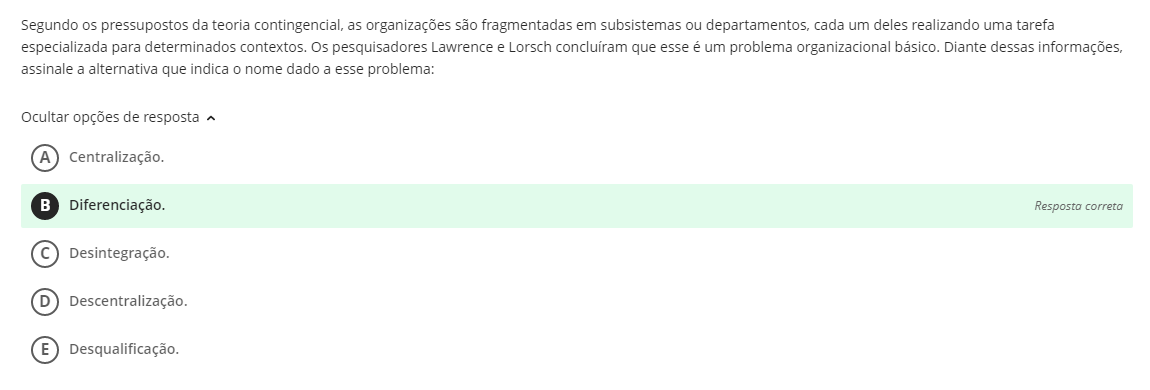 Segundo os pressupostos da teoria contingencial, as organizações são fragmentadas em subsistemas ou departamentos, cada um deles realizando uma tarefa especializada para determinados. Os pesquisadores Lawrence e Lorsch concluíram que esse é um problema organizacional básico. Diante dessas informações, assinale a alternativa que indica nome dado a esse problema: A - Centralização. B - Diferenciação. C - Desintegração. D - Descentralização. E - Desqualificação.