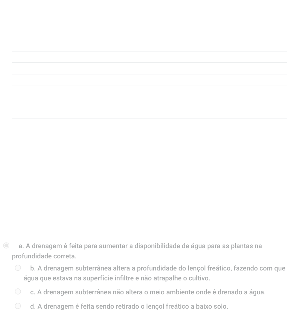 Irrigação e Drenagem / Atividades / Simulado - Irrigação e Drenagem Iniciado em terça, 4 Abr 2023, 12:11 Estado Finalizada Concluída em terça, 4 Abr 2023, 12:19 Tempo empregado 8 minutos 20 segundos Avaliar 4,0 de um máximo de 10,0(40%) Comentários Tente novamente! Você pode melhorar. Questão 1 Incorreto Atingiu 0,0 de 1,0 Sobre a drenagem subterrânea e o efeito do seu processo, assinale a opção correta. Escolha uma opção: a. A drenagem é feita para aumentar a disponibilidade de água para as plantas na profundidade correta. b. A drenagem subterrânea altera a profundidade do lençol freático, fazendo com que água que estava na superfície in�ltre e não atrapalhe o cultivo. c. A drenagem subterrânea não altera o meio ambiente onde é drenado a água. d. A drenagem é feita sendo retirado o lençol freático a baixo solo. https://grupoevolucao.com.br/ead/course/view.php?id=93 https://grupoevolucao.com.br/ead/course/view.php?id=93#section-2 https://grupoevolucao.com.br/ead/mod/quiz/view.php?id=3298 Questão 2 Incorreto Atingiu 0,0 de 1,0 Caso aconteça uma precipitação na cidade de Brasília, e o no jornal apareça que choveu 250 mm, de acordo com os cálculos de água pluvial, assinale a opção correspondente a quanto choveu. Escolha uma opção: Questão 3 Incorreto Atingiu 0,0 de 1,0 No que se refere ao sistema de irrigação por aspersão, assinale a alternativa INCORRETA: Escolha uma opção: a. Choveu 2,5 litros por metro quadrado. b. Choveu 2500 litros por metro quadrado. c. Choveu 25 litros por metro quadrado. d. Choveu 250 litros por metro quadrado. a. Refere-se a um sistema de irrigação encontrado onde a água é sugada por meio de motores. b. Adapta-se a inúmeras culturas e a qualquer tipo de condições topográ�cas. c. Refere-se a um sistema de irrigação encontrado onde a água é aspergida por meio de microaspersores, isto é, miniaturas de aspersores próximo ao sistema radicular das plantas. d. É largamente utilizado em fruticultura, irrigação em casas de vegetação, jardins entre outros. Questão 4 Correto Atingiu 1,0 de 1,0 Tendo como base a legislação que trata da irrigação, assinale entre as alternativas a que se refere ao artigo 1° da Lei 12.787. Escolha uma opção: Questão 5 Incorreto Atingiu 0,0 de 1,0 Um fator importante dentro do planejamento da irrigação são os problemas ambientais possíveis causados por ela, sobre isso assinale a opção correta. Escolha uma opção: a. O artigo 1º trata da Política Nacional de Irrigação a ser executada em todo o território nacional. b. O artigo 1º trata exclusivamente dos fatores relevantes que podem interferir nos processos de irrigação. c. O artigo 1º trata dos conceitos gerais utilizados na irrigação da agricultura. d. O artigo 1º trata da identi�cação de possíveis fatores e do uso da irrigação nas plantações. a. A alteração da fauna e a �ora dos cursos d’água, provocando multas. b. A drenagem colabora para diminuição do impacto ambiental. c. Uma irrigação mal dimensionada provoca um aumento no custo de funcionamento para o produtor. d. Problema com empobrecimento da qualidade da água, não é relevante, pois é reversível. Questão 6 Incorreto Atingiu 0,0 de 1,0 Na escolha do método de irrigação é importante se atentar a dois parâmetros, escolha a opção correta. Escolha uma opção: Questão 7 Incorreto Atingiu 0,0 de 1,0 Assinale a alternativa que se refere à salinização do solo. Escolha uma opção: a. Vazão e área irrigada. b. Água disponível e vazão. c. Vazão e velocidade. d. Água disponível e área irrigada. a. Esse impacto surge diante da in�ltração da água nos canais e da percolação. As áreas irrigadas não possuem lençóis freáticos e nem salinizados. b. As áreas irrigadas não possuem lençóis freáticos elevados. c. As áreas irrigadas possuem inúmeros lençóis freáticos elevados e automaticamente não salinizados. d. A salinização provoca impacto que surge diante da in�ltração da água nos canais e da percolação do excesso de água cultivada na irrigação. As áreas irrigadas podem possuir lençóis freáticos elevados e automaticamente salinizados. Questão 8 Correto Atingiu 1,0 de 1,0 A irrigação é um mecanismo excelente para aumentar a produtividade agrícola, quando usada de forma responsável e e�ciente, no entanto assinale a opção que mostra as desvantagens da irrigação. Escolha uma opção: Questão 9 Correto Atingiu 1,0 de 1,0 Assinale a alternativa que corresponde aos parâmetros de dimensionamento de irrigação por aspersão. Escolha uma opção: a. Salinização, contaminação dos recursos hídricos, consumo elevado de energia. b. Salinização do solo, contaminação dos recursos hídricos, aumento da janela produtiva. c. Salinização do solo, modi�cação do ambiente, maior acesso das culturas a água. d. Modi�cação do ambiente, salinização do solo, aumenta a produtividade das culturas. a. Dimensionamento das tubulações laterais em nível e principal altura manométrica total e a potência da bomba. b. Dimensionamento de todas as tubulações principais, altura manométrica parcial e potência relativa da bomba. c. Dimensionamento das tubulações centrais e potência da bomba. d. Dimensionamento da altura manométrica total e tamanho da bomba. Questão 10 Correto Atingiu 1,0 de 1,0 Em relação à in�ltração acumulada, assinale a alternativa correta: Escolha uma opção: a. Refere-se à quantidade total de água in�ltrada durante um determinado tempo (cm, mm, L/m 2; L/m). b. Refere-se ao solo relativamente seco, ou ao potencial de in�ltração. c. Tem a ver com a ação do tempo em relação à quantidade de água que cai em um determinado local. d. Refere-se ao tempo e a redução da velocidade em que a água da chuva cai em um determinado local.