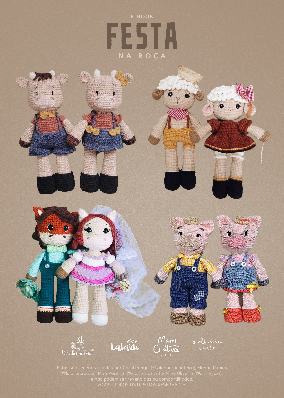 Estas são receitas criadas por Carol Rangel (@viladacrocheteira), Elayne Ramos (@lalartecroche), Mari Pereira (@marricriativa) e Aline Oliveira (@alline_o.o). e não podem ser revendidas ou compartilhadas. 2022 - TODOS OS DIREITOS RESERVADOS FESTA E-BOOK N A R O Ç A Ovelhinha Crochê Carolline Rangel .................................................................................................................3 Elayne Ramos ......................................................................................................................4 Mari Pereira ..........................................................................................................................5 Aline Oliveira ........................................................................................................................6 Pirataria ....................................................................................................................................7 Legenda de Pontos ...........................................................................................................8 Personagens ..........................................................................................................................9 Zeca e Florentina .............................................................................................................10 Valente e Mimosa ...........................................................................................................35 Romeu e Mafalda ............................................................................................................56 Zé e Mariazinha ...............................................................................................................78 Sumário Olá! Me chamo Carolline Rangel e sou a artesã por trás da Vila da Crocheteira. Aprendi a fazer crochê com 7 anos olhando uma professora. Inicialmente, eu só fazia barrinhas de pano de prato. Não podia ver um pano que saia fazendo barra. 😅😂 No ano de 2019, quando tivemos 2 gravidez na família e eu quis confeccionar roupinhas de bebês para minha sobrinha e prima, descobri o mundo dos amigurumis. Na época, em uma das minhas procuras de roupas de crochê no Youtube, vi um vídeo ensinando a fazer uma girafa e outro uma vaquinha em amigurumi. Decidi confeccionar estas peças e nunca mais parei de fazer bichinhos de crochê. Com o passar do tempo fui recebendo encomendas de pessoas próximas, até que no dia 23 de março de 2021 criei um instagram do 0 para divulgar meu trabalho. Desde então venho exercitando minha criatividade aqui na Vila 😍 CarolLINE Rangel @viladacrocheteira Carol desenvolveu o cavalinho Zeca e a eguinha Florentina. ELAYNE RAMOS @lalartecroche Oiê, tudo bom com você? Eu sou a Elayne, a artesã por trás da Lalarte, sou crocheteira desde 2017 e apaixonada pelo mundo materno, por isso minhas peças foram desde o início e, até hoje são, dedicadas especialmente aos bebês. Bem no comecinho meu maior incentivo foi a vinda do meu irmão caçula, a quem me empenhei a fazer os meus primeiros sapatinhos, amigurumis e até roupinhas. Desde então minha maior paixão se tornou trabalho e descobri que poderia levar para mais e mais bebês todo o conforto e segurança que eles poderiam obter ao usar peças 100% pensadas para eles. Conto contigo para disseminar tamanho carinho em forma de pontinhos e espero de coração que você aproveite todo o processo delicioso que é confeccionar a Mimosa e o Valente e, por favor, não deixe de me falar o que você achou da receita deles, teu feedback é muito importante para mim! Elayne desenvolveu o boi Valente e a vaca Mimosa. @marricriativa MARI PEREIRA Olá, eu sou a Mari (Mariane Pereira), sou a artesã por trás do MarriCriativa Ateliê. Tenho 28 anos, sou casada e moro em Osasco-SP. Faço Amigurumis desde 2019 quando fiquei grávida do Rafael, que hoje tem 3 anos e é minha inspiração diária. Já criei diversas receitas, mas só em 2021 comecei a trabalhar profissionalmente e mostrá-las para o mundo. Atualmente, dentre os padrões gratuitos e pagos, os que mais fazem sucesso são o Etevaldo, as Coleções Os Simpsons e a Dinossaura Pérola.♡ A cada dia eu aprendo mais com o mundo do crochê e tento mostrar um pouco disso nas minhas receitas. Mari desenvolveu o porquinho Romeu e a porquinha Mafalda. @alline_o.o ALINE OLIVEIRA Aline desenvolveu o carneirinho Zé e a ovelhinha Mariazinha Meu nome é Aline e trabalho exclusivamente com os amigurumis há quase 2 anos. Foi através da minha gestação que me descobri neste mundo, procurando a decoração perfeita para o quartinho de minha filha, procurando algo exclusivo, e daí surgiu essas fofuras… O primeiro amigurumi que fiz para ela foi um ursinho (por ser o primeiro, até que ficou bonitinho 😊). Fui postando fotos e vídeos, e então foi surgindo interesse de minhas amigas, que começaram a divulgar em suas redes sociais também. Recebi minha primeira encomenda no final de 2020 e não parei mais. Hoje já são mais de 200 peças produzidas. Com o passar do tempo, fui criando meus próprios padrões e ganhando o coração de vocês. Decidi colocar à venda minha primeira receita (o casal caipira), e em apenas três dias foram vendidos para mais de 30 pessoas Cada criação e cada peça, são feitas com muito amor e carinho !! OBRIGADA por fazer parte de mais um projeto. Deus abençoe Ovelhinha Crochê Contamos com sua colaboração! DIGA NÃO A PIRATARIA! Estas receitas ou partes delas NÃO PODEM ser compartilhadas de nenhuma forma. Elas não devem ser reproduzidas, distribuídas ou revendidas. Além de não poderem ser alteradas e/ou publicadas. Trata-se de um produto pessoal e intransferível. Ao disponibilizar e/ou comercializar este material você estará violando a Lei 9.610/98 referente aos direitos autorais. Você tem total permissão para confeccionar as peças e vender o produto físico final, desde que deixe claro que o traba