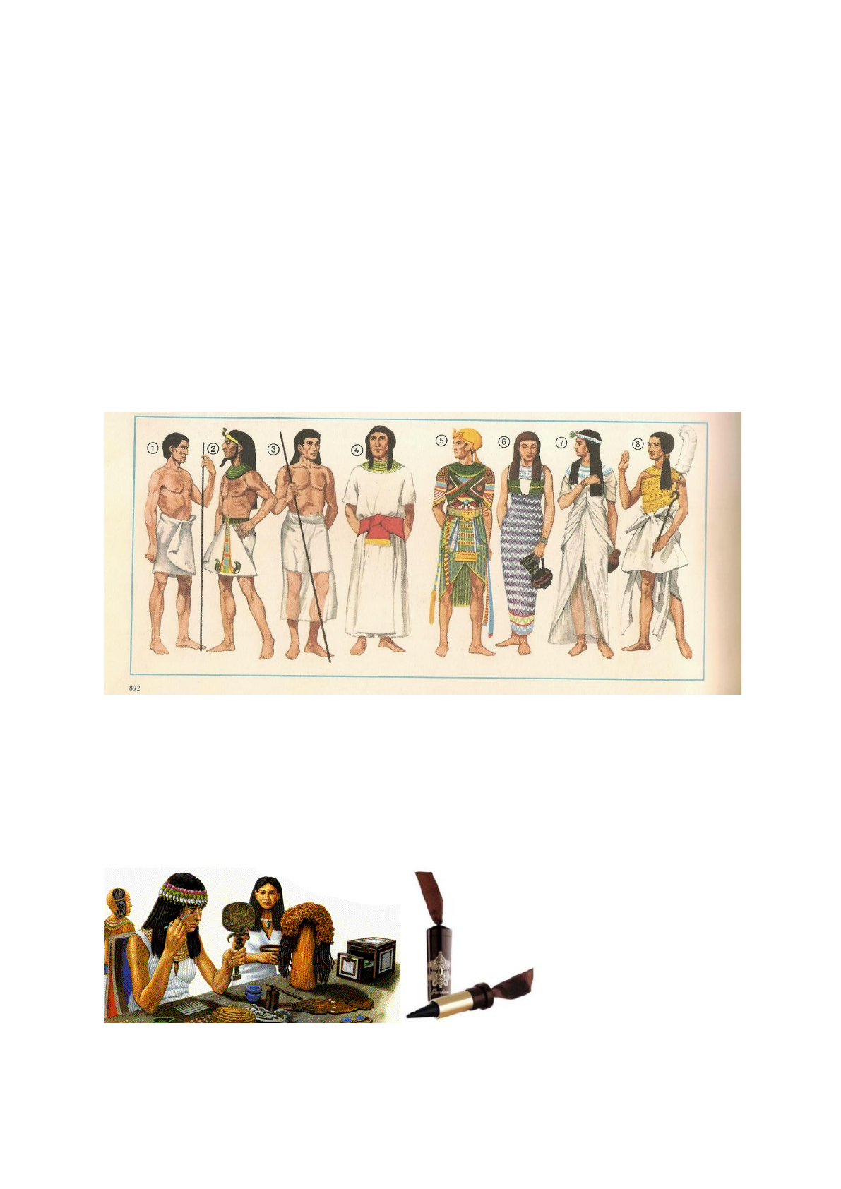 -Como se vestiam os faraós ? Homens e mulheres do antigo Egito usavam na maior parte do ano roupas de linho, com bem pouca costura. Geralmente, os homens usavam shorts-saia (longos ou curtos) presos na cintura, e as mulheres usavam vestidos longos e soltos, com amarração nos ombros (muitas vezes em apenas um dos ombros). A cor predominante das roupas era o branco, não apenas porque é uma cor leve para se usar em temperaturas quentes e debaixo do sol, mas também porque, para os egípcios, era um símbolo de pureza. Os faraós usavam roupas de linho transparentes e com pregas para mostrar status, prestígio, força e saúde. Quanto mais nobres e importantes, mais pregas suas roupas tinham. E quanto mais prestígio, mais maquiagem usavam. Pintavam os olhos com tinta bem escura e usavam essências no corpo (como perfumes). Aqueles “cocares” usados pelos nobres egípcios também eram feitos de linho. Originalmente, eram colocados somente sobre a cabeça e amarrados atrás. Nas dinastias seguintes, os reis e faraós passaram a usar tais cocares em suas perucas (feitas de cabelos naturais bem fininhos), presos por fitas de couro logo acima das sobrancelhas. - Maquiagem A Maquiagem surgiu no Egito Antigo por volta de 3.000 a.C., onde a pintura dos olhos era feita com o objetivo de refletir sua alma através dos olhos. Essas pinturas eram feitas com o Kohl, um pigmento preto usado como sombra para sublinhar o contorno dos olhos e das sobrancelhas. Além disso, também servia como proteção aos olhos contra bactérias e poeiras do deserto. Foi a partir desse momento que a maquiagem começou a criar forma, espalhando-se e representando povos do mundo inteiro! Antigamente, nas grandes guerras, os guerreiros se pintavam para mostrar força e até mesmo se camuflar nos campos de batalhas, um método tão eficaz que, como resultado, é usado até hoje pelos exércitos do mundo todo.