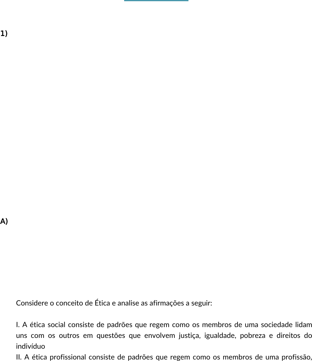 Exercício 3 1) (ADAPTADO DE ENADE, 2018) | Valores morais e éticos são importantes para aqueles que atuam na área de compras, fazendo com que empresas estabeleçam códigos de conduta. No setor de compras, o problema emerge devido aos valores monetários envolvidos. O objetivo do código de conduta ética é estabelecer critérios técnicos que irão constituir os limites comportamentais, minimizando condutas não condizentes com os interesses organizacionais. MARTINS, P. G.; ALT, P. R. Administração de recursos materiais e patrimoniais. 3. ed. São Paulo: Saraiva Uni, 2012 (adaptado). Nesse contexto, avalie as afirmações a seguir: I. As empresas estabelecem códigos de ética em compras para criar regras de conduta nos relacionamentos entre compradores e fornecedores. II. Quando as pessoas são qualificadas e recebem remuneração adequada à função, comportamentos antiéticos são reduzidos. III . A ética e os valores não são importantes para a área de compras. A respeito dessas afirmações, assinale a opção correta: A) I é verdadeira, II e III são falsas. B) I é falsa, II e III são verdadeiras. C) I , II e III são falsas. D) I, II e III são verdadeiras. E) I e II são falsas, III é verdadeira. Considere o conceito de Ética e analise as afirmações a seguir: I. A ética social consiste de padrões que regem como os membros de uma sociedade lidam uns com os outros em questões que envolvem justiça, igualdade, pobreza e direitos do indivíduo. II. A ética profissional consiste de padrões que regem como os membros de uma profissão, ocupação ou ofício devem proceder quando desempenham atividades relacionadas ao trabalho. III. A ética individual consiste de padrões e valores pessoais que determinam a maneira como as pessoas vêem suas responsabilidades em relação às outras pessoas e grupos e como devem agir nas situações em que seus próprios interesses estão em jogo. 2) IV. A ética organizacional consiste de práticas e crenças norteadoras por meio das quais uma determinada empresa e seus gerentes vêem sua responsabilidade perante seus stakeholders. Assinale a alternativa correta: A) I e II estão incorretas, III e IV estão corretas. B) I está incorreta, II, III e IV estão corretas. C) I, II, III e IV estão corretas. D) I, II e III estão incorretas, IV está incorreta. E) I, II, III e IV estão incorretas. 3) Analise as afirmações a seguir sobre habilidades e conhecimentos requeridos do profissional da Logística. I. Conhecimentos de gestão em geral, tais como processos, projetos, contabilidade e finanças; II. Conhecimentos técnicos, tais como modais e gestão de transportes, gestão de armazenagem, gestão de compras e fornecedores, logística reversa, e gestão de estoques; III. Habilidades pessoais e interpessoais, tais como comunicação, negociação e liderança. Assinale a alternativa com a resposta correta: A) as afirmações I, II e III estão incorretas. B) as afirmações I, II estão corretas e a III está incorreta. C) a afirmação I está correta e II e III estão incorretas. D) as afirmações I, III estão corretas e a II está incorreta. E) as afirmações I, II e III estão corretas. 4) Dentre as opções a seguir, assinale aquela que representa um desafio para o profissional da logística: A) disponibilidade cada vez maior de produtos ao longo da cadeia de suprimentos, possibilitando adquirir insumos a qualquer momento. B) aumento da complexidade da atividade logística em função da diversificação dos canais de vendas e distribuição. C) redução na demanda pela logística reversa, minimizando os processos de logística pós venda e pós consumo. D) operações sempre próximas do ponto de produção, reduzindo custos logísticos. E) aumento da área de armazenagem, estocagem e movimentação de materiais nas empresas, que sempre investem em tecnologia e estrutura.