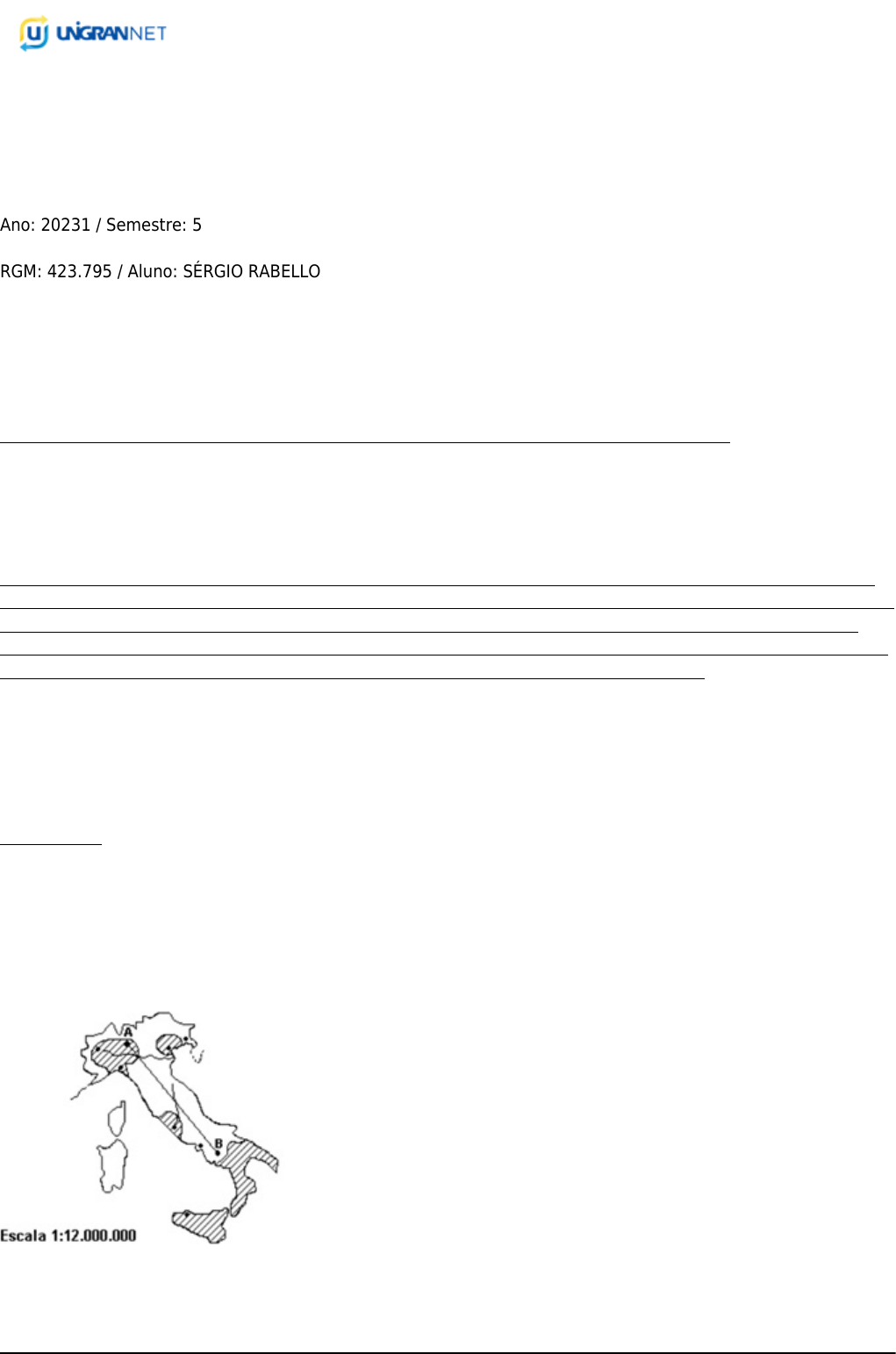 GABARITO Protocolo: 732492 Página 1 - 05/04/2023 às 12:18 Prova Data de aplicação: 25/03/2023 Curso: Engenharia Ambiental e Sanitária Disciplina: Topografia e Geodésia Ano: 20231 / Semestre: 5 RGM: 423.795 / Aluno: SÉRGIO RABELLO PROVA 01 Questão 1 Levando em consideração as características que descrevem o formato da terra na topografia, defina Geóide. Resposta do aluno: Um geoide e um modelo fisico que se aproxima a foram real do planeta. Questão 2 De acordo com as aplicações e funcionalidades do uso de coordenadas, argumente a importância das mesmas para área da engenharia. Resposta do aluno: o uso das coordenadas para a engenharia e importante pois, servem para descrevermos a localização de qualquer ponto da superfície terrestre, As coordenadas formam um sistema de localização que se estrutura através de linhas imaginarias, traçadas paralelamente entre si nos sentido norte-sul e leste-oeste, medidas em graus. ajudam a descobrir a posição de um ponto na superfície terrestre, a identificar as distancias relativas entre dois locais e ate nos dizem em que hemisfério ou região que se encontra. Questão 3 A transformação de unidade faz parte do dia-dia e se faz necessário. De acordo com o que foi e explanado e com conteúdo da aula assinale a alternativa que representa a correta transformação de 15 km. a) 1500 m b) 150000 m c) 15000000 mm (correta) d) 150 cm Questão 4 De acordo com o mapa A-B (6 cm) da ltália, a distância real em linha reta entre os pontos A e B é de: a) 72 km user Realce GABARITO Protocolo: 732492 Página 2 - 05/04/2023 às 12:18 b) 200 km c) 720 km (correta) d) 2 000 km e) 7 200 km Questão 5 De acordo com os equipamentos topográficos, avalie as seguintes afirmações: I- Para um levantamento de áreas maiores pode-se fazer levantamento através de bases do nível e régua, nos permite obter alta precisão e produtividade! II- No caso do uso de RTK no posicionamento são necessários dois receptores rastreando simultaneamente, sendo que um deles deve ser instalado em um ponto de coordenadas conhecidas. III- O GNSS é ferramenta de mapeamento disponível, que consiste num conjunto de transmissores (sinais de satélites) captados por receptores. É CORRETO O QUE SE AFIRMA EM: a) I b) II c) III d) I, II e) II, III (correta) Questão 6 De acordo com seus conhecimentos e o que se entende por coordenadas UTM (Universal Transversa de Mercator) avalie as seguintes afirmações: I- A coordenada apresenta número positivo para NORTE e negativo para o SUL em relação a linha do Equador. II- A coordenada apresenta número positivo para LESTE e negativo para OESTE em relação ao meridiano de Greenwich. III- Cada fuso possui uma amplitude de 6 graus de longitude e um meridiano central (MC). É CORRETO O QUE SE AFIRMA EM: a) II b) III c) I, II d) II, III e) I, II, III (correta) Questão 7 Sobre locação e pontos de coordenadas avalie as seguintes afirmações: I- No eixo x: acima da origem as coordenadas tem valores POSITIVOS, abaixo da origem tem valores NEGATIVOS; II- No eixo y: a direita da origem as coordenadas tem valores POSITIVOS, a esquerda da origem tem valores NEGATIVOS; III- Eixo Y será o eixo horizontal e Y o eixo verfical, sendo o primeiro negativo e o segundo positivo. É CORRETO O QUE SE AFIRMA EM: a) I b) II GABARITO Protocolo: 732492 Página 3 - 05/04/2023 às 12:18 c) III d) I, II (correta) e) II, III Questão 8 De acordo com alinhamento topográfico avalie as seguintes afirmações: I- Alinhamento topográfico nada mais é do que a distância vertical entre três pontos distantes. II- Alinhamento topográfico nada mais é do que a distância horizontal sem considerar a vertical. III- Alinhamento topográfico nada mais é do que a distância vertical sem considerar a horizontal. É CORRETO O QUE SE AFIRMA EM: a) I b) II (correta) c) III d) I, II e) II, III Questão 9 A transformação de unidade faz parte do dia-dia e se faz necessário. De acordo com o que foi e explanado e com conteúdo da aula assinale a alternativa que representa a correta transformação de 32 km. a) 3200000 cm (correta) b) 3200 mm c) 32000 mm d) 3200 m Questão 10 De acordo com a soma e subtração de ângulos avaliando a expressão 5° 22’ 3” + 5° 45’ 15” assim ale a alternativa que representa o valor final desta soma: a) 12° 6’ 32” b) 11° 7’ 18” (correta) c) 25° 20’ 30” d) 15° 22’ 3” PROVA 02 Questão 1 Diferencie o uso do nivelamento geométrico simples e composto em campo. Resposta do aluno: O nivelamento geometrico composto e mais nada do que uma serie de nivelamentos simples feitos em sequencia. Questão 2 De acordo com os tipos de nivelamentos propostos e discutidos, explique a diferença entre um levantamento planimétrico e altimétrico. Resposta do aluno: O levantamento Planimetrico se refere ao levantamento de um plano. Levantamento altimétrico levanta as mediadas na vertical. Questão 3 GABARITO Protocolo: 732492 Página 4 - 05/04/2023 às 12:18 Sobre curvas de nível avalie as seguintes afirmações: I- Quanto mais afastadas as curvas forem, isso representa terrenos mais planos; II- Quanto mais próximas forem as curvas do terreno, maior é a declividade. III- As curvas quando tem valores crescentes de fora pra dentro representa uma depressão É correto que se afirma em: a) I b) II c) III d) I, II (correta) Questão 4 De acordo com seus conhecimentos sobre nivelamento geométrico, assinale a alternativa que representa a cota do Ponto B de acordo com as informações disponíveis. a) 12,35 m b) 14,70 m c) 12,70 m d) 9,65 m (correta) *** ANULADO ***Questão 5 De acordo com o nivelamento taqueométrico assinale a alternativa que representa a DV (distância vertical) do terreno em questão. Cota da Estação = 120 metros, AI = 1,48 m A distância vertical (DV) é de: GABARITO Protocolo: 732492 Página 5 - 05/04/2023 às 12:18 a) DV é de 4,08 m (correta) b) DV é de 6,05 m c) DV é de 1,28 m d) DV é de 121,48 m Qu