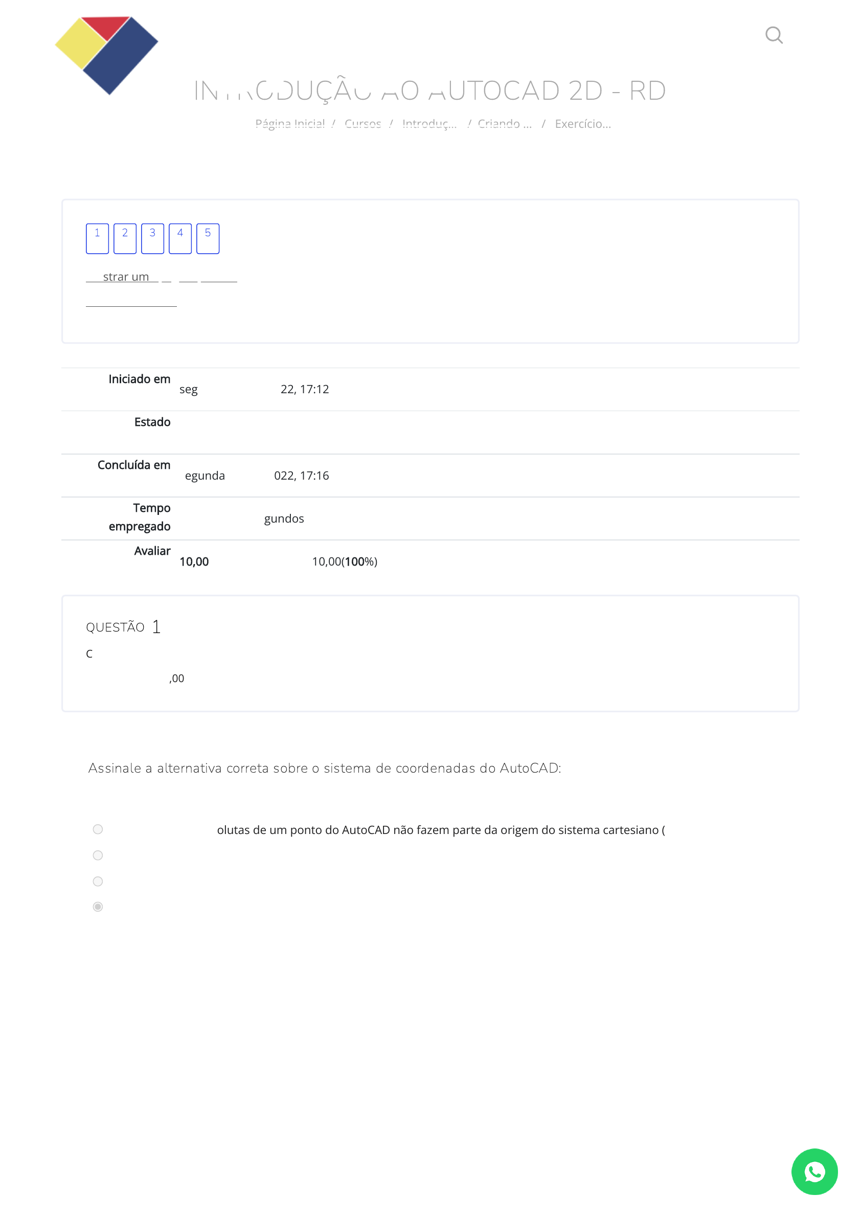 INTRODUÇÃO AO AUTOCAD 2D - RD Página Inicial / Cursos / Introduç… / Criando … / Exercício… Iniciado em segunda, 27 Jun 2022, 17:12 Estado Finalizada Concluída em segunda, 27 Jun 2022, 17:16 Tempo empregado 4 minutos 21 segundos Avaliar 10,00 de um máximo de 10,00(100%) QUESTÃO Correto Atingiu 2,00 de 2,00 Mostrar uma página por vez Terminar revisão 1 2 3 4 5 1 Assinale a alternativa correta sobre o sistema de coordenadas do AutoCAD: Escolha uma opção: a. As coordenas absolutas de um ponto do AutoCAD não fazem parte da origem do sistema cartesiano (X,Y,Z). b. Para determinar um ângulo no AutoCAD utilizamos o símbolo arroba e informamos o valor do ângulo desejado. c. Só podemos trabalhar com coordenadas absolutas no AutoCAD, referentes do eixo cartesiano (X,Y). d. Ao introduzir como coordenadas de um ponto em relação a outro ponto, utilizamos o símbolo arroba (@) A resposta correta é: Ao introduzir como coordenadas de um ponto em relação a outro ponto, utilizamos o símbolo arroba (@) https://cpetead.com.br/ https://cpetead.com.br/course/index.php https://cpetead.com.br/course/view.php?id=1057 https://cpetead.com.br/mod/quiz/view.php?id=18696 https://cpetead.com.br/mod/quiz/review.php?attempt=2463528&cmid=18696&showall=0 https://cpetead.com.br/mod/quiz/view.php?id=18696 https://cpetead.com.br/ https://api.whatsapp.com/send?phone=5511960568891 QUESTÃO Correto Atingiu 2,00 de 2,00 QUESTÃO Correto Atingiu 2,00 de 2,00 2 Sobre a introdução de linhas, assinale todas as alternativas corretas: Escolha uma opção: a. Não é possível introduzir linhas apenas clicando na área de desenho. b. Escolhendo um ponto, é possível determinar a direção da linha e o módulo, utilizando as coordenadas relativas. c. Todas as linhas do AutoCAD têm o mesmo tamanho, mudando apenas a direção da linha. d. As linhas dentro do AutoCAD não podem ser introduzidas utilizando as coordenadas absolutas. A resposta correta é: Escolhendo um ponto, é possível determinar a direção da linha e o módulo, utilizando as coordenadas relativas. 3 Para ativar o comando círculo e informar o valor do diâmetro devemos: Escolha uma opção: a. Digitar “l” e apertar a barra de espaço; em seguida digitar “d” e apertar a barra de espaço. b. Digitar “c” e apertar a barra de espaço; informar o centro do circulo; em seguida digitar “d” e apertar a barra de espaço. c. Digitar “c” e apertar a barra de espaço; em seguida digitar “d” e apertar a barra de espaço. d. Digitar “c” e apertar a barra de espaço; escolher a opção “3P” e apertar a barra de espaço. A resposta correta é: Digitar “c” e apertar a barra de espaço; informar o centro do circulo; em seguida digitar “d” e apertar a barra de espaço. https://api.whatsapp.com/send?phone=5511960568891 QUESTÃO Correto Atingiu 2,00 de 2,00 QUESTÃO Correto Atingiu 2,00 de 2,00 4 Sobre o comando “chamfer” e o “�llet”, assinale a alternativa INCORRETA: Escolha uma opção: a. Ao utilizar o comando “chamfer” o usuário deve informar um valor de raio para o acabamento do chanfro. b. O comando “chamfer” permite criar acabamento em ângulo entre duas linhas e o comando “�llet” gera acabamentos arredondados. c. O atalho de teclado para o comando “�llet” é “f”. d. Ambos os comandos podem ser acessados dentro da ferramenta retângulo e, desta forma, alteram a con�guração padrão do comando. A resposta correta é: Ao utilizar o comando “chamfer” o usuário deve informar um valor de raio para o acabamento do chanfro. 5 Para acessar um determinado comando dentro do AutoCAD o usuário dispõe de: Escolha uma opção: a. Através dos atalhos de teclado, ícones dos menus �utuantes e dos menus posicionados na parte superior da área de trabalho. b. Através dos atalhos de teclado, ícones dos menus �utuantes e dos menus posicionados na parte superior da área de trabalho. Os menus �utuantes são �xos nas laterais da área de trabalho e não podem ser realocados dentro do AutoCAD. c. Unicamente ícones para acessar os comandos. Tais ícones são encontrados nos menu �utuantes. d. Através dos atalhos de teclados e ícones em menus �utuantes. A resposta correta é: Através dos atalhos de teclado, ícones dos menus �utuantes e dos menus posicionados na parte superior da área de trabalho. ◄ Trabalhando com Pontos Precisos Seguir para... Modos de Seleção e Realce - ► Quem somos Cursos Certi�cação Unidades Contato Copyright © 2021 CPET - Centro de Pro�ssionalização e Educação Técnica https://cpetead.com.br/mod/url/view.php?id=41193&forceview=1 https://cpetead.com.br/mod/render/view.php?id=41191&forceview=1 https://www.cpet.com.br/quem-somos-cpet-cursos-tecnicos-a-distancia-ead/ https://www.cpet.com.br/course-cat/cursos/cursos-online/ https://www.cpet.com.br/certificacao-cpet/ https://www.cpet.com.br/unidades-cpet/ https://www.cpet.com.br/contato/ https://www.facebook.com/CPET-Centro-de-Profissionaliza%C3%A7%C3%A3o-e-Educa%C3%A7%C3%A3o-T%C3%A9cnica-1039179026236475/ https://twitter.com/soucpet/ https://www.instagram.com/soucpet/ https://api.whatsapp.com/send?phone=5511960568891