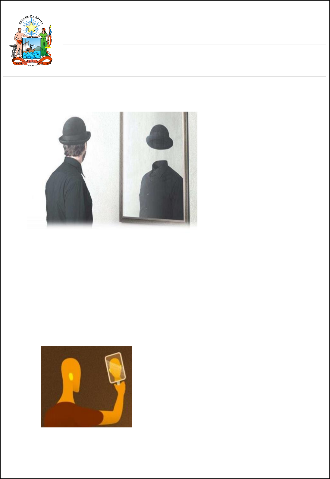 Colégio Estadual Celina Saraiva Aluno(a) Professor(a): Componente Curricular: Série/Turma/Turno: Data: AUTO CONHECIMENTO O autoconhecimento, como a própria palavra diz, é o conhecimento que uma pessoa tem sobre si mesma. É uma investigação individual que busca indicar quais são as características mais marcantes, os gostos, as inclinações, os padrões de comportamento e os sentimentos vivenciados por ela. Esse aspecto pode colaborar com o desenvolvimento da autoconfiança necessária para tomar decisões, planejar nosso futuro e definir objetivos e metas de forma eficiente. Conhecer-se mais e melhor também ajuda no controle das emoções, tanto negativas quanto positivas. Dominá-las é uma forma de evitar problemas de autoestima, ansiedade, frustração e instabilidade emocional, entre outras dificuldades psicológicas. Sendo assim, o autoconhecimento é benéfico tanto no âmbito pessoal quanto no profissional. Por meio dele, é possível efetuar escolhas e tomar decisões que facilitem o cotidiano, além de encontrar o caminho certo a seguir rumo à sua carreira de sucesso. O AUTOCONHECIMENTO, Segundo a psicologia, significa o conhecimento de um indivíduo sobre si mesmo. A prática de se conhecer melhor faz com que uma pessoa tenha controle sobre suas emoções, independentemente de serem positivas ou não. Tal controle emocional provocado pelo autoconhecimento pode evitar sentimentos de baixa autoestima, inquietude, frustração, ansiedade, instabilidade emocional e outros, atuando como importante exercício de bem-estar ocasionando resoluções produtivas e conscientes acerca de seus variados problemas. Toda pessoa possui o refúgio dos seus recursos pessoais, mas esse pode ser acionado de forma a não se desgastar se houver o controle das emoções ou ainda ser utilizado de forma a obter futura recomposição. Ela também consegue permanecer equilibrada em casos de fatores externos como críticas, perda de emprego, término de relacionamento e outros que vulneram o emocional. O conhecimento de si próprio não dá prioridade a opiniões ou respostas e sim estimula seus fatores positivos a detectar os negativos a fim de modifica-los favoravelmente. Desigualdade de poder refere-se ao acesso às oportunidades nos âmbitos econômico, político, educacional ou cultural. Forma-se um círculo vicioso em que a ausência de mulheres nos espaços de liderança e decisão impede que haja melhorias para elas no ambiente corporativo, na esfera pública e no ambiente familiar. Pode-se buscar o autoconhecimento a partir da detecção dos defeitos e qualidades, sendo esses externos (corporais) e internos (emocionais). O equilíbrio entre os fatores internos e externos deve ser buscado para que não haja espaço para manipulação e fragilidade. Também pode haver reflexão de vida, analisando o comportamento obtido até então e as atitudes tomadas para que se consiga detectar maus atos e comportamentos, a fim de que não mais ocorram. Uma pessoa consciente de si mesma e de seus pensamentos consegue identificar suas forças e fraquezas e trabalhar com foco para se desenvolver constantemente. Por isso, na maioria das vezes, buscar o autoconhecimento é o primeiro passo para ter uma vida profissional mais bem-sucedida e saudável. AUTOCONHECIMENTO PESSOAL Autoconhecimento pessoal tem a ver com o quanto você conhece e projeta seus objetivos pessoais. Você quer se casar? Quer ter quantos filhos? Deseja aprender um novo idioma, ou uma nova habilidade? Pretende ter casa e carro? Viajar todo ano? Você prefere focar seus esforços em bens materiais ou deseja uma vida mais leve, com tempo para se divertir, viajar e conhecer novos lugares? O autoconhecimento pessoal vai ajudá-lo, justamente, a entender como seu comportamento, habilidades e emoções podem auxiliá-lo a alcançar os objetivos que você estabelecer para sua vida pessoal. AUTOCONHECIMENTO PROFISSIONAL O autoconhecimento profissional está intimamente ligado à sua carreira e às expectativas que você cria em relação a ela. Você está satisfeito com o emprego que tem atualmente? Como você se imagina daqui há alguns anos? Você quer formar carreira nesta profissão? Você pretende continuar nesta empresa? Está em busca de um aumento ou de uma promoção? Ou será que seu desejo é mudar completamente de rumo? A resposta para essas perguntas é obtida por meio de autoconhecimento profissional. TEXTO COMPLEMENTAR “Ó homem conhece-te a ti mesmo e conhecerás o universo e os deuses.” A citação acima teve origem na Grécia antiga e é de autoria de ninguém mais, ninguém menos que Sócrates, talvez o mais famoso dos grandes filósofos atenienses. Mas como ela ajuda a explicar o que é autoconhecimento? O autoconhecimento é a busca dos homens, em seu próprio interior, por respostas e entendimento para várias questões sobre si mesmo e sobre a vida, e o objetivo é evoluir a partir destas percepções. Ao mesmo tempo, o autoconhecimento é a capacidade que nos permite perceber e agir de forma gradativa sobre tudo aquilo que necessitamos transformar em nós mesmos. Na sociedade atual, ter uma maior percepção sobre si mesmo através do autoconhecimento é o que nos permite alterar nossas crenças erradas, tudo aquilo que nos faz mal e nos causa conflitos internos e que atrapalha diversas áreas da nossa vida. Através do autoconhecimento é que se consegue ampliar a consciência sobre os potenciais adormecidos, reconhecendo nossos próprios defeitos e colocando foco em nossas qualidades e naquilo que realmente somos. Por isso é preciso praticar o caminho de autoconhecimento, pois é apenas a partir dele que se consegue criar uma identidade própria e se diferenciar dos demais. Algumas considerações sobre o que é autoconhecimento... Na opinião da psicóloga e especialista Juliana Bento, “quem conhece a si mesmo tende a valorizar mais a própria vida e aumentar nossa autoestima, obtendo estabilidade emocional”.