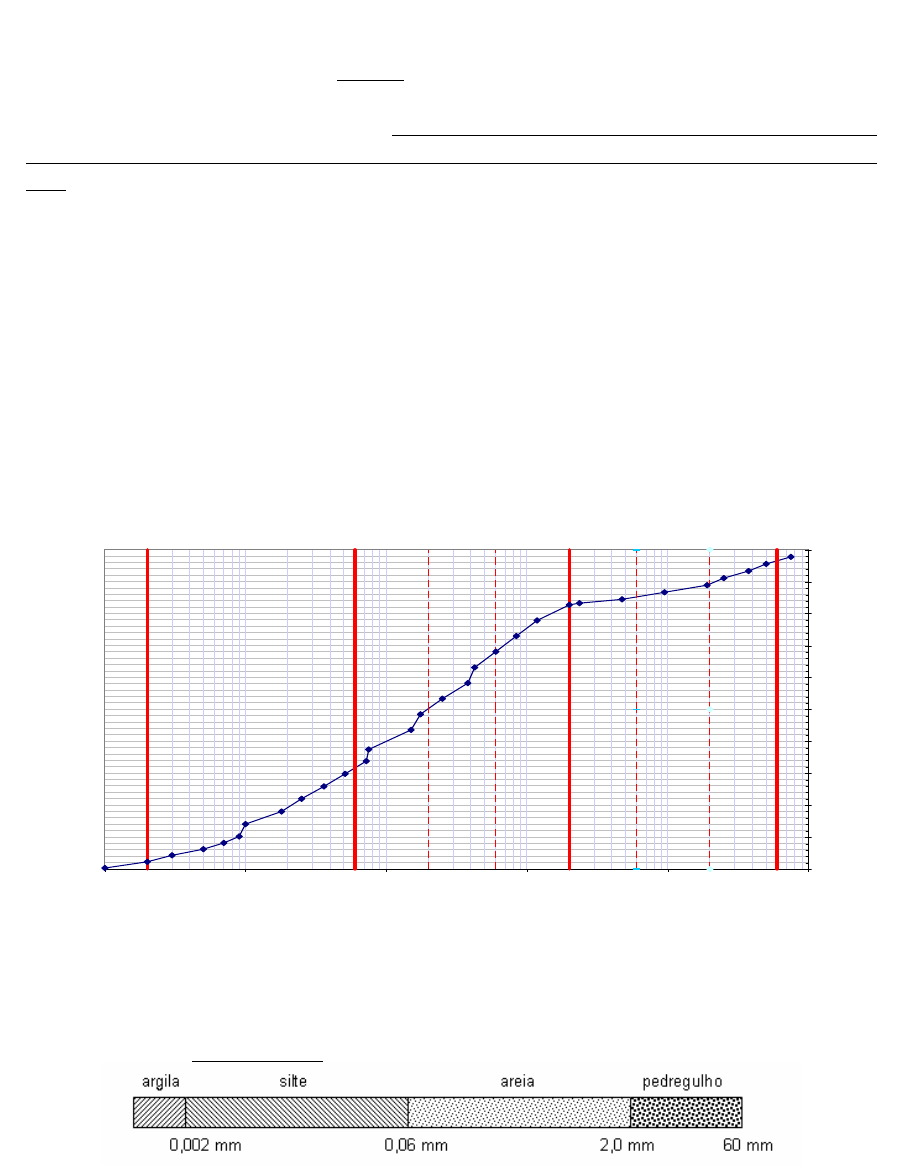 93 Capítulo 8 - TEXTURA e ANÁLISE GRANULOMÉTRICA Embora a NBR 6502 defina textura como “conjunto de características de forma, dimensão e arranjo dos elementos mineralógicos constituintes do solo”, neste texto consideraremos TEXTURA como a relação entre as dimensões das partículas de um solo e as proporções relativas com que as partículas com essas dimensões ocorrem no solo. A medida da textura é feita pela análise granulométrica. ANÁLISE GRANULOMÉTRICA OBJETIVO DA ANÁLISE: Obter as coordenadas que permitam traçar a curva granulométrica. CURVA GRANULOMÉTRICA é o gráfico semilogarítmico, cujos pontos representam: em ordenadas, em porcentagem, a massa dos grãos ou partículas de dimensões inferiores às indicadas, por seus logaritmos, nas abscissas. A escala das ordenadas é crescente, de baixo para cima e a das abscissas cresce a partir da esquerda. Neste texto, utilizaremos a escala granulométrica adotada pela ABNT 6502/95 na nomenclatura das partículas. Atenção: são utilizados os mesmos termos (argila, silte, areia) para partículas em certa faixa de tamanhos e para solos que tem seu comportamento dominante devido à presença (atuante) destas partículas. Isto é motivo de confusão inicial para iniciantes nesta ciência. A curva granulométrica permite distinguir tipos de textura diferentes: na figura 9.1 é identificado um solo bem graduado, com distribuição contínua. Nas figuras 9.2 a 9.4, outros tipos de textura são apresentados como exemplos. CURVA GRANULOM ÉTRICA 0,00% 10,00% 20,00% 30,00% 40,00% 50,00% 60,00% 70,00% 80,00% 90,00% 100,00% 0,001 0,01 0,1 1 10 100 Diâm etro dos grãos (mm ) % p as sa nt e ARGILA SILTE AREIA Fina Média Grossa PEDREGULHO Fino Médio G rosso 0,06 60,42 2,0 600,002 20 Fig. 9.1: Curva granulométrica (exemplo) 94 Obs: A classificação granulométrica de um de solo deve ser feita pelo comportamento do solo, não pela predominância de grãos de um determinado tamanho. Para auxiliar a identificação das características de uniformidade e graduação dos solos, são definidos os seguintes índices, obtidos diretamente do gráfico (ver figura 9.5): DIÂMETRO EFETIVO (D10 ou De): É o diâmetro correspondente a 10% em peso total de todas as partículas menores que ele. O valor de D10 fornece uma das informações necessárias para o cálculo da permeabilidade, utilizado no dimensionamento de filtros e drenos. D30 e D60: diâmetros correspondentes a 30% e 60% em peso total das partículas menores que eles. CURVA GRANULOMÉTRICA 0,00% 10,00% 20,00% 30,00% 40,00% 50,00% 60,00% 70,00% 80,00% 90,00% 100,00% 0,001 0,01 0,1 1 10 100 Diâmetro dos grãos (mm) % p as sa nt e ARGILA SILTE AREIA Fina Média Grossa PEDREGULHO Fino Médio Grosso 0,06 60,42 2,0 600,002 20 Fig. 9.2: Areia bem graduada CURVA GRANULOMÉTRICA 0,00% 10,00% 20,00% 30,00% 40,00% 50,00% 60,00% 70,00% 80,00% 90,00% 100,00% 0,001 0,01 0,1 1 10 100 Diâmetro dos grãos (mm) % p as sa nt e ARGILA SILTE AREIA Fina Média Grossa PEDREGULHO Fino Médio Grosso 0,06 60,42 2,0 600,002 20 Fig. 9.3: Solo desuniforme, graduação aberta CURVA GRANULOMÉTRICA 0,00% 10,00% 20,00% 30,00% 40,00% 50,00% 60,00% 70,00% 80,00% 90,00% 100,00% 0,001 0,01 0,1 1 10 100 Diâmetro dos grãos (mm) % p as sa nt e ARGILA SILTE AREIA Fina Média Grossa PEDREGULHO Fino Médio Grosso 0,06 60,42 2,0 600,002 20 Fig. 9.4: Solo muito uniforme (areia grossa) CURVA GRANULOMÉTRICA 0,00% 10,00% 20,00% 30,00% 40,00% 50,00% 60,00% 70,00% 80,00% 90,00% 100,00% 0,001 0,01 0,1 1 10 100 Diâmetro dos grãos (mm) % p as sa nt e ARGILA SILTE AREIA Fina Média Grossa PEDREGULHO Fino Médio Grosso 62,0 600,002 20D10 D30 D60 FIG 9.5: como se obtém D10, D30 e D60. 95 GRAU DE UNIFORMIDADE (U): O grau de uniformidade indica a falta de uniformidade, sendo tanto menor quanto mais uniforme for o solo. (Milton Vargas prefere chamá-lo grau de desuniformidade, e simbolizá-lo por D) U = D60 / D10 Quanto menor, maior é a inclinação da curva granulométrica, e o solo é melhor graduado, segundo a seguinte classificação: U < 5 muito uniforme 5 < U < 15 uniformidade média U > 15 desuniforme Alguns autores consideram solos uniformes os que têm grau de uniformidade menor que 3, e desuniformes os que têm U>3. COEFICIENTE DE CURVATURA (CC): CC = (D 30) 2 / (D 10 . D 60) Solos bem graduados têm 1 < CC < 3. DETERMINAÇÃO DA COMPOSIÇÃO GRANULOMÉTRICA O processo de determinação da composição granulométrica de um solo envolve três fases: 1. Obter uma amostra representativa; 2. Obter a dispersão das partículas da amostra de forma a conseguir a individualização das suas partículas; 3. Determinar a porcentagem das partículas com dimensões entre limites determinados. Neste texto, é pressuposto que uma amostra de tamanho suficiente para a execução da análise granulométrica foi corretamente colhida no campo e foi preparada conforme as especificações da NBR6457 para os ensaios de caracterização (secagem ao ar, destorroamento). Após ser feita sua homogeneização dela é retirada quantidade suficiente para a execução dos diversos ensaios de caracterização. Um desses ensaios é a análise granulométrica, e o tamanho da amostra para este ensaio será detalhado mais adiante. A análise granulométrica de solos pode ser realizada por peneiramento ou por uma combinação de peneiramento e sedimentação. NORMAS PARA CONSULTA NBR 7181 – Ensaio de Granulometria NBR 5734 – Especificação de peneiras para ensaio NBR 6457 – Preparação de amostras de solo para ensaio normal de compactação e ensaios de caracterização NBR 6508 - Grãos de solos que passam na peneira de 4,8 mm - Determinação da massa específica – Método de ensaio 96 Piceta ou bisnaga APARELHAGEM PARA O ENSAIO DE GRANULOMETRIA: 1. Estufa capaz de manter a temperatura entre 60o C e 65o C e entre 105oC e 110oC; 2. Balanças que permitam pesar nominalmente 200 g, 1,5 kg, 5 kg e 10 kg, com resoluções de 0,01g, 0,1g, 0,5g